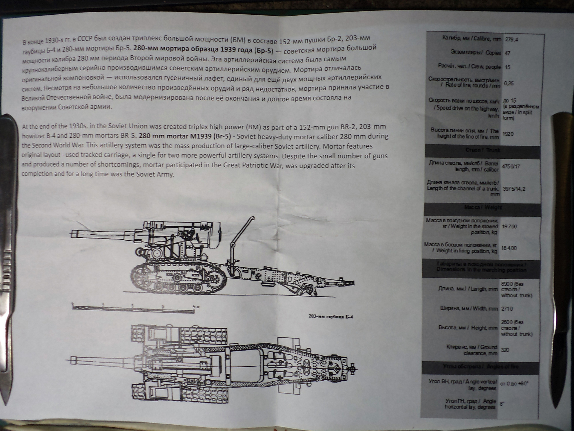 Советская мортира большой мощности периода Второй мировой войны. Эта артиллерийская система была самым крупнокалиберным серийно производившимся советским артиллерийским орудием. Мортира отличалась оригинальной компоновкой - использовался гусеничный лафет, единый для еще двух мощных артиллерийских систем, составлявших так называемый "артиллерийский триплекс большой мощности" - 152мм пушки образца 1935 года (Бр-2) и 203-мм гаубицы образца 1931 года (Б-4). Несмотря на небольшое количество произведенных орудий и ряд недостатков, мортира приняла участие в Великой Отечественной войне, была модернизирована после ее окончания и долгое время состояла на вооружении Советской армии.