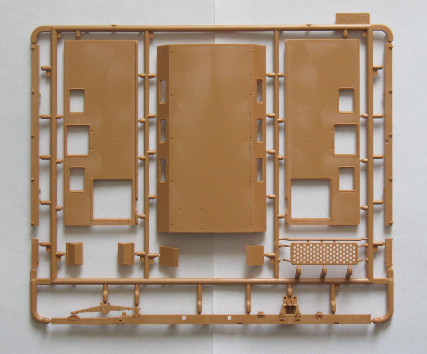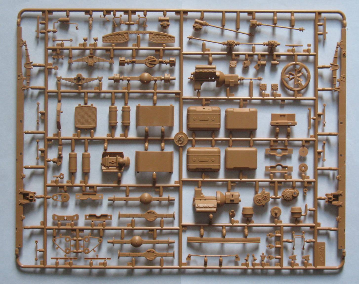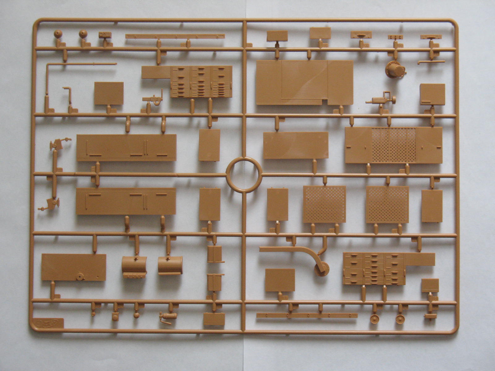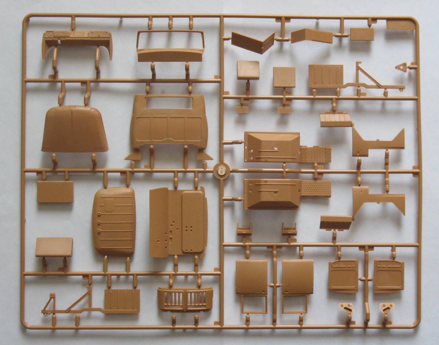 Детали базового шасси представлены рамками модели бортового ЗиЛ-131 (кат.номер 35515), поэтому подробно на них останавливаться не буду. К сожалению, все недостатки этой модели, уже многократно описанные, перекочевали и в последующие наборы на ее основе. Отмечу только, что производитель кладет в комплект с фургонами дополнительные удлиненные лонжероны рамы, в результате использования которых задняя поперечина с фаркопом, в оригинале несколько «утопленная» относительно подкузовных ящиков, в модели оказывается вровень с ними. Реальные же мастерские монтировали на шасси со стандартной длиной рамы.