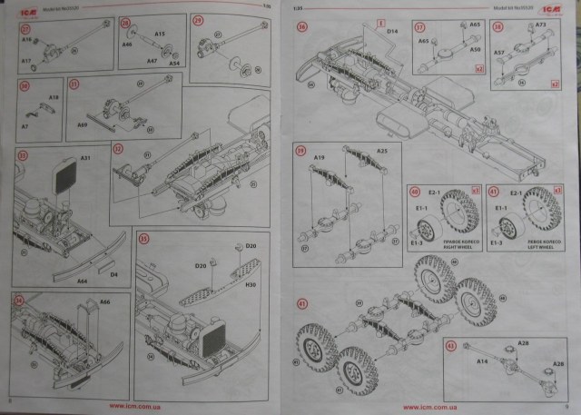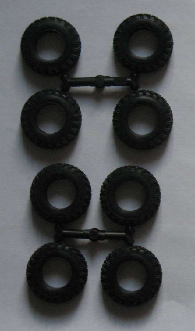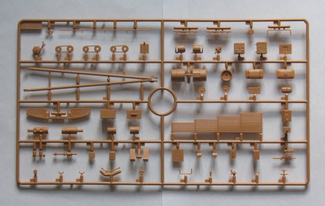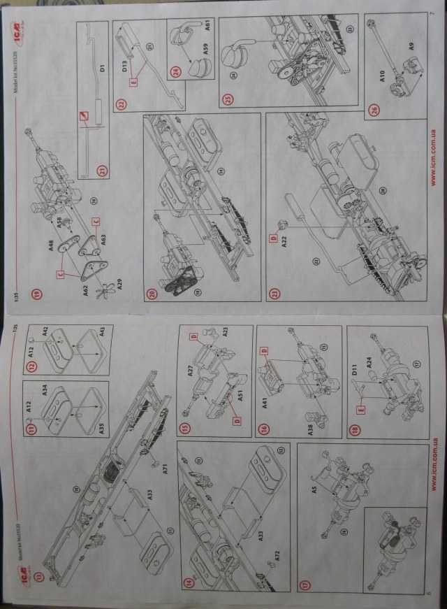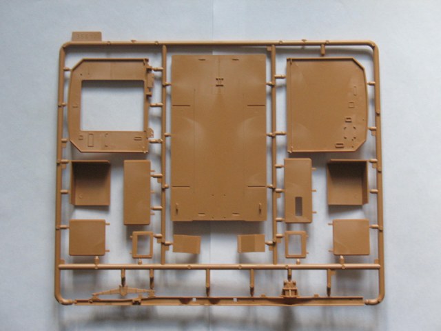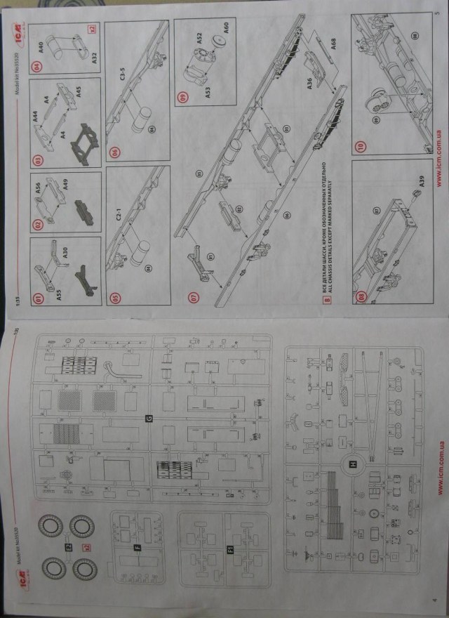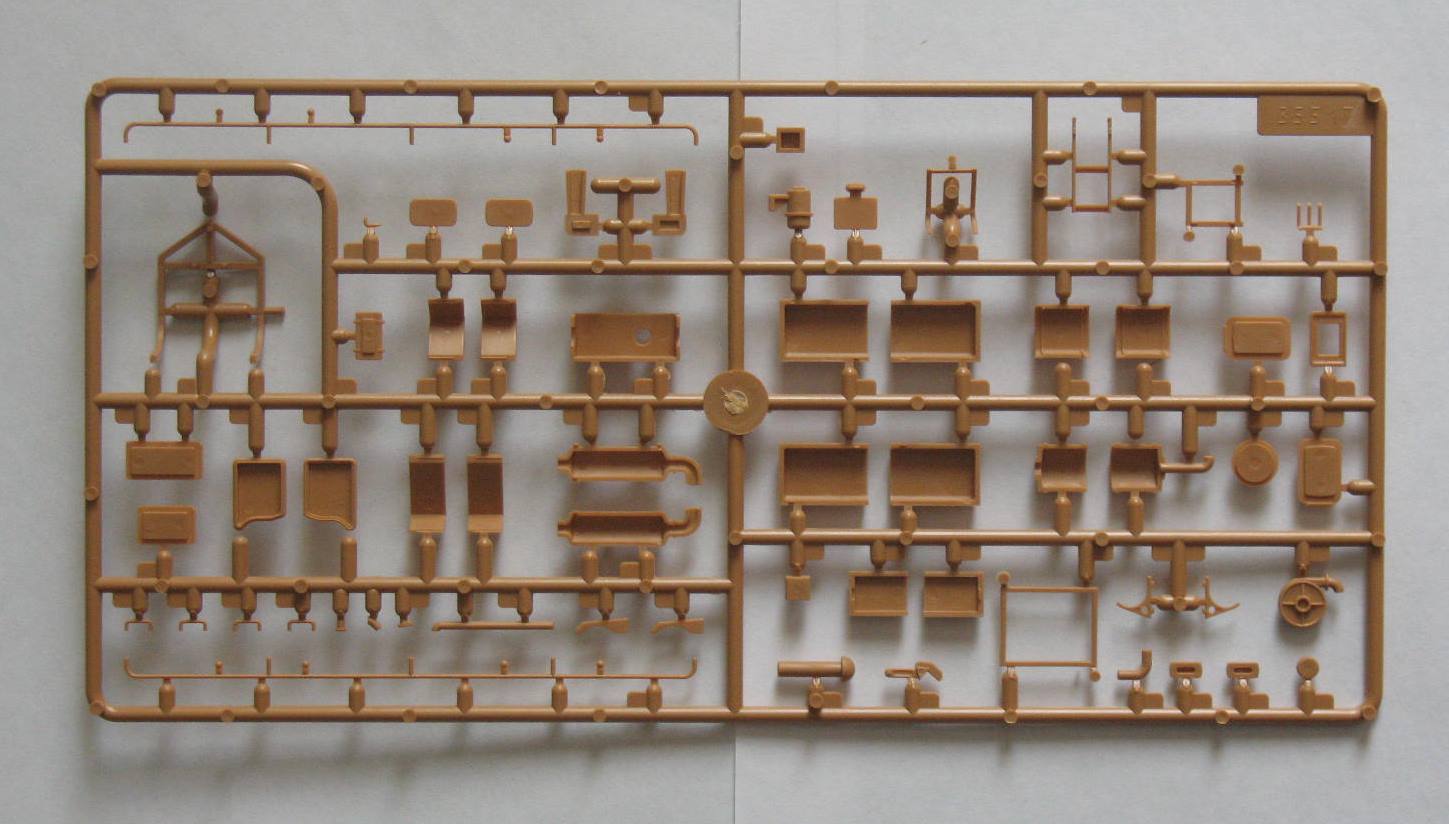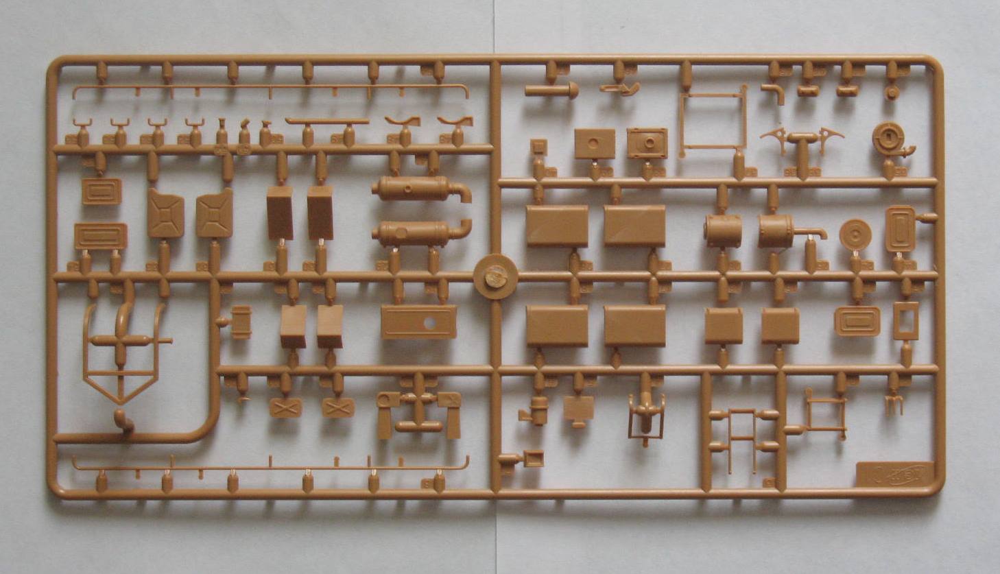 Детали базового шасси представлены рамками модели бортового ЗиЛ-131 (кат.номер 35515), поэтому подробно на них останавливаться не буду. К сожалению, все недостатки этой модели, уже многократно описанные, перекочевали и в последующие наборы на ее основе. Отмечу только, что производитель кладет в комплект с фургонами дополнительные удлиненные лонжероны рамы, в результате использования которых задняя поперечина с фаркопом, в оригинале несколько «утопленная» относительно подкузовных ящиков, в модели оказывается вровень с ними. Реальные же мастерские монтировали на шасси со стандартной длиной рамы.