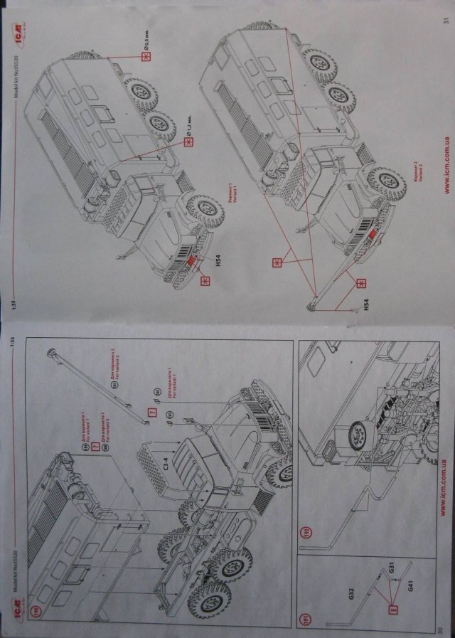 Из наружного оборудования представлены фильтровентиляционная и отопительная установки, входная лестница-трап, настил и поручни на крыше, коробки розеток наружного электропитания, а также кран-стрела с возможностью установки как в походном (на крыше), так и в рабочем (на бампере) положении, для чего есть все необходимые крепления. То же можно проделать с входным трапом, приклеив его на упоры под дверью или убрав в направляющие под кузовом. Под кронштейны стрелы дана новая площадка бампера с посадочными местами для их установки (хотя и все с тем же утрированным рисунком рифления). Наконец-то лебедка получила штатный крюк, хотя ее трос по-прежнему надо изготовить самостоятельно. Также самому придется изготавливать оттяжки стрелы с элементами их крепления. К сожалению, отсутствует весьма приметный ящик на крыше для укладки части моечного оборудования (хотя на боксарте он нарисован), характерный для этой модификации мастерской, и удлинитель выхлопной трубы. Впрочем, он применялся только при работе мастерской в полевых укрытиях, а обычно его возили (если брали с собой) под кузовом, в специальных креплениях.