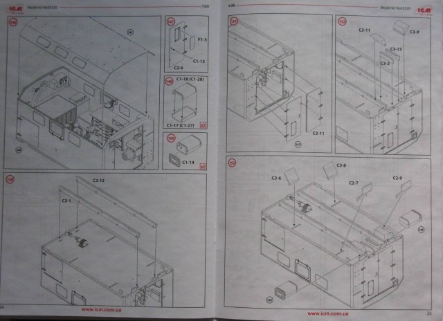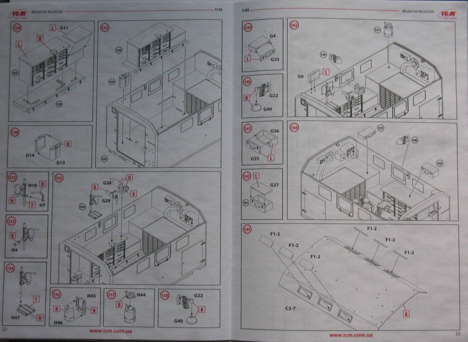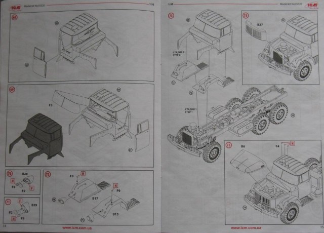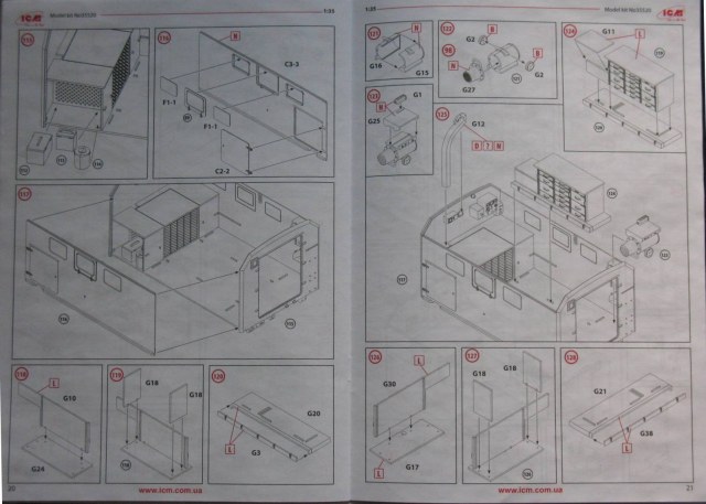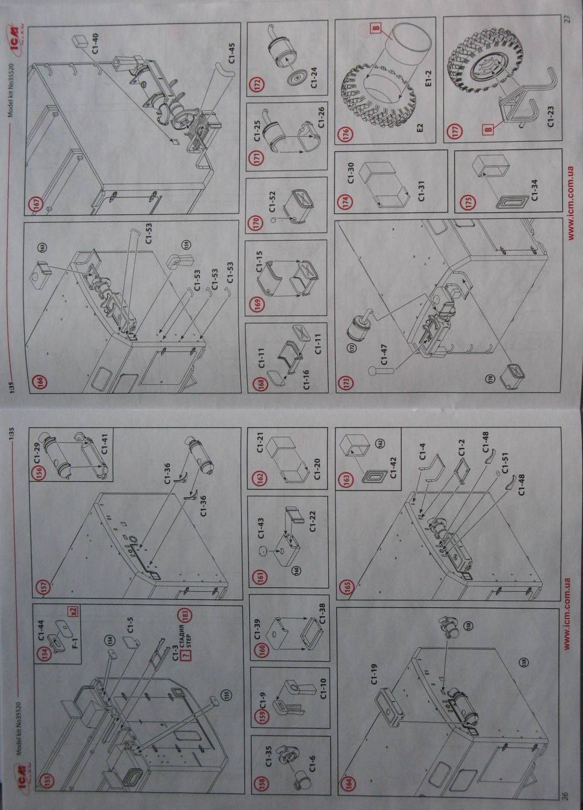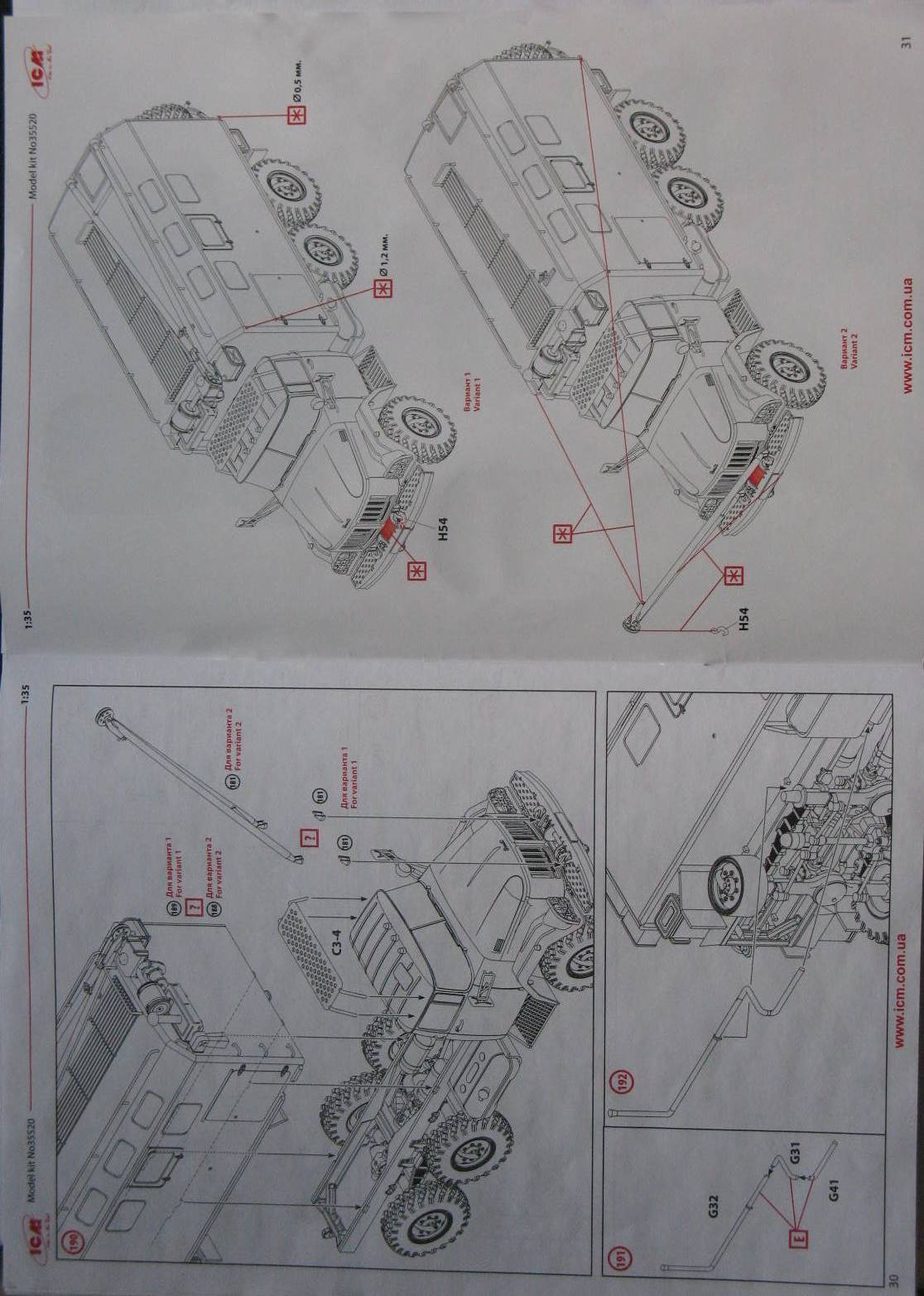 Кузов-фургон в основе также использован от модели ЗиЛ-131 КШМ (кат.номер 35517) и интересен дополнением в виде различного внутреннего и наружного оборудования.Размеры кузова, как наружные габаритные, так и расположения основных элементов, выдержаны строго в масштабе. В интерьере представлены верстаки с шлифовальной и сверлильной машинками, ящики с инструментом и приспособлениями, сварочный преобразователь и даже детализированная мотопомпа для мойки техники, скрытая в одном из боковых отсеков кузова. Генератор питания электрооборудования мастерской снабжен механизмом привода от трансмиссии машины–коробкой отбора мощности, дополнительным карданным валом и ременной передачей. При склейке кузова надо учитывать, чтодля пропуска имитации приводных ремнейв кузов необходимо прорезать отверстие в его полу. Инструкция этот момент обходит, хотя контур отверстияв пластике предусмотрительно намечен.Кстати, пол кузова сделан гладким, без вырезов надколесных ниш, хотя сами ниши и присутствуют в виде «постаментов» под верстаки. Отсек генератора огражден с трех сторон решетчатыми панелями, через которые его можно как-то рассмотреть, хотя «в жизни» это ограждение для лучшей вентиляции было сделано из более «прозрачной» сетки-рабицы. Несмотря на то, что люки боковых ниш, окна и задняя дверь кузова сделаны отдельными деталями, возможность сделать их открытыми скорее теоретическая: их петли сделаны заедино с ними и для «открывания» требуют применения комплектов фототравления.