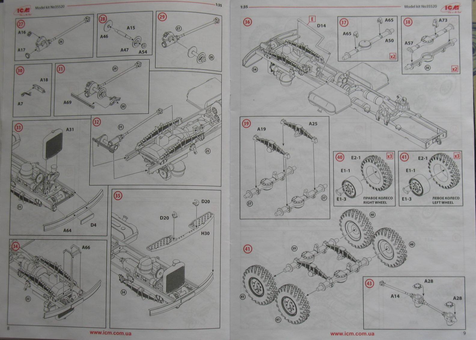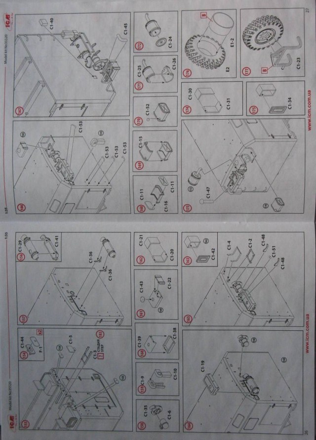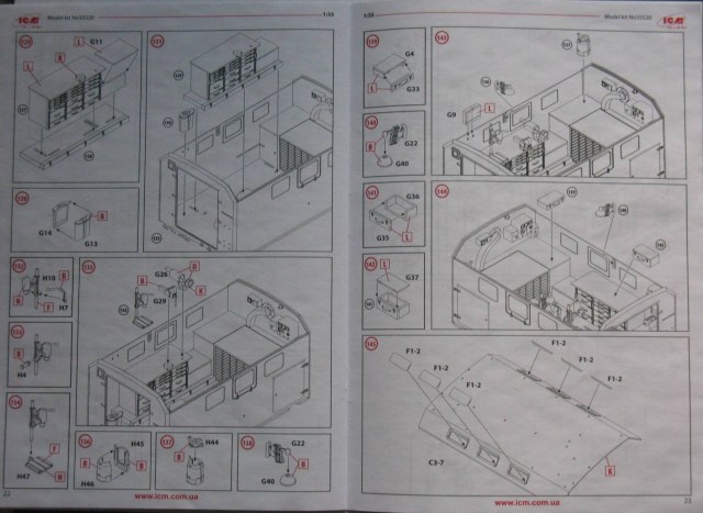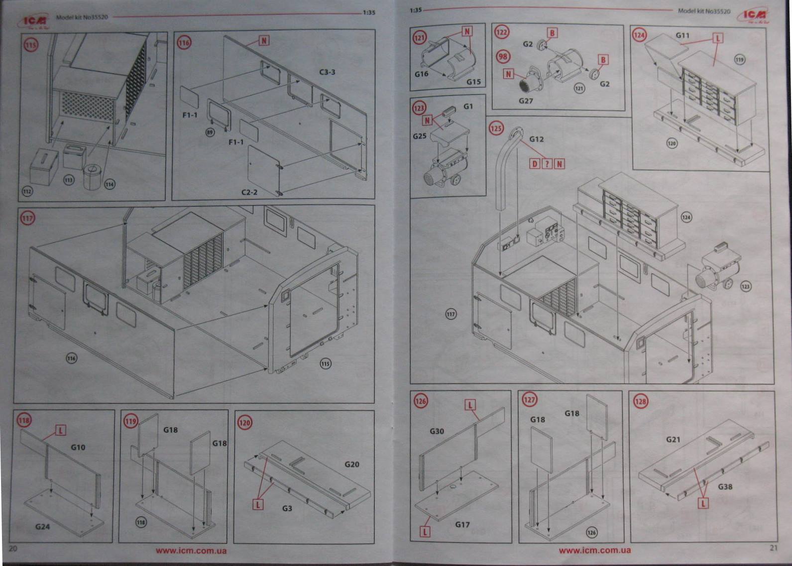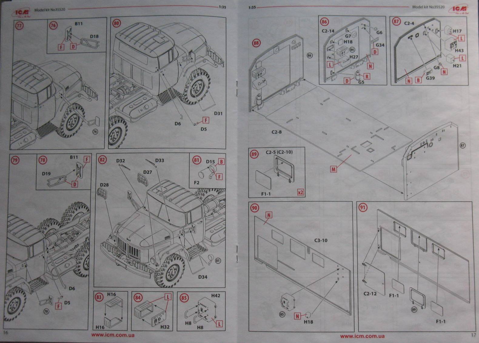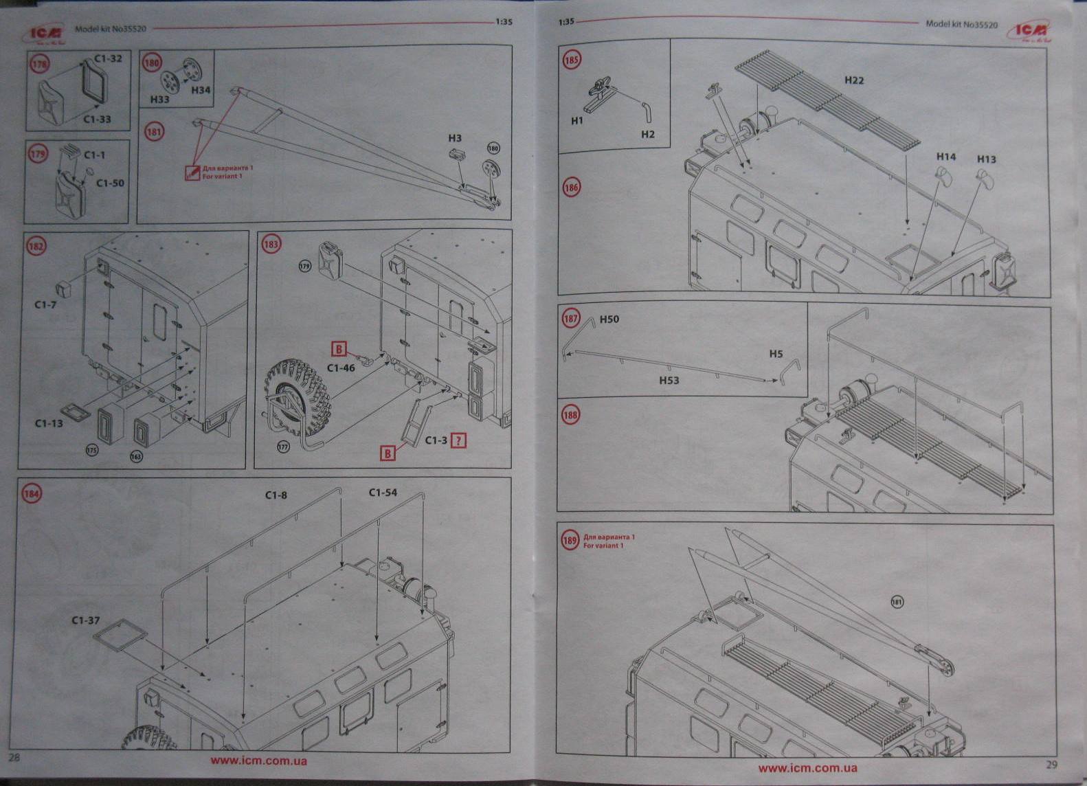 Кузов-фургон в основе также использован от модели ЗиЛ-131 КШМ (кат.номер 35517) и интересен дополнением в виде различного внутреннего и наружного оборудования.Размеры кузова, как наружные габаритные, так и расположения основных элементов, выдержаны строго в масштабе. В интерьере представлены верстаки с шлифовальной и сверлильной машинками, ящики с инструментом и приспособлениями, сварочный преобразователь и даже детализированная мотопомпа для мойки техники, скрытая в одном из боковых отсеков кузова. Генератор питания электрооборудования мастерской снабжен механизмом привода от трансмиссии машины–коробкой отбора мощности, дополнительным карданным валом и ременной передачей. При склейке кузова надо учитывать, чтодля пропуска имитации приводных ремнейв кузов необходимо прорезать отверстие в его полу. Инструкция этот момент обходит, хотя контур отверстияв пластике предусмотрительно намечен.Кстати, пол кузова сделан гладким, без вырезов надколесных ниш, хотя сами ниши и присутствуют в виде «постаментов» под верстаки. Отсек генератора огражден с трех сторон решетчатыми панелями, через которые его можно как-то рассмотреть, хотя «в жизни» это ограждение для лучшей вентиляции было сделано из более «прозрачной» сетки-рабицы. Несмотря на то, что люки боковых ниш, окна и задняя дверь кузова сделаны отдельными деталями, возможность сделать их открытыми скорее теоретическая: их петли сделаны заедино с ними и для «открывания» требуют применения комплектов фототравления.