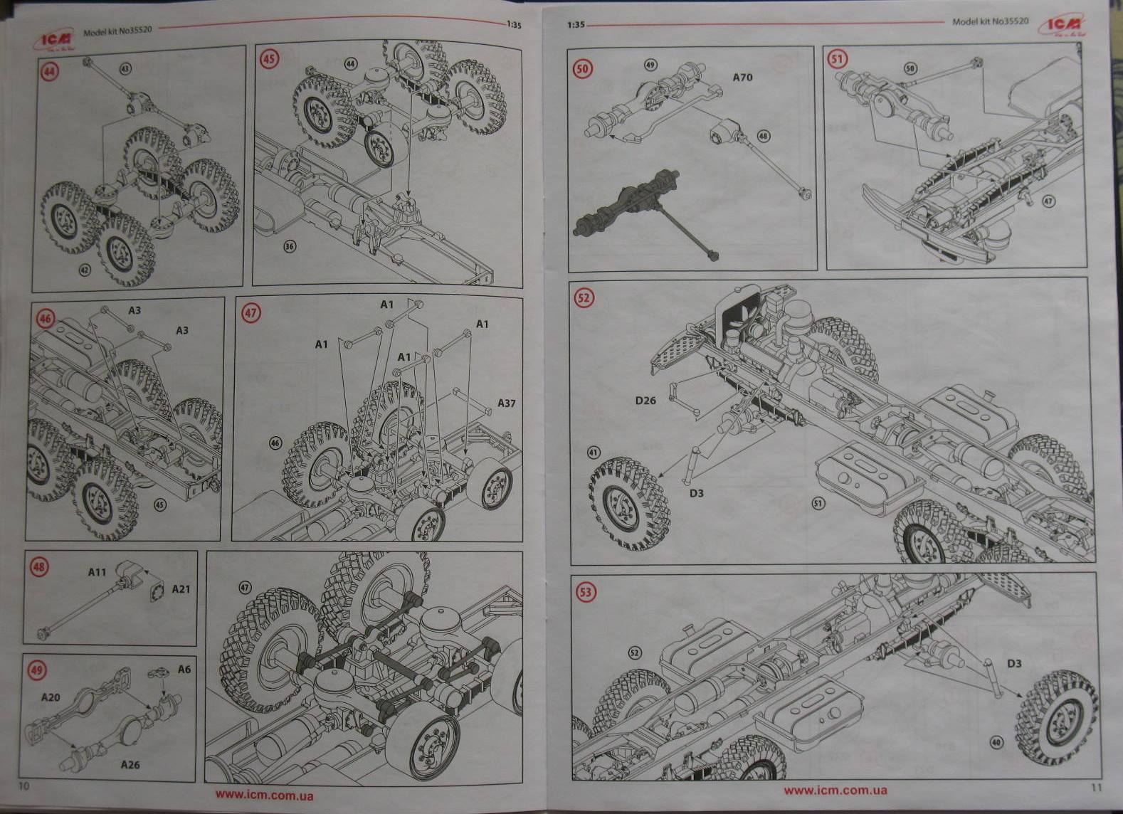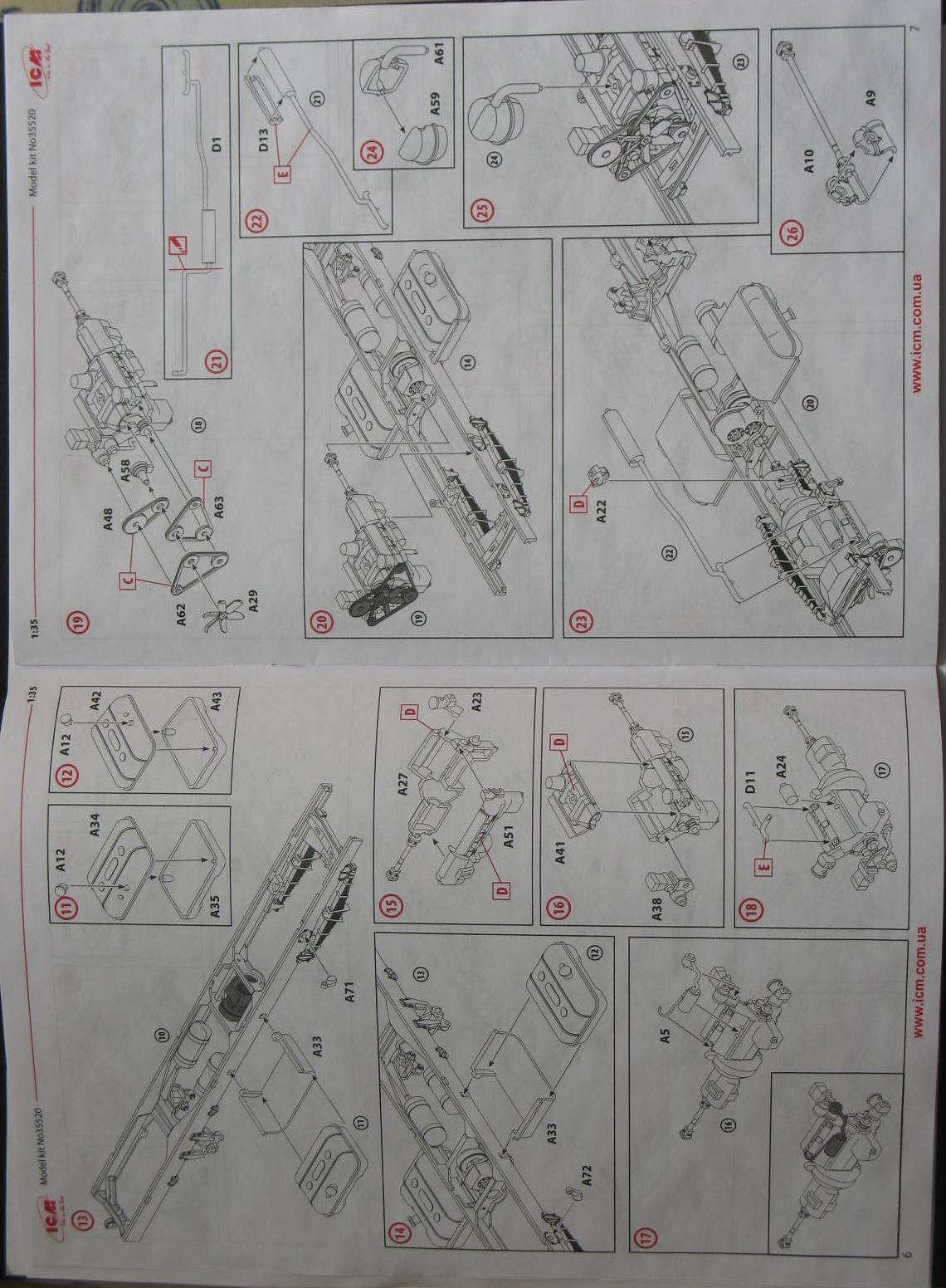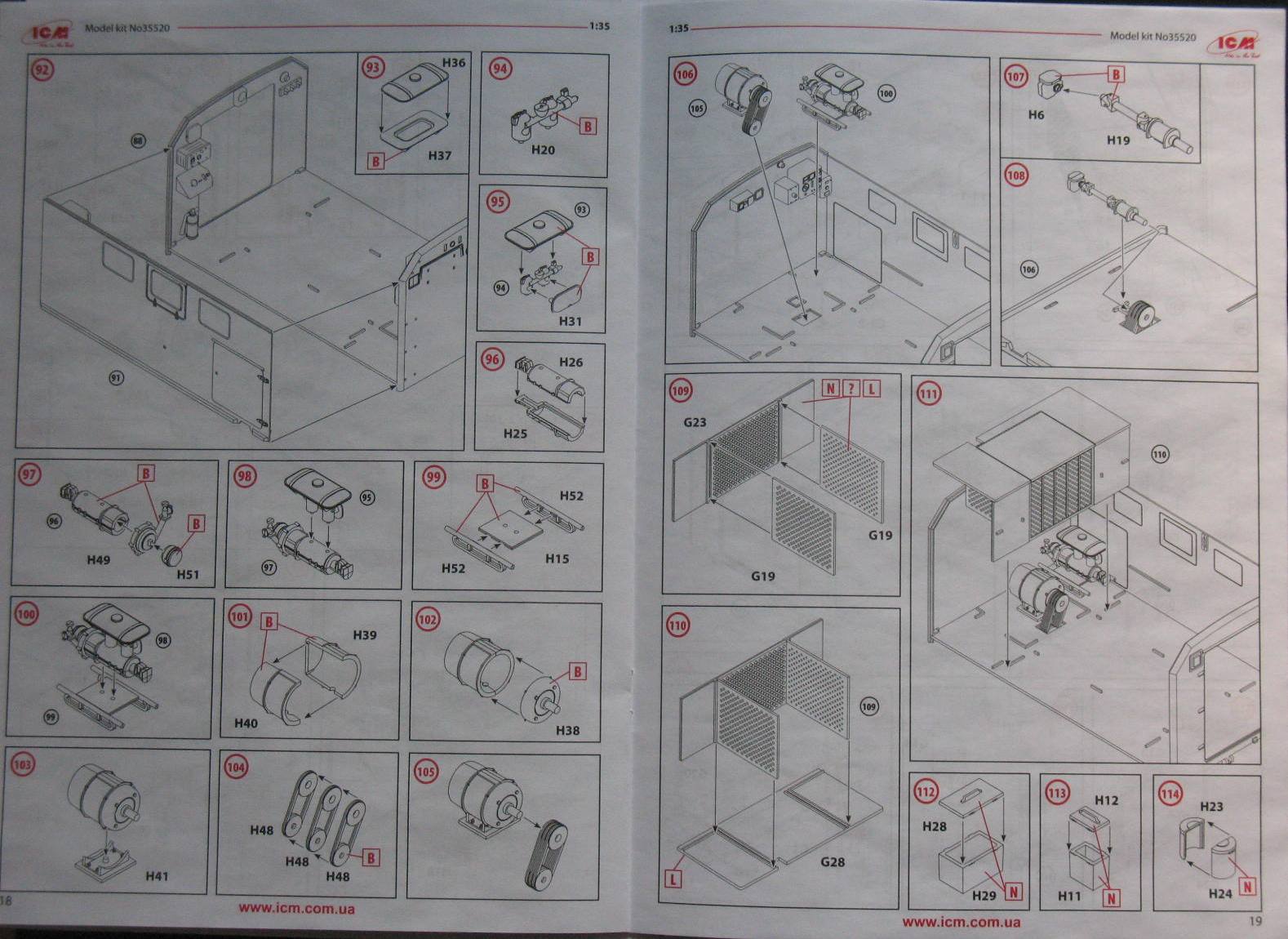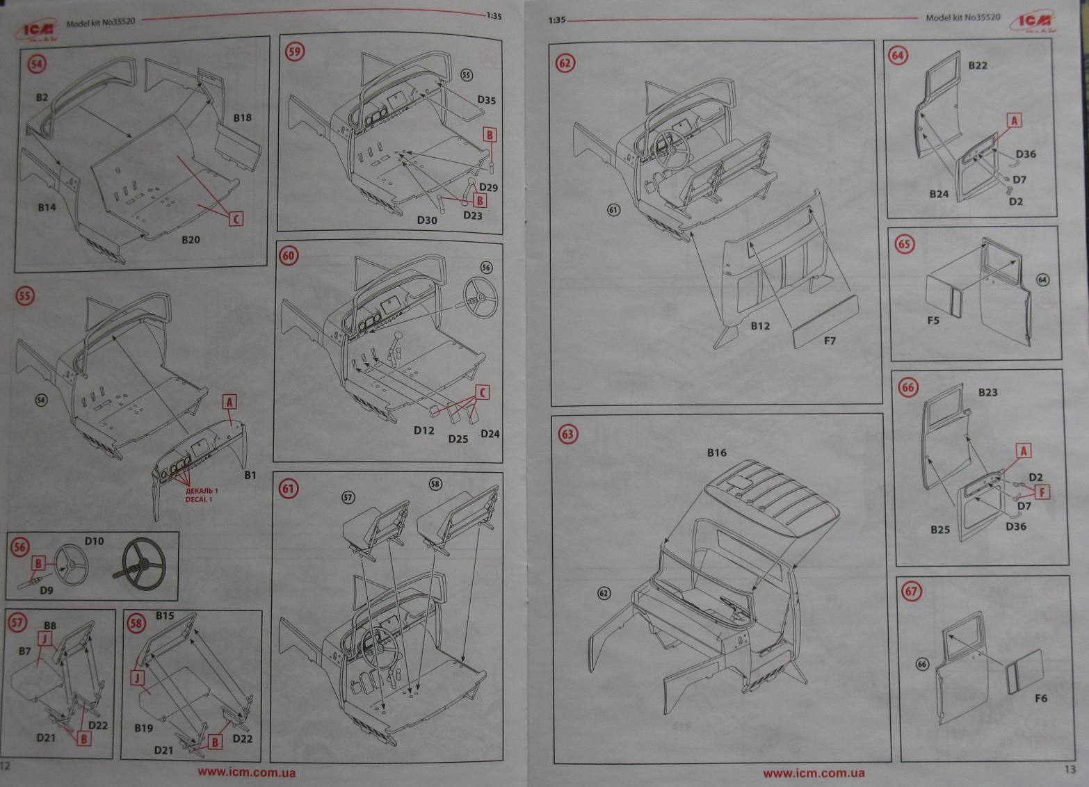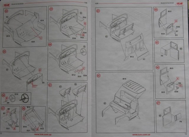 Кузов-фургон в основе также использован от модели ЗиЛ-131 КШМ (кат.номер 35517) и интересен дополнением в виде различного внутреннего и наружного оборудования.Размеры кузова, как наружные габаритные, так и расположения основных элементов, выдержаны строго в масштабе. В интерьере представлены верстаки с шлифовальной и сверлильной машинками, ящики с инструментом и приспособлениями, сварочный преобразователь и даже детализированная мотопомпа для мойки техники, скрытая в одном из боковых отсеков кузова. Генератор питания электрооборудования мастерской снабжен механизмом привода от трансмиссии машины–коробкой отбора мощности, дополнительным карданным валом и ременной передачей. При склейке кузова надо учитывать, чтодля пропуска имитации приводных ремнейв кузов необходимо прорезать отверстие в его полу. Инструкция этот момент обходит, хотя контур отверстияв пластике предусмотрительно намечен.Кстати, пол кузова сделан гладким, без вырезов надколесных ниш, хотя сами ниши и присутствуют в виде «постаментов» под верстаки. Отсек генератора огражден с трех сторон решетчатыми панелями, через которые его можно как-то рассмотреть, хотя «в жизни» это ограждение для лучшей вентиляции было сделано из более «прозрачной» сетки-рабицы. Несмотря на то, что люки боковых ниш, окна и задняя дверь кузова сделаны отдельными деталями, возможность сделать их открытыми скорее теоретическая: их петли сделаны заедино с ними и для «открывания» требуют применения комплектов фототравления.