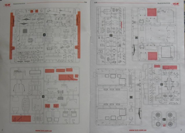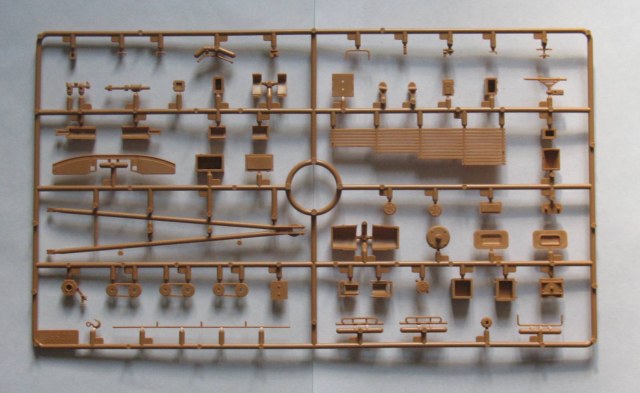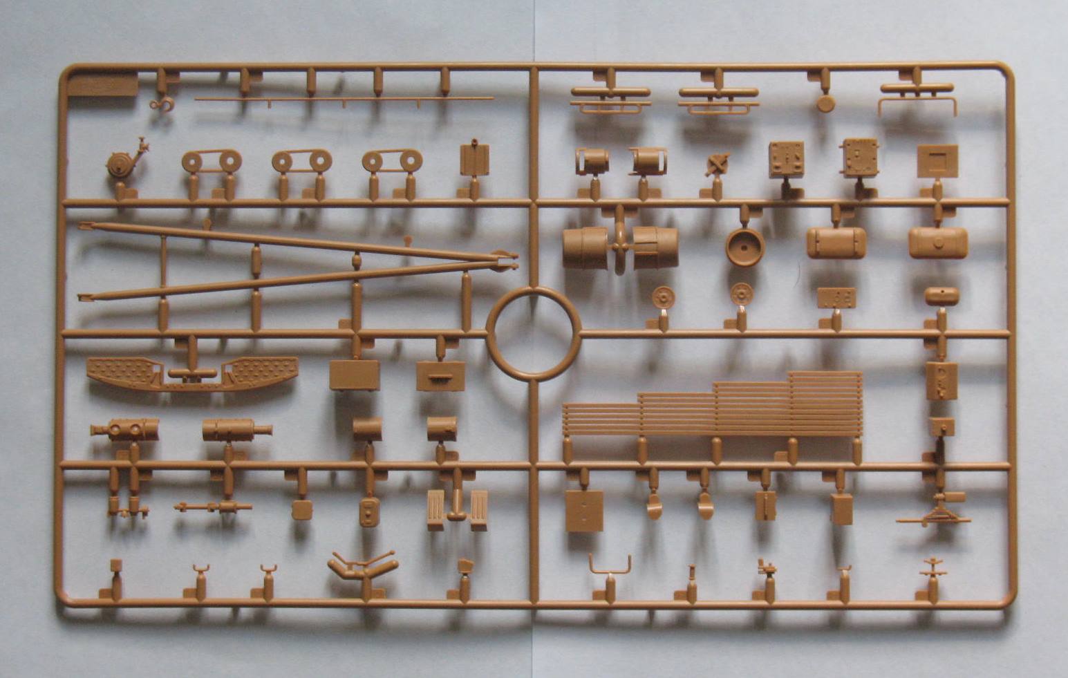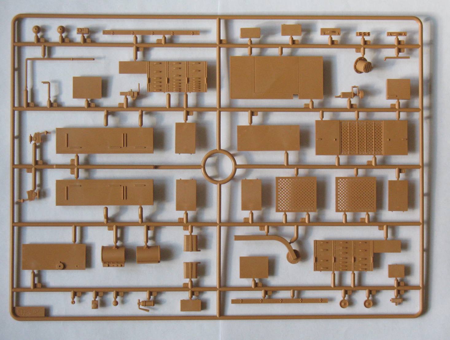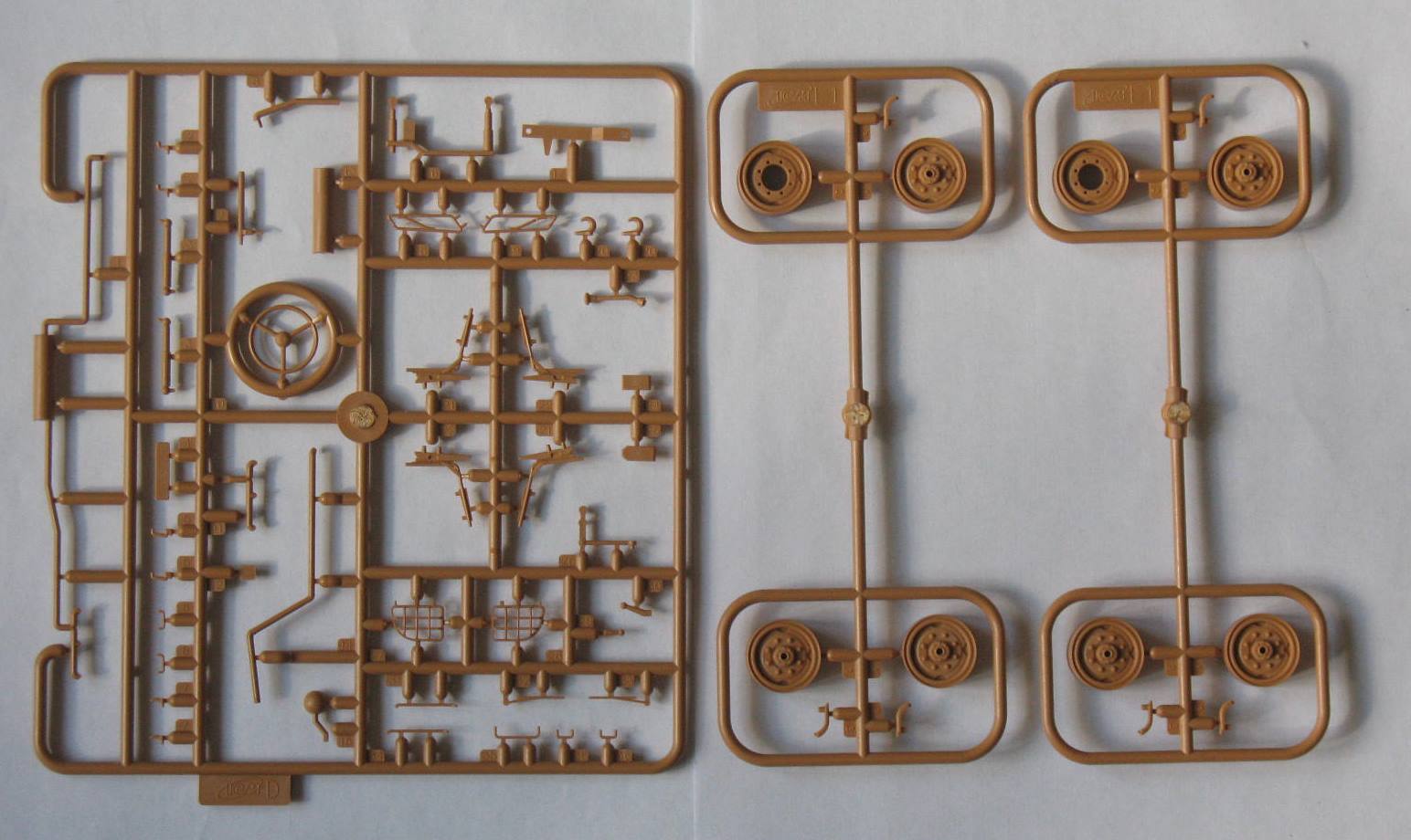 Набор упакован в ставшую уже привычной для моделей ICM коробку из плотного картона с верхней загрузкой, на которую надевается крышка с красочным боксартом. Причем жесткость коробки совсем не лишняя: литники заполняют практически весь ее объем, оставшийся неизменным от базовой модели ЗиЛ-131 (а вот деталей существенно прибавилось). Всего в наборе 12 литниковых рамок из пластика темно-песочного цвета: 6 для базового шасси и 6 для кузова-фургона, а также 8 колес из резиноподобного материала, типичного для этого производителя. В том числе 2 рамки из прозрачного материала со светотехникой и стеклами кабины и кузова.