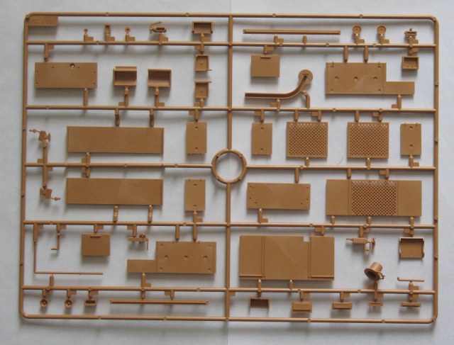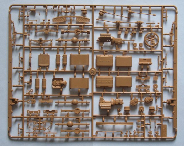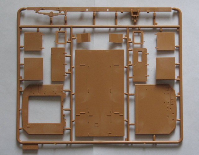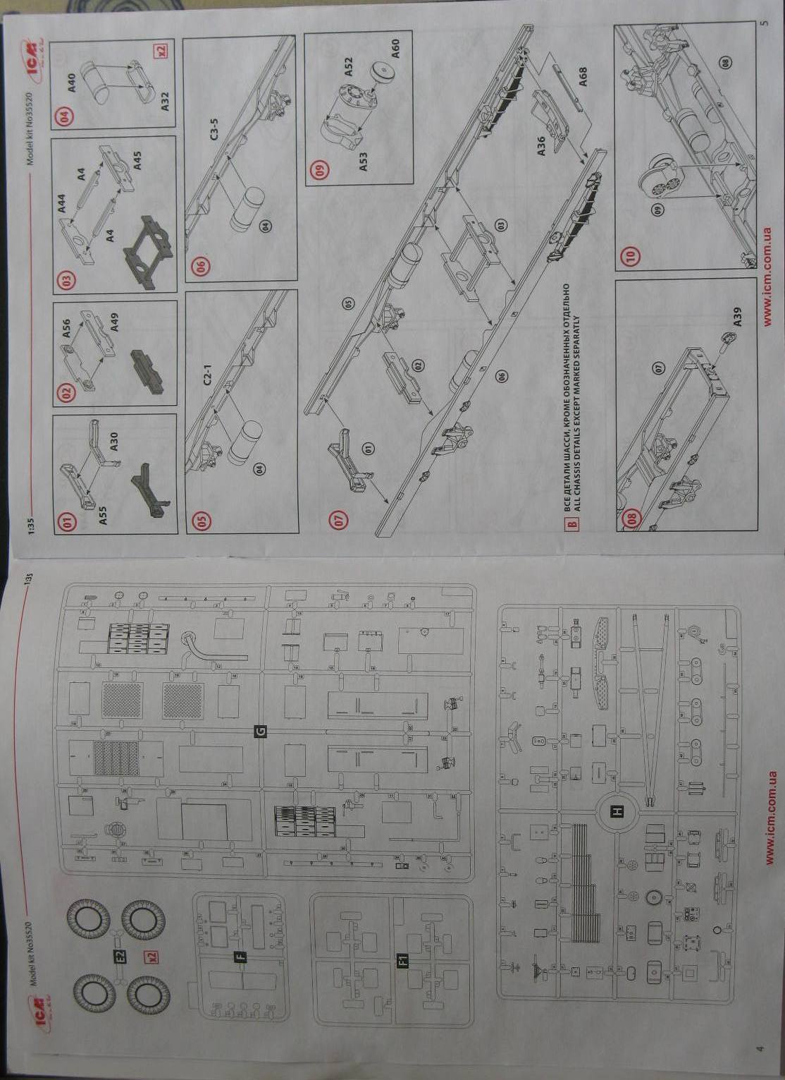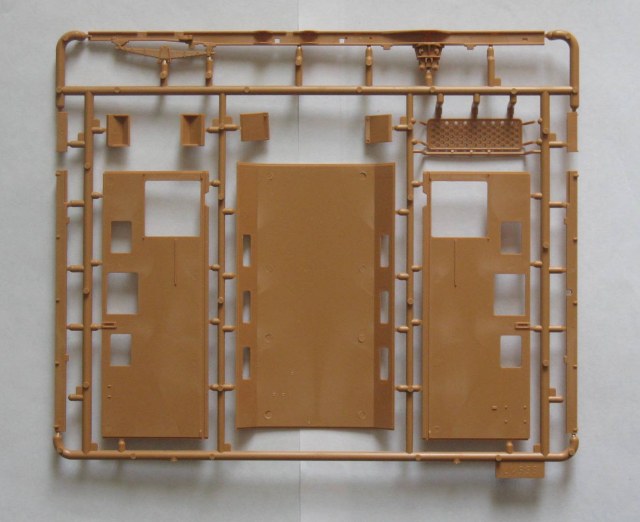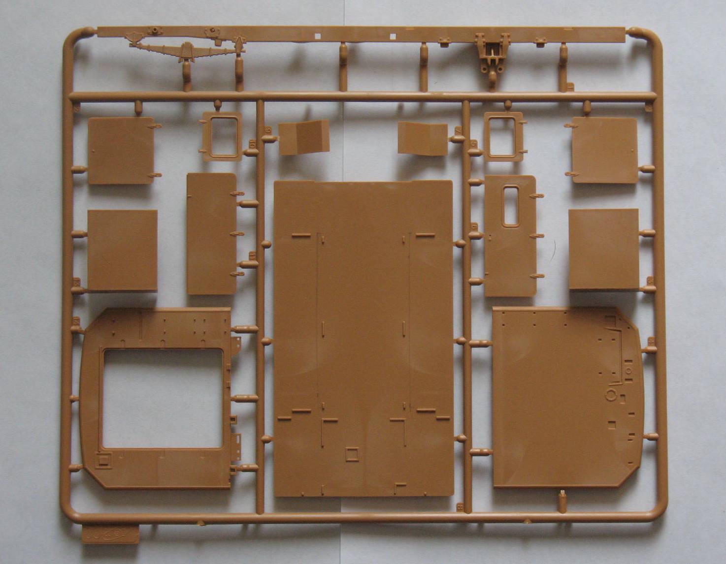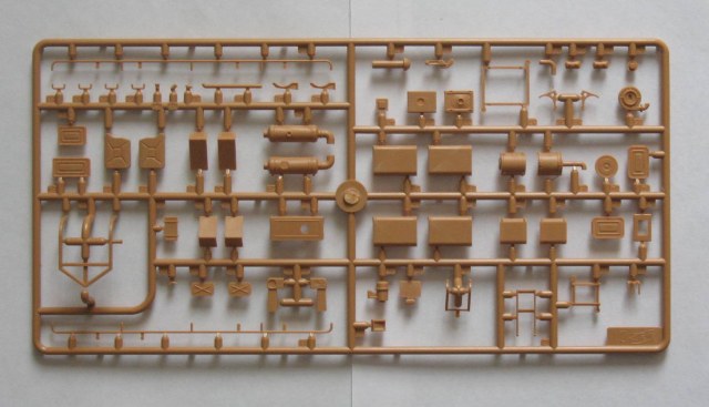 Набор упакован в ставшую уже привычной для моделей ICM коробку из плотного картона с верхней загрузкой, на которую надевается крышка с красочным боксартом. Причем жесткость коробки совсем не лишняя: литники заполняют практически весь ее объем, оставшийся неизменным от базовой модели ЗиЛ-131 (а вот деталей существенно прибавилось). Всего в наборе 12 литниковых рамок из пластика темно-песочного цвета: 6 для базового шасси и 6 для кузова-фургона, а также 8 колес из резиноподобного материала, типичного для этого производителя. В том числе 2 рамки из прозрачного материала со светотехникой и стеклами кабины и кузова.