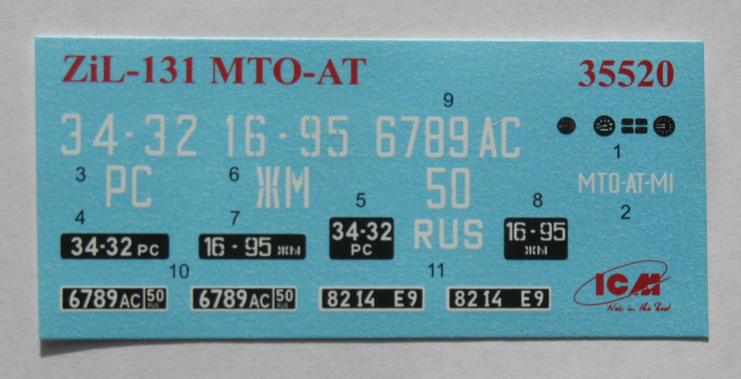 Декаль довольно скромная (как и подобает трудяге тыла), и включает панель приборов, четыре комплекта номерных знаков (два на Советскую Армию, один на российскую и один на украинскую, включая положенные номера-дублеры на задний борт) и корректную для предлагаемой модификации маркировку МТО-АТ-М1 (которую, впрочем, предлагается нанести только на один из вариантов). Впрочем, автотехника тыла редко несла что-то большее, даже обычный для армейских машин знак ограничения скорости на заднем борту на фото встречается не всегда. А вот отсутствие эмблемы Знака качества огорчает –он присутствовал на всех машинах семейства ЗиЛ-131 с 1974 года до самого конца советского периода их производства.