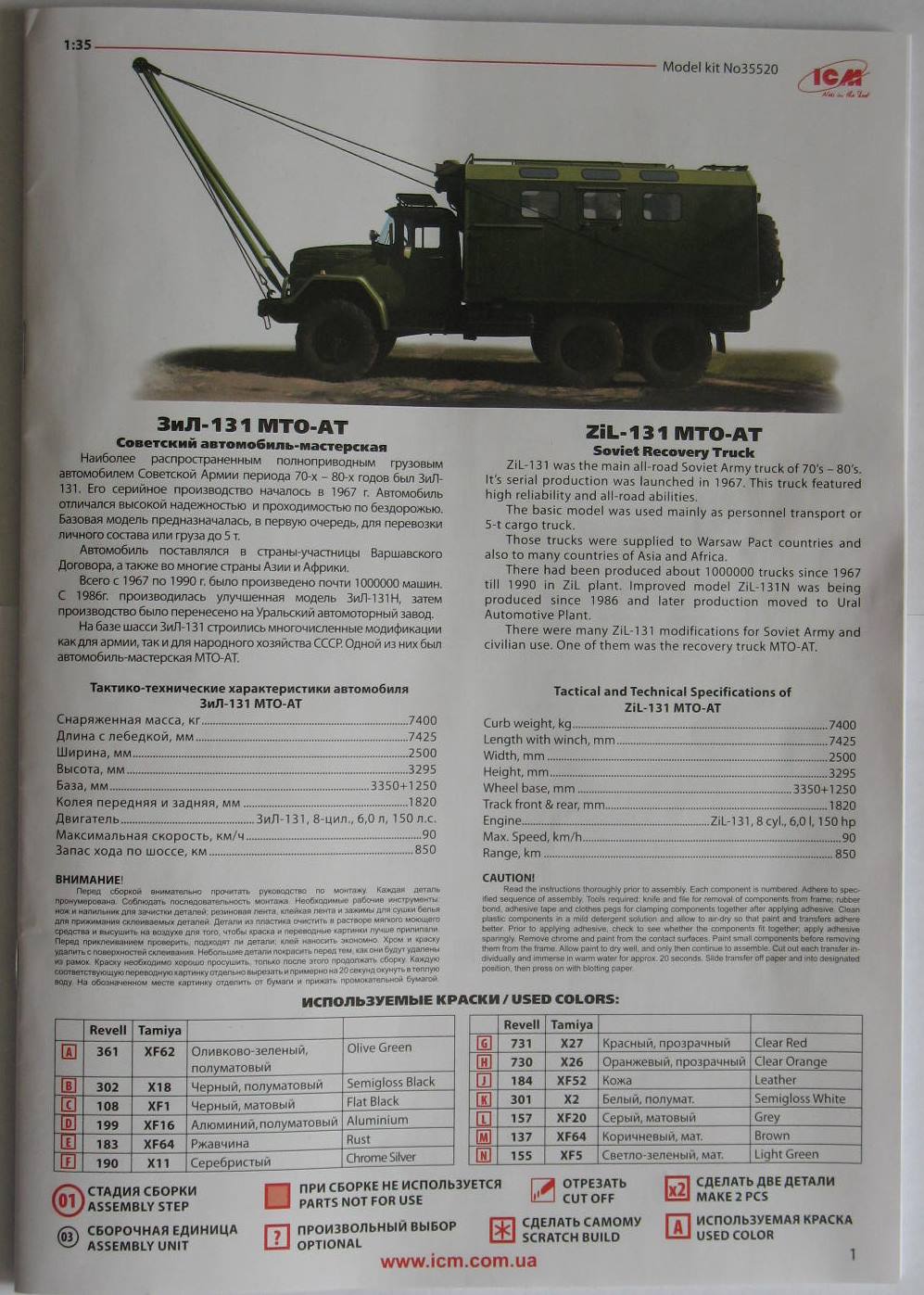 Тематика подвижных средств ремонта военной техники пока весьма скромно представлена в пластиковых моделях масштаба 1:35. В основном это немногочисленные БРЭМ на танковой базе, причем только зарубежного производства. Из отечественных прототипов можно назвать только довоенные ремонтные летучки на шасси ЗИС-6, выпускаемые в смолечешской MKModels. И вот известная киевская фирма ICM, расширяя линейку своих грузовиков, предложила модель под названием ЗиЛ-131 МТО-АТ Советский автомобиль-мастерская (кат.номер 35520).