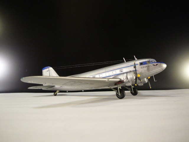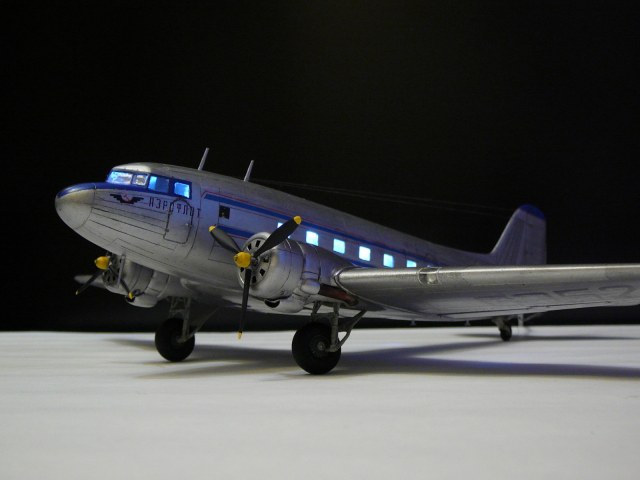 Данная модель от Amodel представляет собой пассажирскую версию самолёта - Ли-2П. Работа с набором от Amodel, как известно, требует повышенного расхода шпаклёвки и частого применения напильника, но в конце концов все возникающие проблемы, связанные с нестыковками, можно решить. Модель окрашена снаружи нитрокраской "Тамийя" из баллончика. Отдельные панели окрашены краской "Акан". Всё остальное красилось акрилом "Тамийя". Декали из набора.