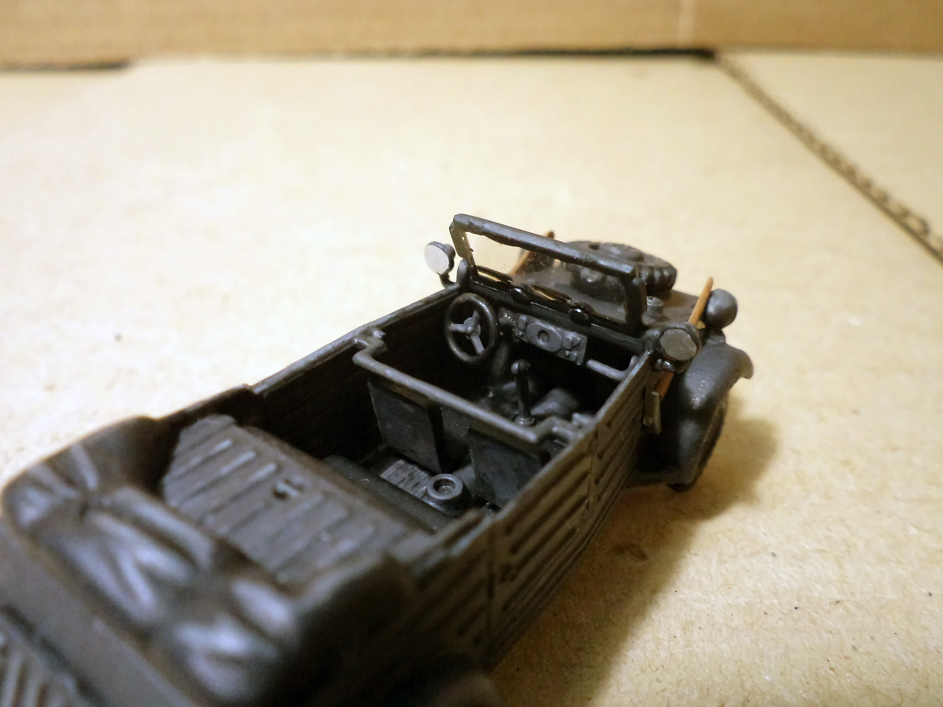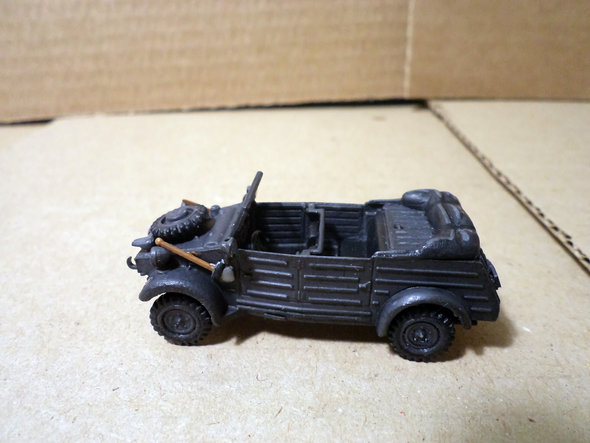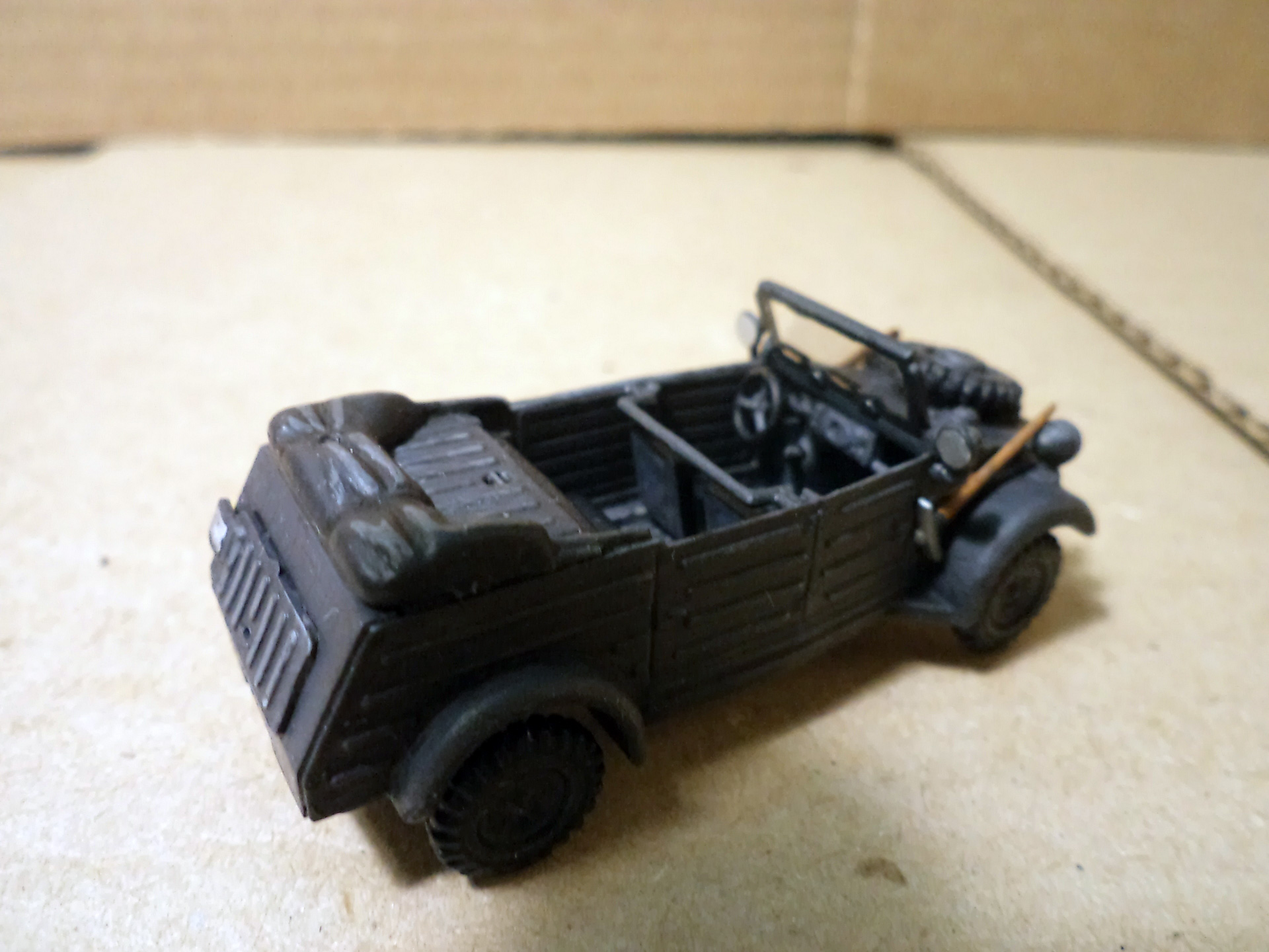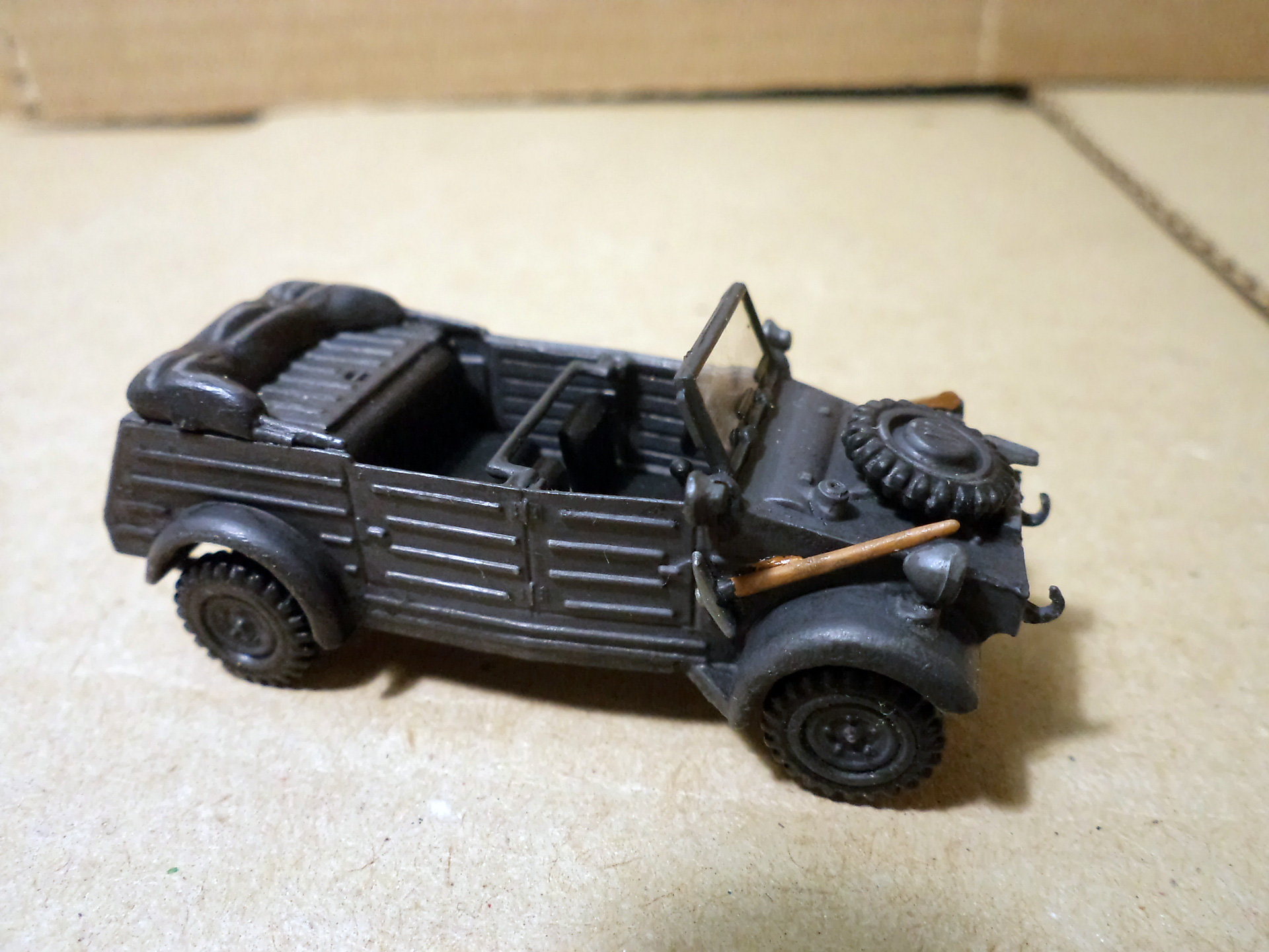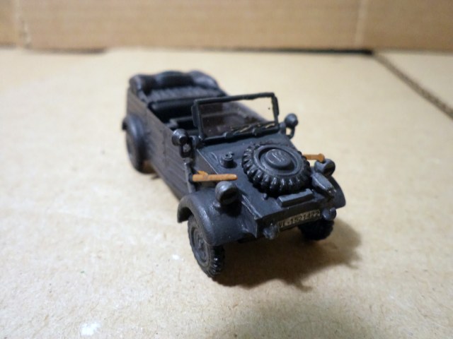 Прототип армейского автомобиля, максимально унифицированный по механической начинке с гражданской моделью KdF-Wagen, был разработан на заводе Volkswagen в 1938 году (первый прототип был сконструирован Ф. Порше ещё в 1936 г.) и получил обозначение KdF Typ 62 или VW Typ 62. В том же году были собраны первые 30 автомобилей. После испытаний и доработок прототип получил новое обозначание KdF Typ 82 или VW Typ 82. В серийное производство пошёл с ноября 1940 года, в вермахте был стандартизирован как Kfz.1 (нем. Kraftfahrzeug —- «автомобиль»). Автомобиль отличался от гражданской модели специальным облегченным открытым 4-дверным кузовом с плоскими панелями, задними колёсными редукторами, межколёсным самоблокирующимся дифференциалом, увеличенным до 290 мм клиренсом, 16-дюймовыми колёсами (в версии для африканской пустыни — с большей шириной протектора).