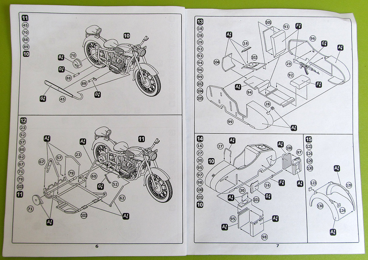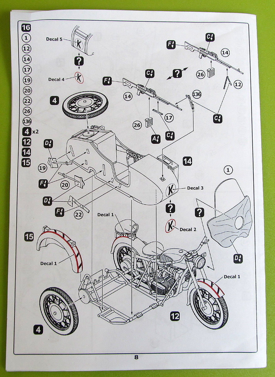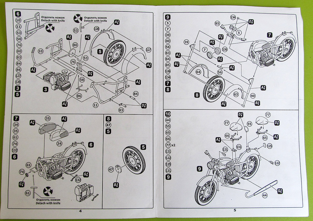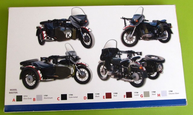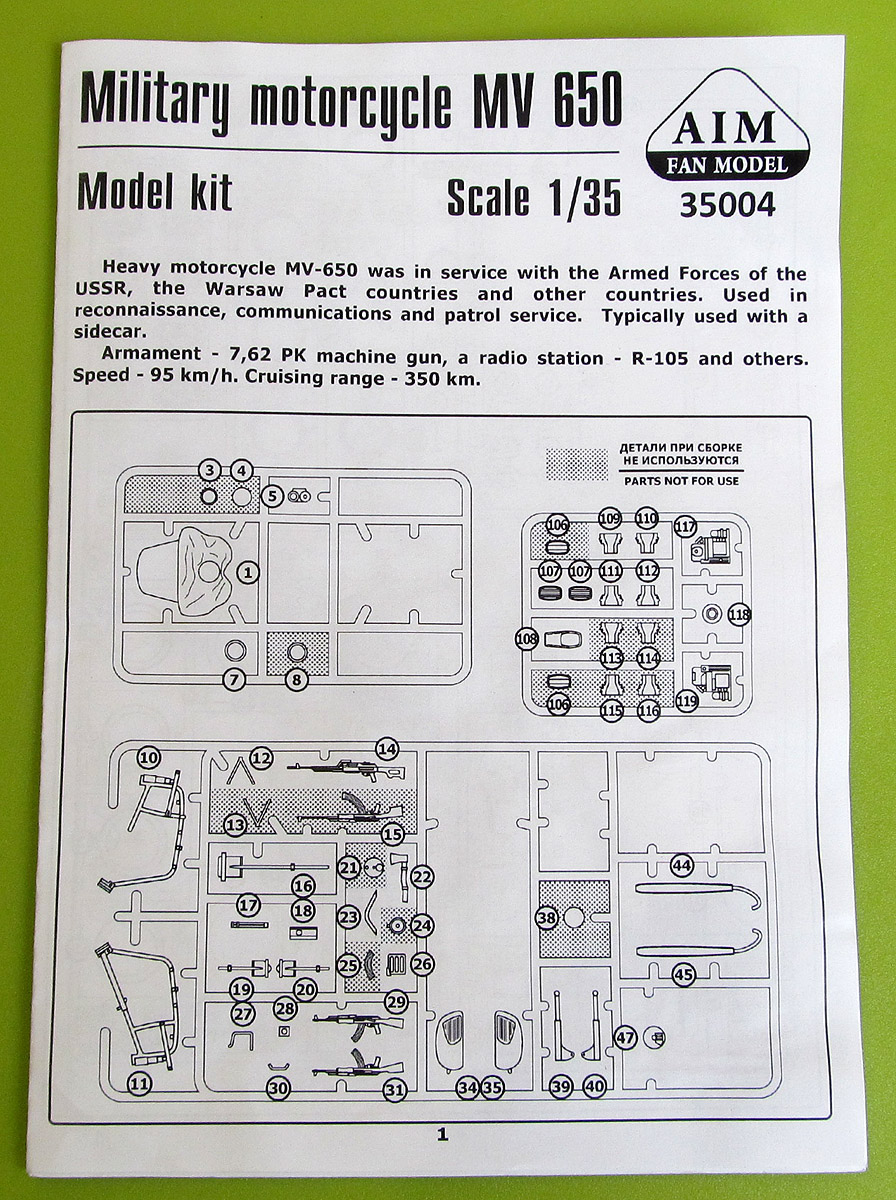Модель МВ-650 выпустила украинская фирма Aim Fan model. В коробке из плотного картона, с боковой загрузкой, находятся пять литниковых рамок обычного пластика, одна прозрачного, платка фототравления, инструкция и, в отличие от предыдущей модели, МВ-750, декаль. Инструкция на двух листах формата А4, сложенных в миниброшурку содержит предельно краткую историческую справку на английском языке, схемы литников с номерами деталей и хорошие, наглядные схемы этапов сборки с указаниями по окраске отдельных деталей. О качестве литья могу сказать ровно то же самое, что и о предыдущем наборе МВ-750, что и не удивительно: литниковые рамки, за исключением рамок двигателей, в наборах идентичны и отличаются только тем, что часть деталей, не относящихся к модели указанной на коробке, выкушена кусачками. Часть лишних деталей с рамок не удалена, а просто помечена в инструкции как не используемые, например это относится к лишним прозрачным деталям и пулемёту РПК. Кому как, а мне такой ход производителя, я имею в виду удаление лишних деталей с рамок, категорически не нравится. Дело в том, что данные модели мотоциклов, а так же их гражданские версии довольно долгое время выпускались параллельно и были унифицированы между собой чуть более чем полностью. Так например, в сети встречаются фото МВ-750 с новым бензобаком и электрооборудованием, а у моего деда, в своё время был К-650 1971г.в. по внешнему виду полностью аналогичный К-750, но с 650-ти кубовым двигателем. Так что оставив лишние детали на рамках производитель мог бы неиллюзорно расширить нам, моделистам, простор для конверсий. Может быть, конечно, фирма планирует в будущем увеличить свой ассортимент выпуском новых модификаций этих мотоциклов, но пока этого не произошло мне, чтобы построить модель дедова мотоцикла, пришлось приобрести оба набора, что, конечно, ни разу не радует.