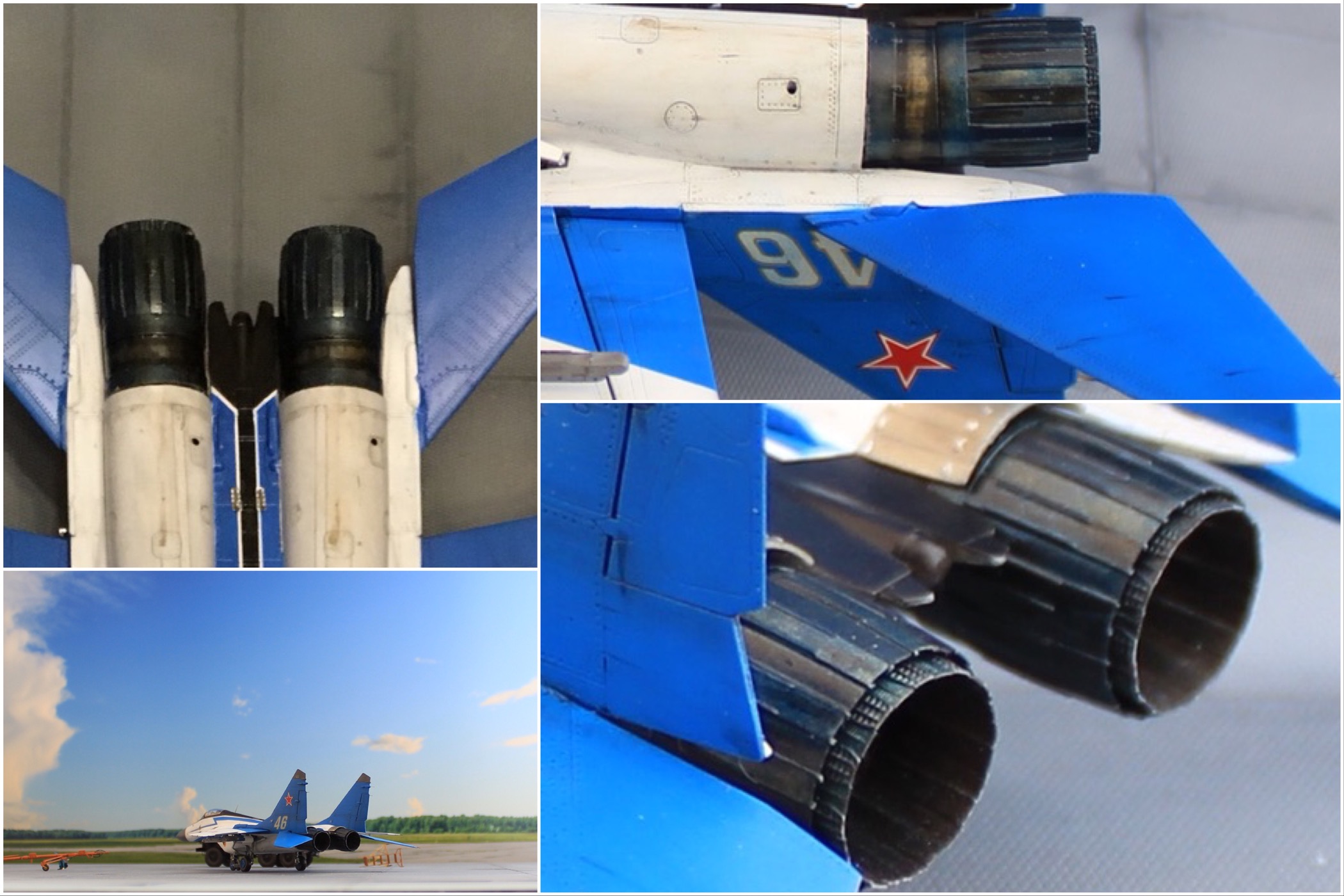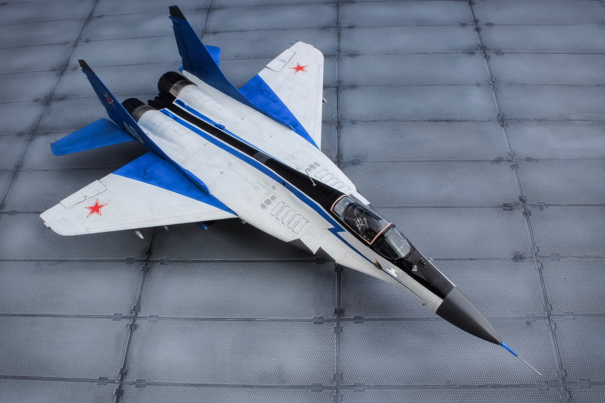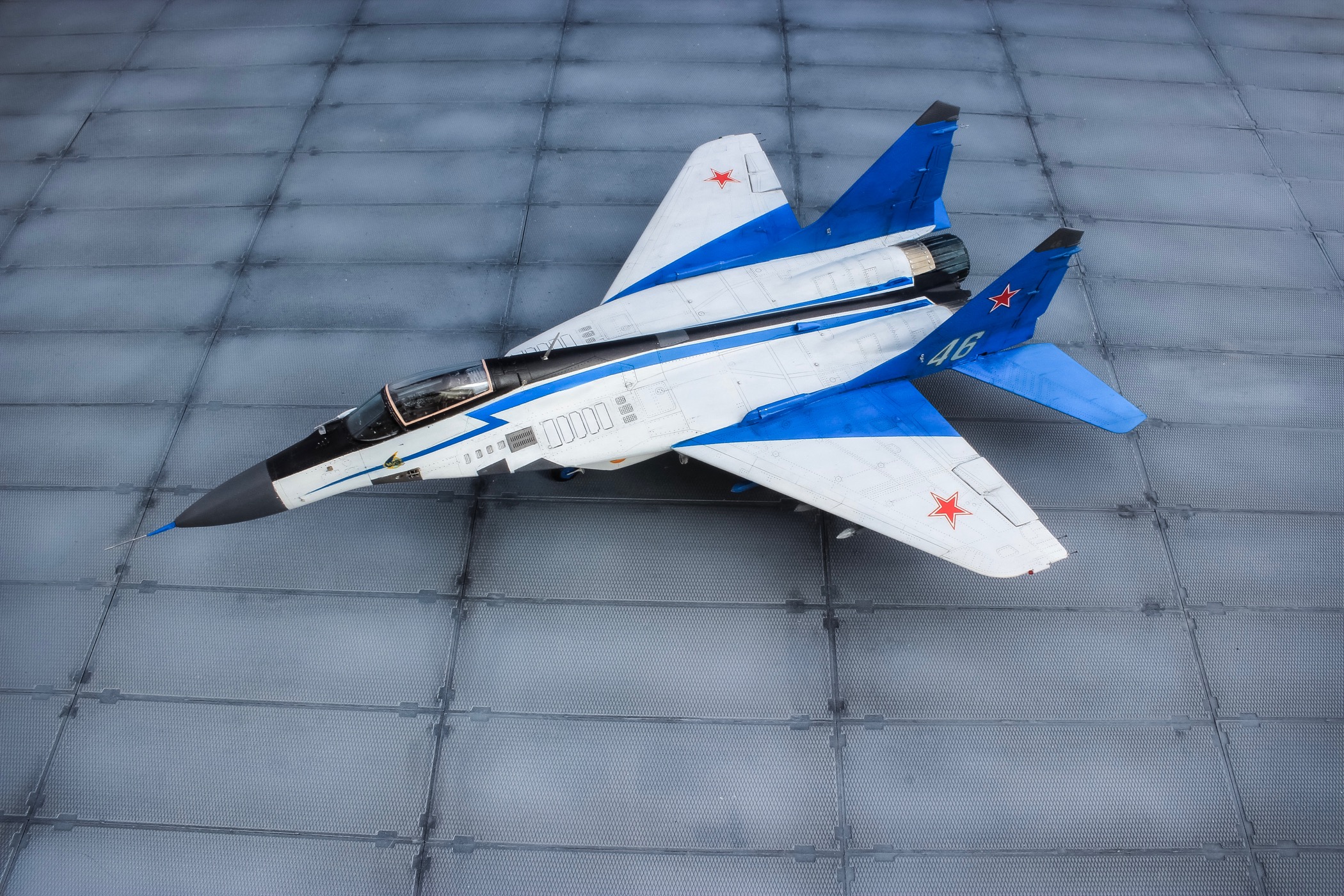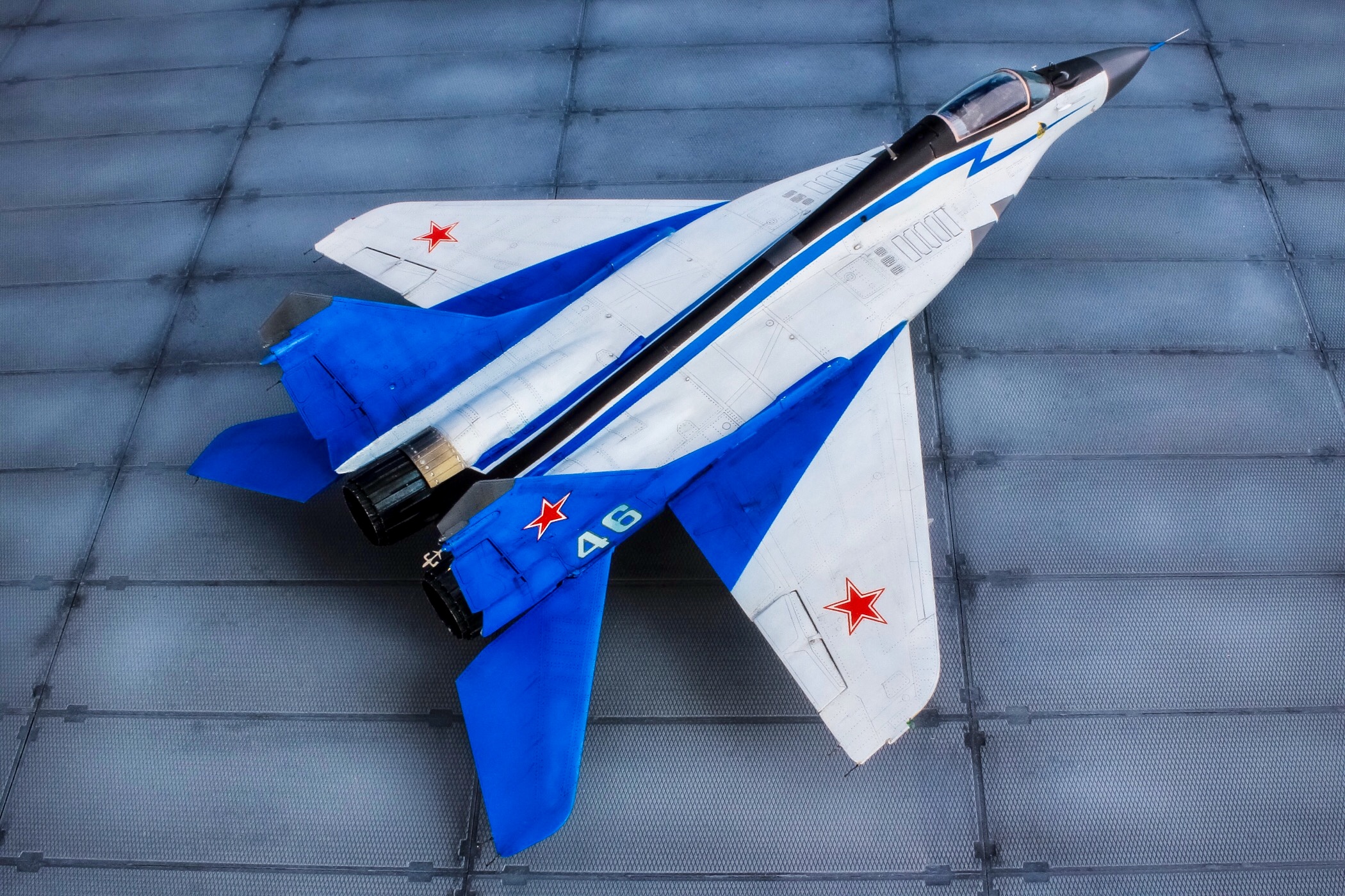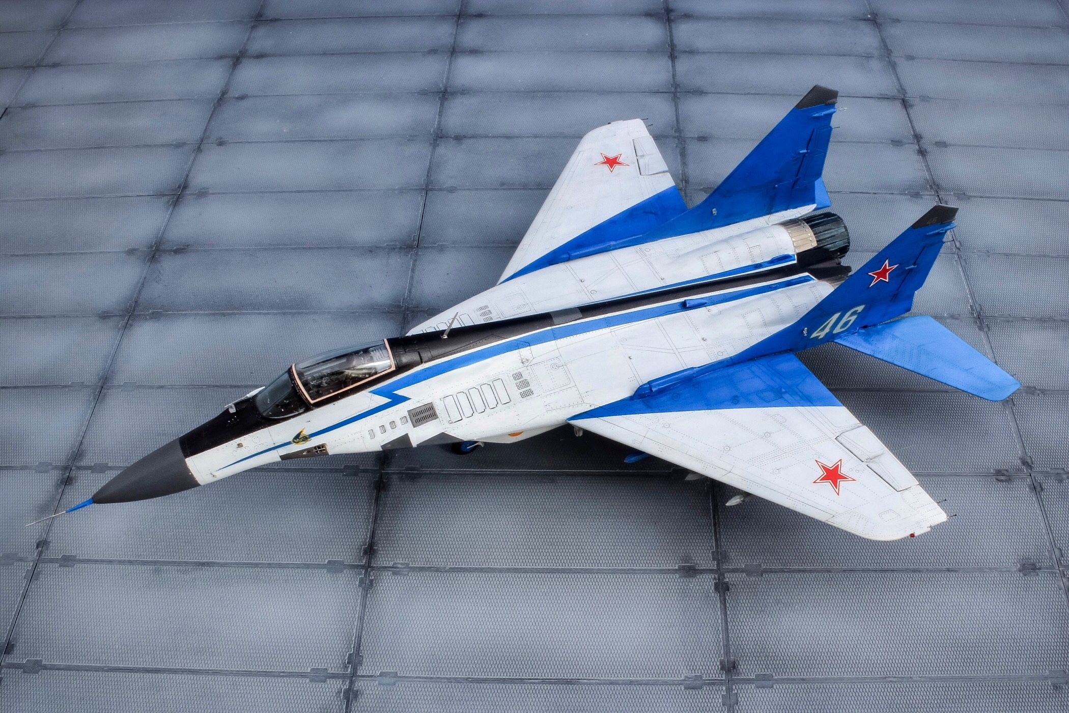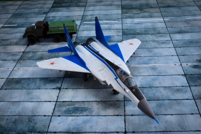 Отличная модель и хорошая фотосессия. Особенно мне понравилось, как вы сделали проводку в нишах и на стойках шасси. Я со своим последним МиГом поленился, ссылаясь на то, что там ее и так не видно. Как я понимаю вы использовали фототравленные "жабры" верхних воздухозаборников? Я не решился на 9.13 перепиливать и просто посадил пилота в кабину чтобы не нарушать "компановку"
