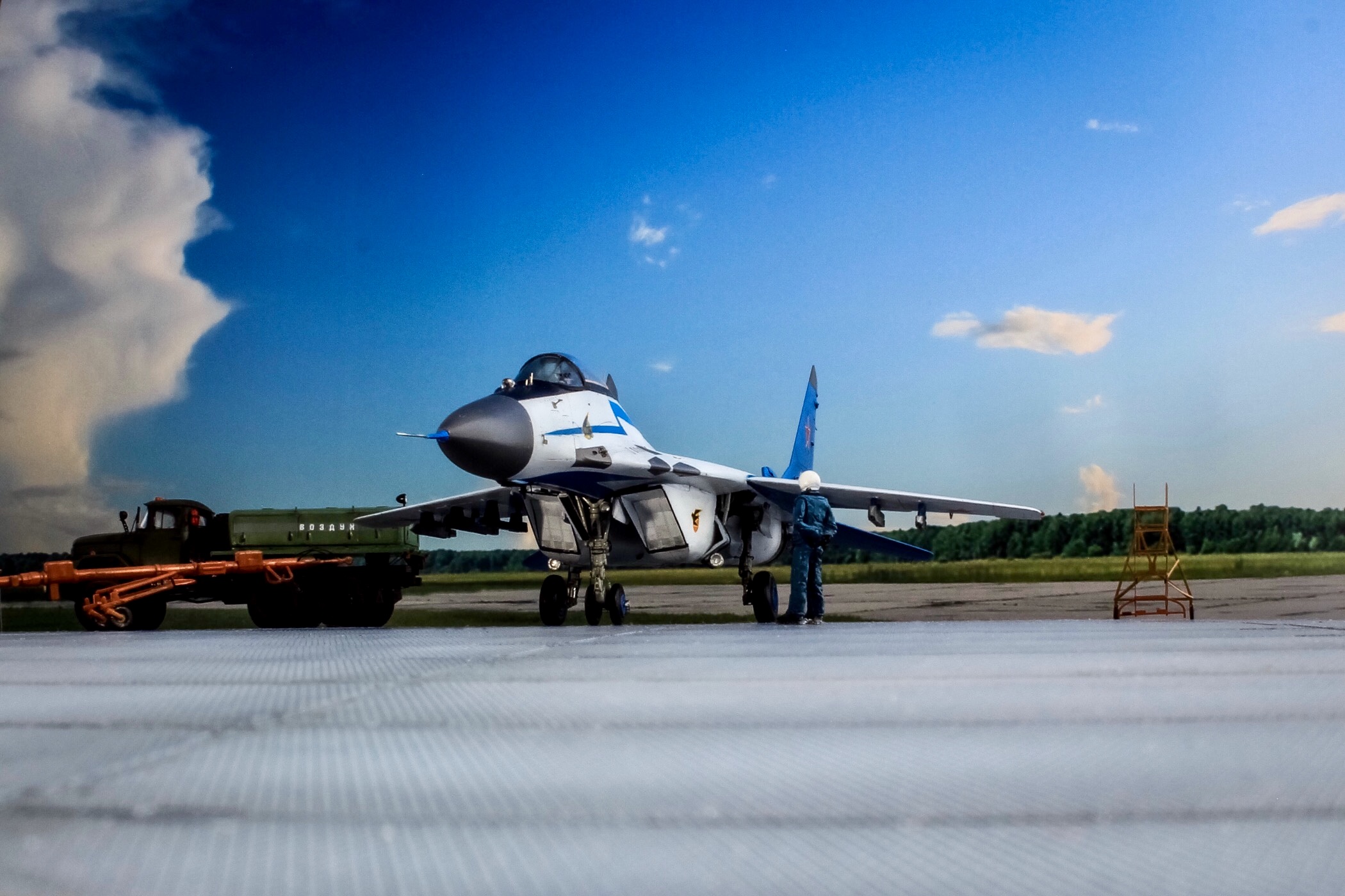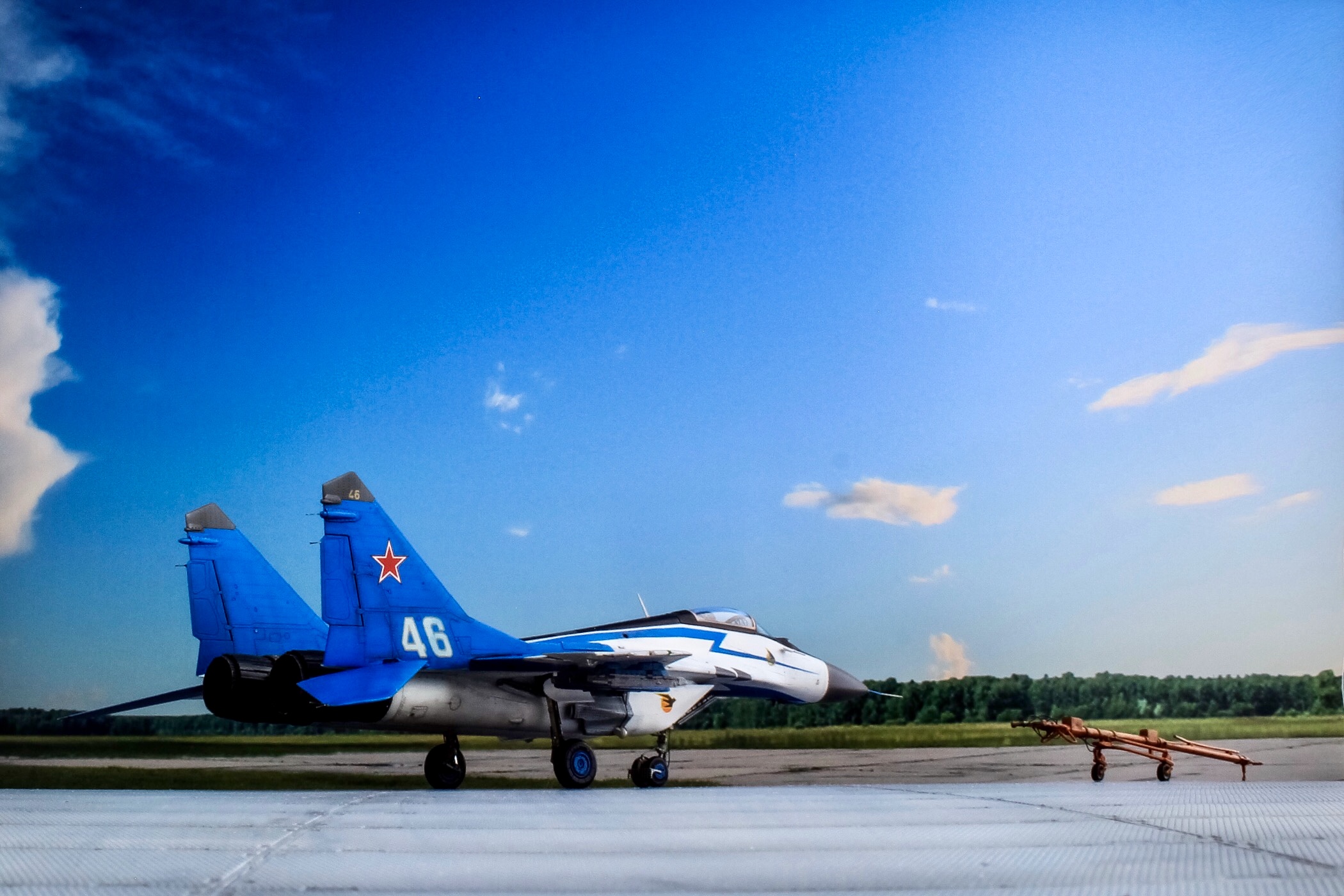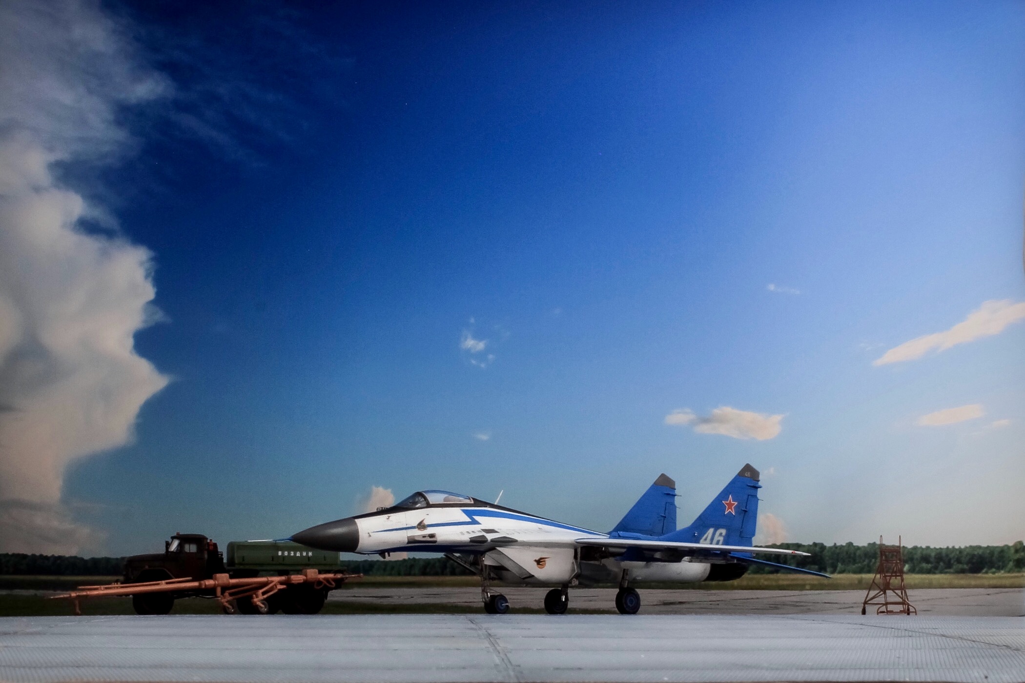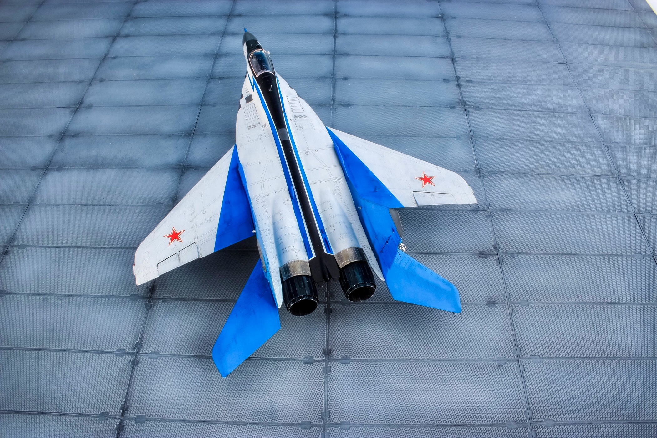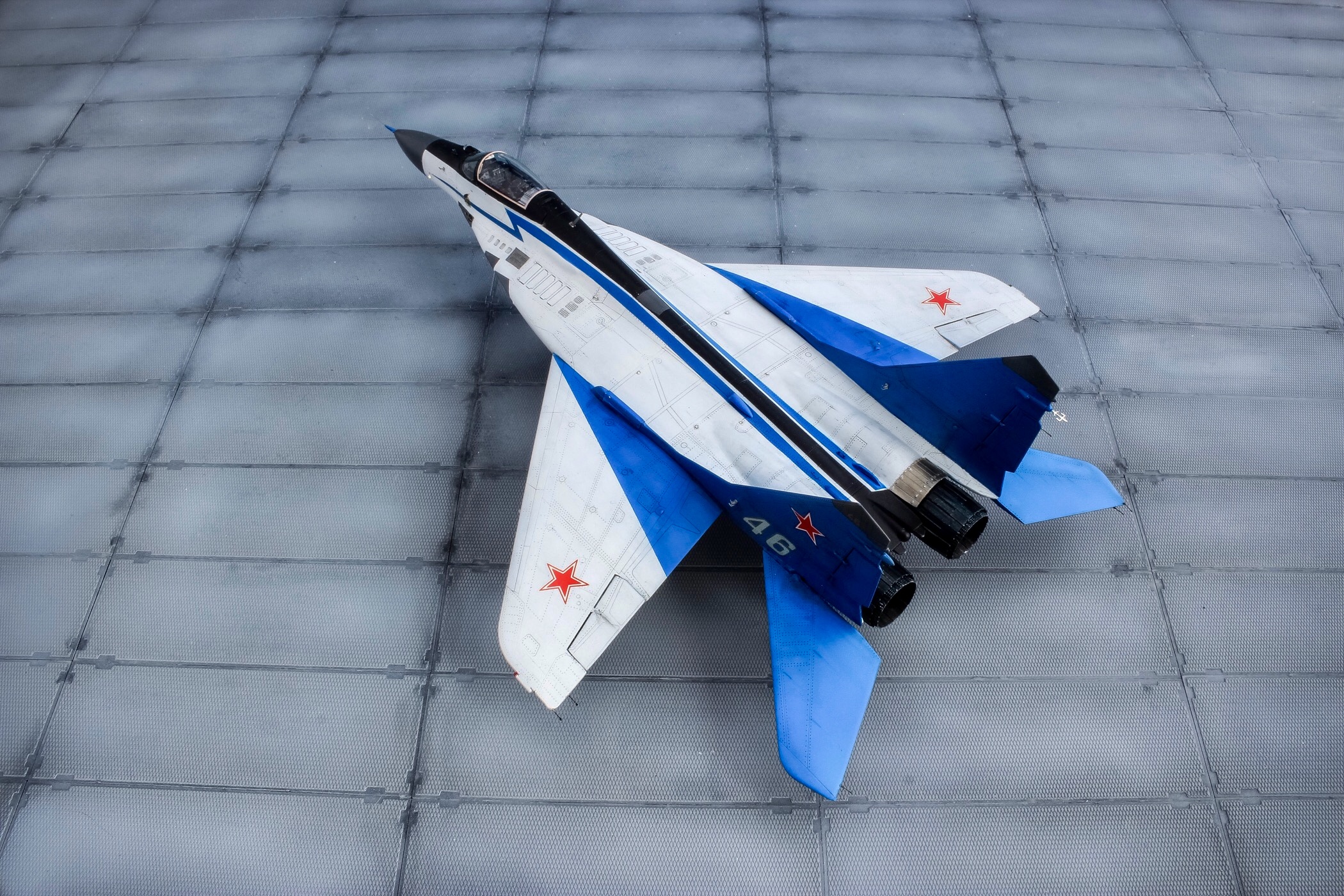 Отличная модель и хорошая фотосессия. Особенно мне понравилось, как вы сделали проводку в нишах и на стойках шасси. Я со своим последним МиГом поленился, ссылаясь на то, что там ее и так не видно. Как я понимаю вы использовали фототравленные "жабры" верхних воздухозаборников? Я не решился на 9.13 перепиливать и просто посадил пилота в кабину чтобы не нарушать "компановку"
