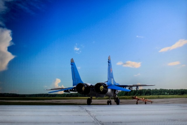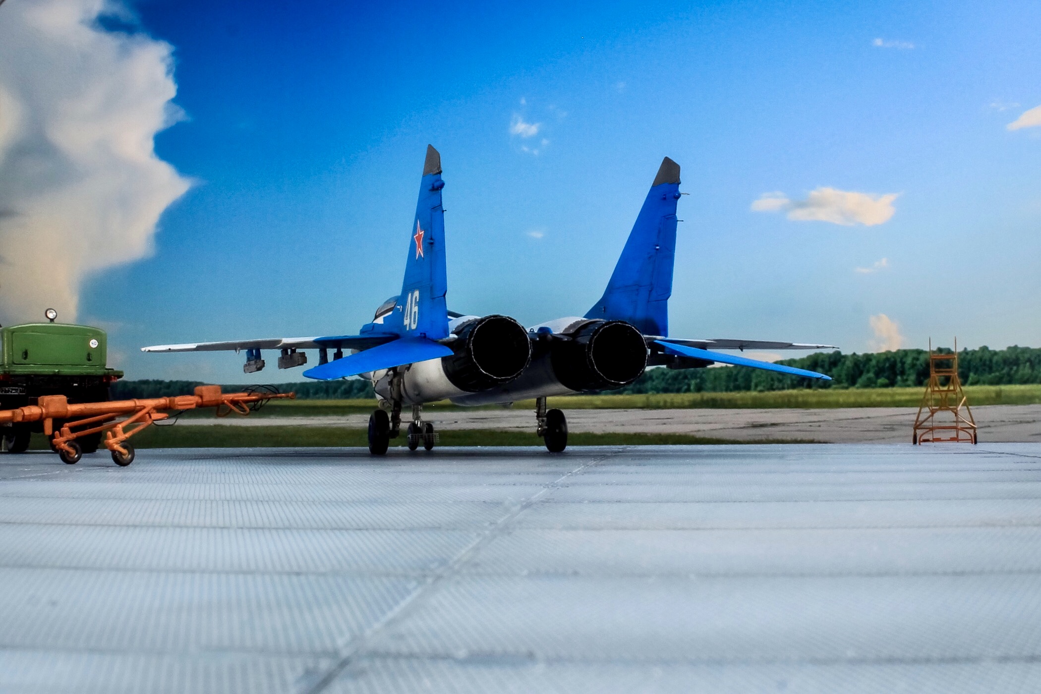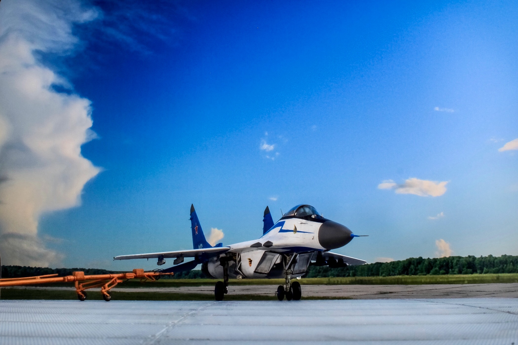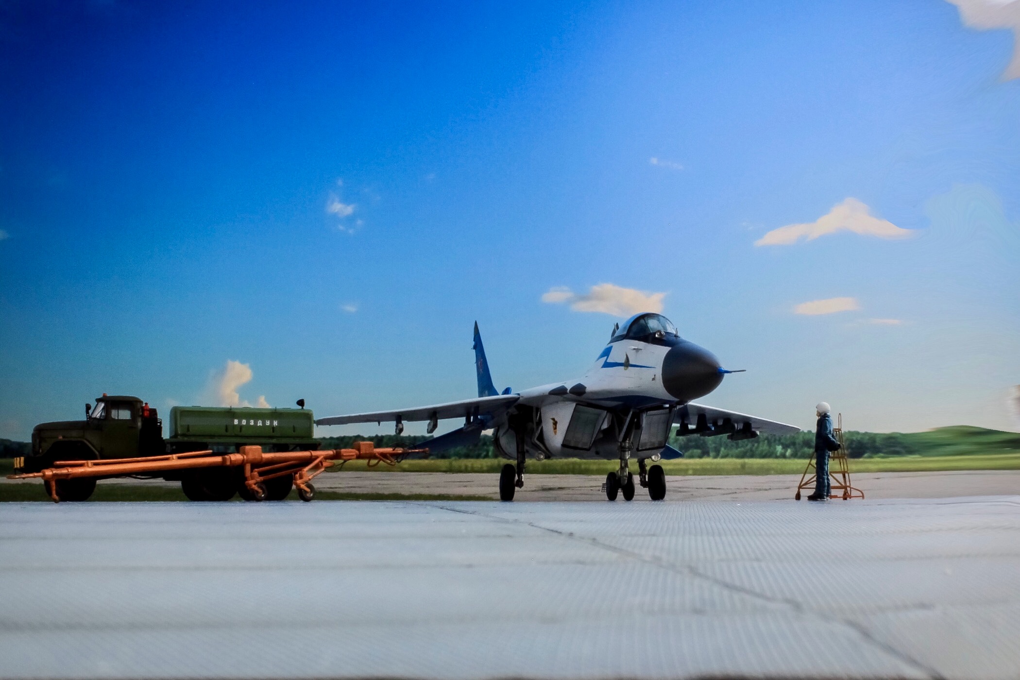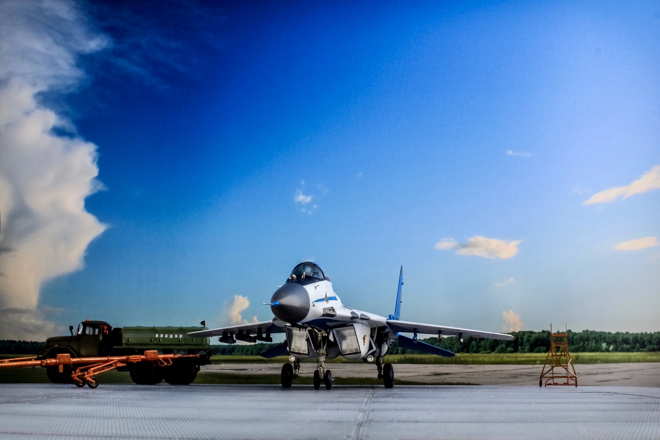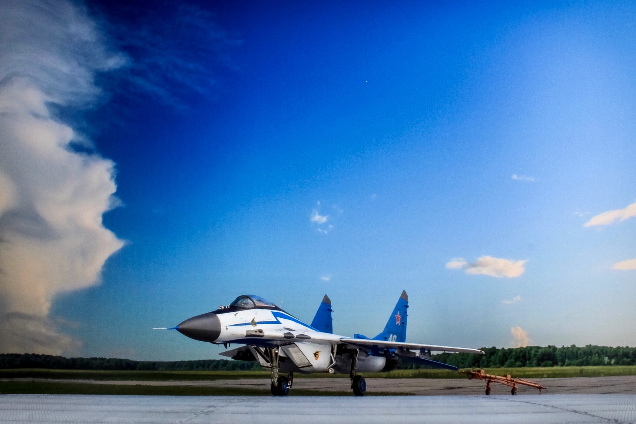 Отличная модель и хорошая фотосессия. Особенно мне понравилось, как вы сделали проводку в нишах и на стойках шасси. Я со своим последним МиГом поленился, ссылаясь на то, что там ее и так не видно. Как я понимаю вы использовали фототравленные "жабры" верхних воздухозаборников? Я не решился на 9.13 перепиливать и просто посадил пилота в кабину чтобы не нарушать "компановку"