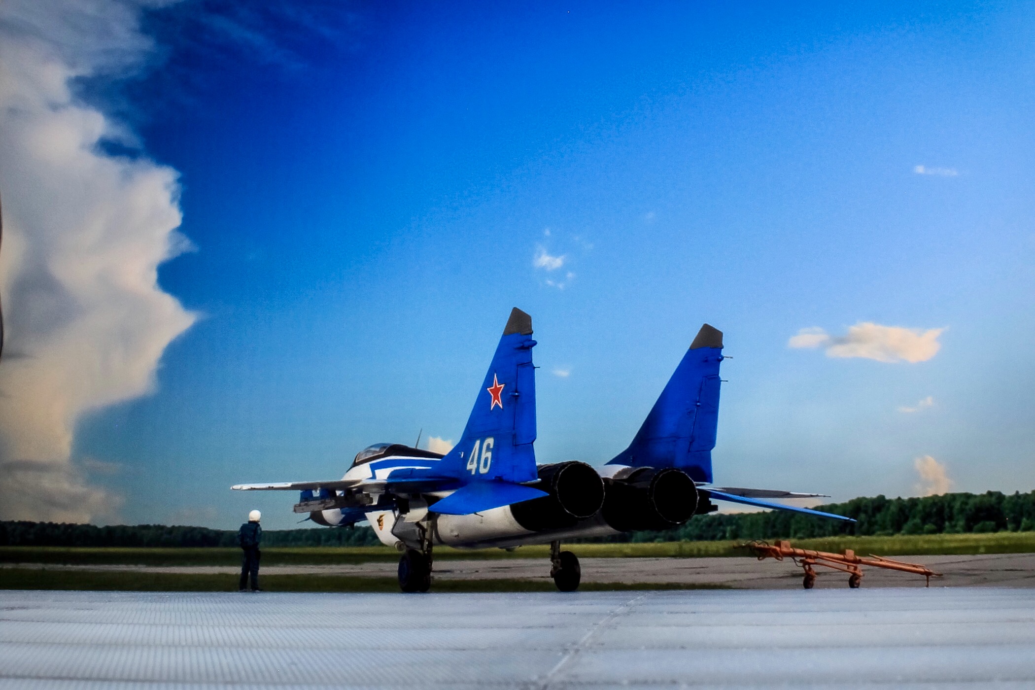 Дятел - знаменитый товарищ, лидер группы, это его борт стая чаек сбила, но все обошлось, удачно катапультиовались с напарником. Интересно, кто на моем 46 летал - и вообще есть ли у пилотажников привязка к самолетам, или нет. По идее они немного разные все - надо знать индивидуальные особенности техники.