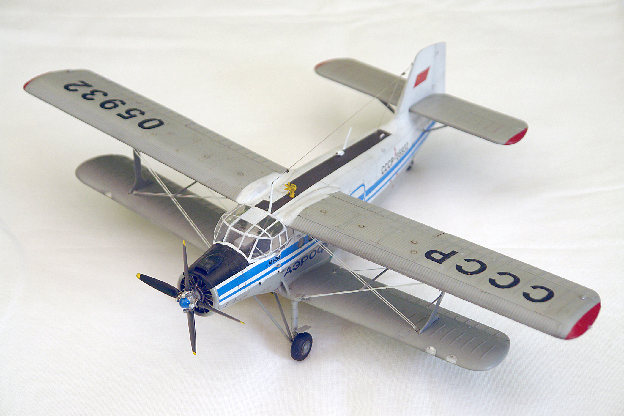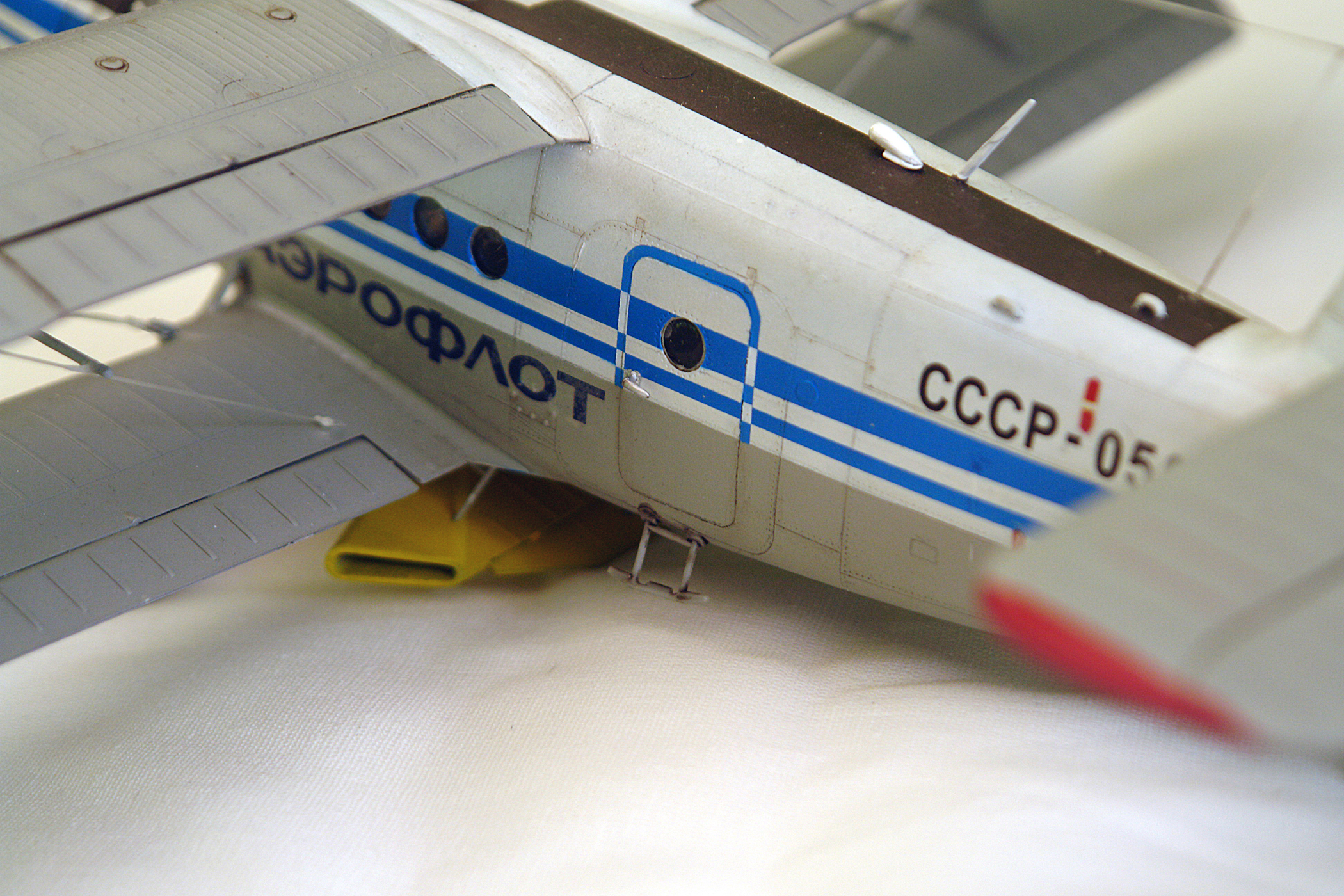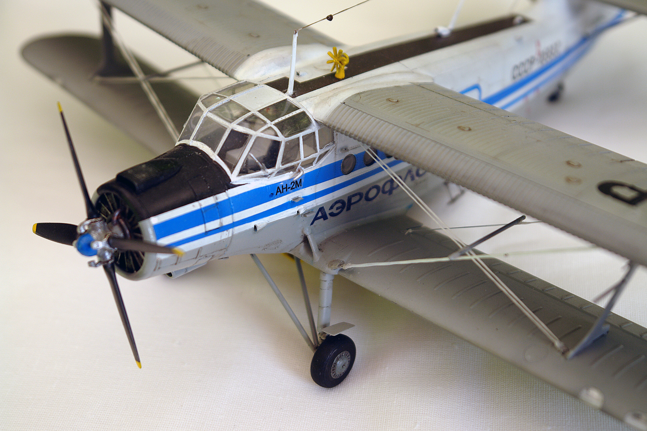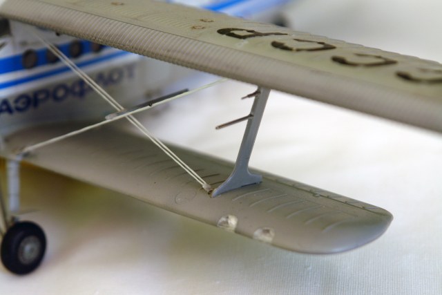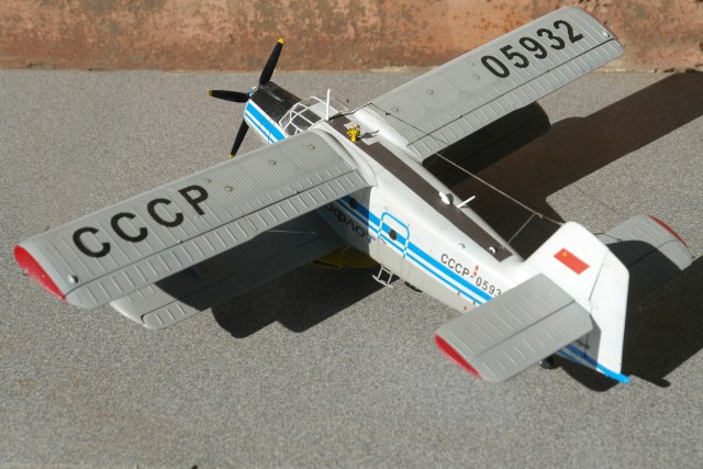 По рассказам Катунина, на ремзаводах уже не было оригинальных нижних консолей с аэродинамическим наплывами, поэтому ставили от обычных Ан-2 (пришлось переделывать). То же было и с капотами дв-ля. Пкределывал фонарь, справа убрал и заполировывал лишние переплеты, характерные для М-ки. Добавил окошко над выхлопной трубой, справа. Расчалки и антенны – эластомерная нить, брызговики паяны из меди. ПВД и термодатчик из мед.игл. Раскраска стандартная, аэрофлотовская. Декали делал сам. Если бы было время, помучался бы с провисом перкаля. Спасибо за внимание