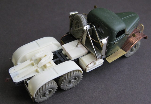Скажу пару слов про сам набор.Сам ЗиЛ-157 это смоляная копия ICM-ской модели,производитель только заменил сидение и передние рессоры ну и добавил детали для тягача.Полуприцеп и пакета отлиты средненько.Есть в наборе и травление.Оно конечно улучшает модель но без доработак не обойтись.