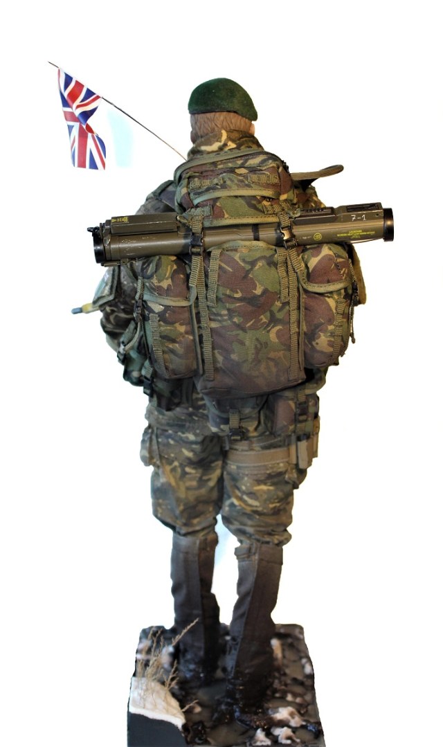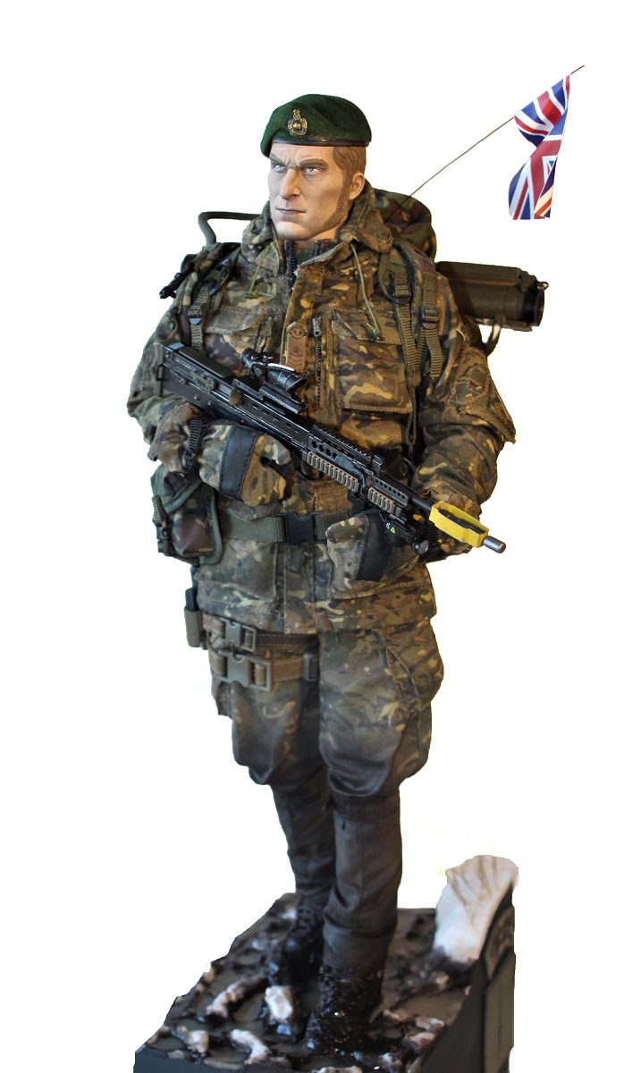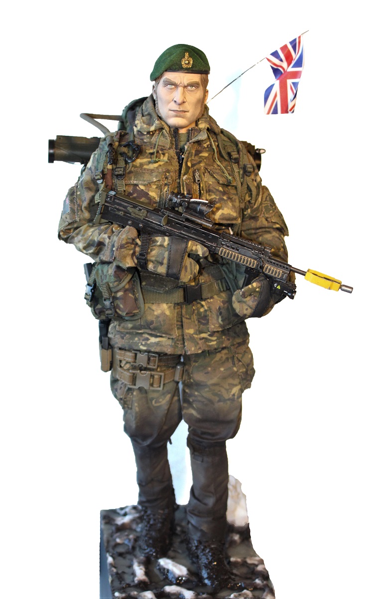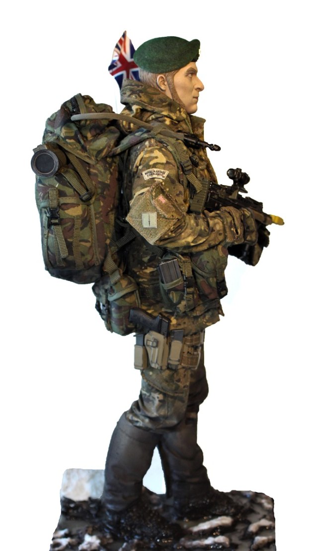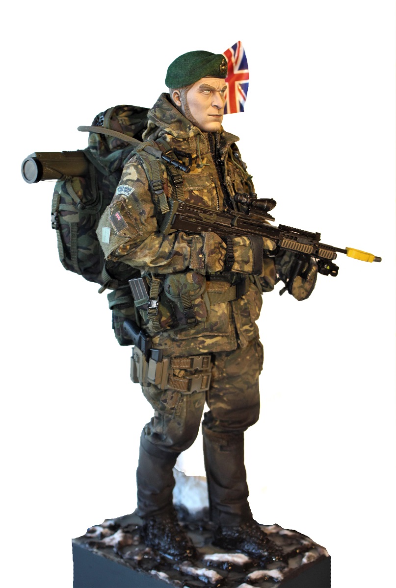 Британский командос морской пехоты. Изначально была задумка сделать бойца в облегченной экипировке (без шлема и брони) во время учений. Эту задумку я и постарался реализовать :) Производитель фигурки DAM toys. Масштаб 1/6 (высота около 30см).