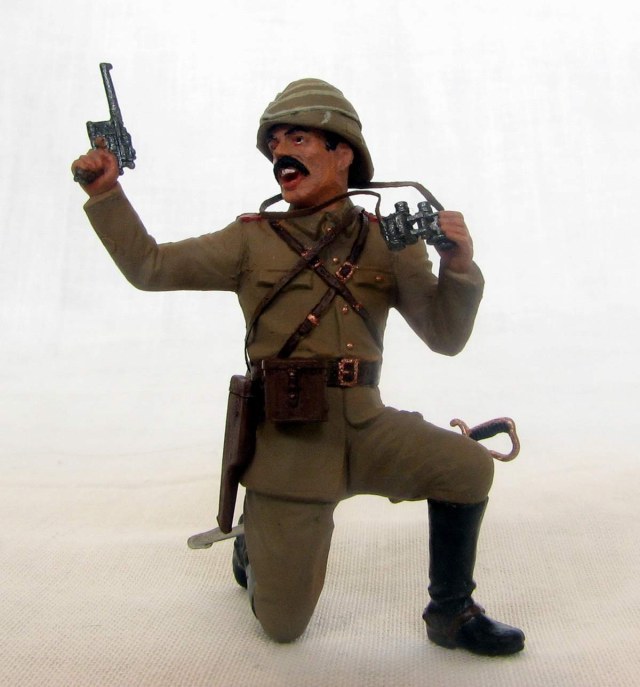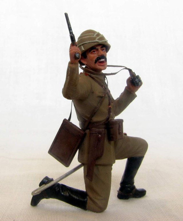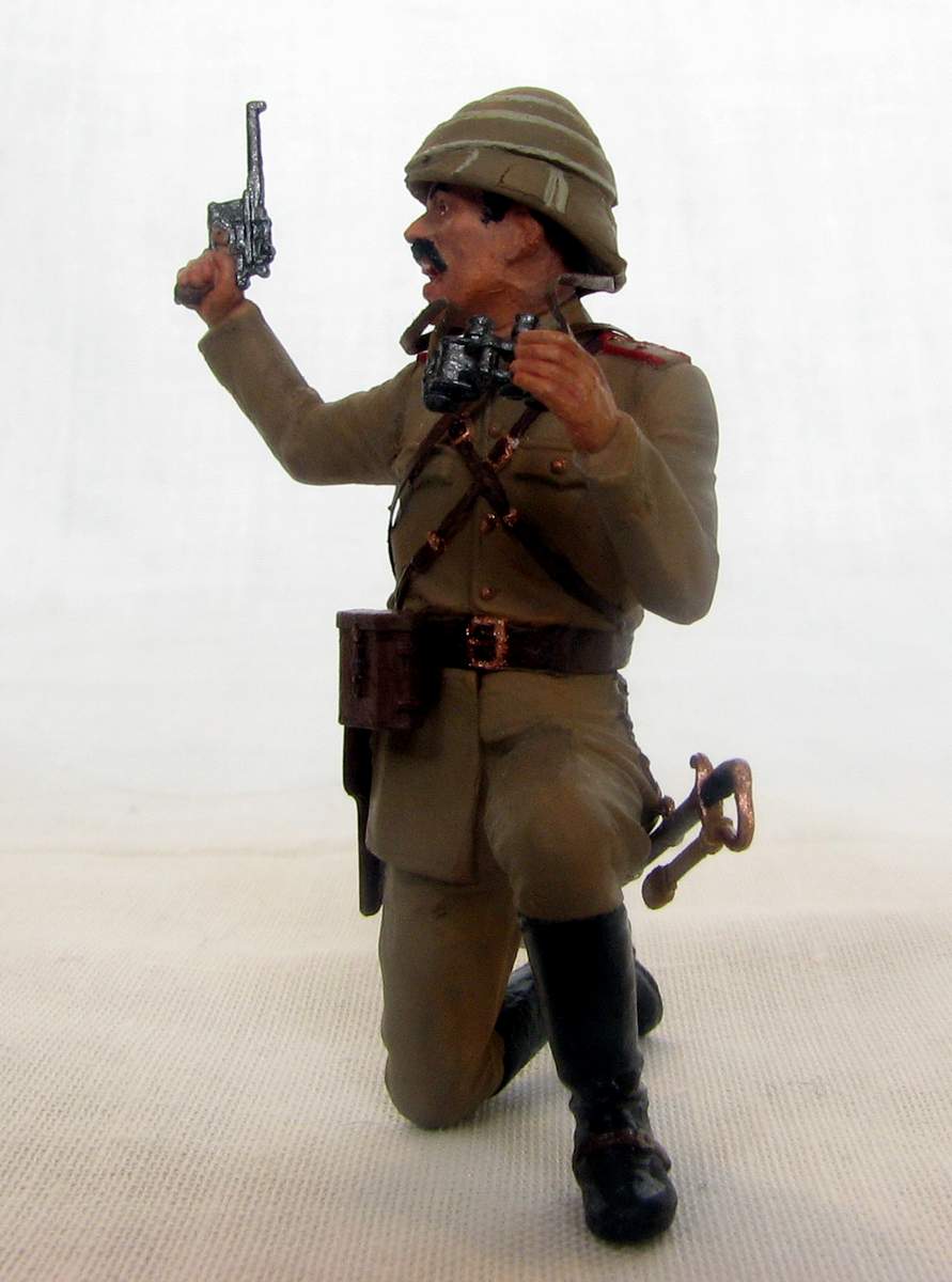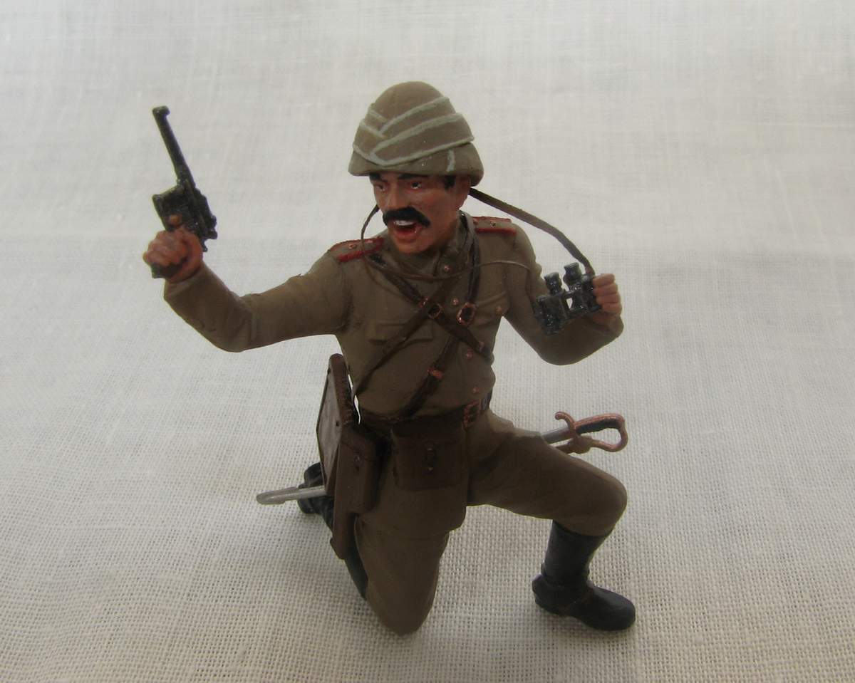 Офицер турецкой пехоты из набора ICM на Первую мировую. Изображает пехотного офицера Османской империи периода 1914-18гг, относится может к любому фронту, где были оттоманские войска - до Галиции или Ирака включительно. Одет он в полевую форму обр.1909г., с тряпично-деревянным шлемом энвирийе или кабалак, вооружен кроме сабли пистолетом Маузер С96.