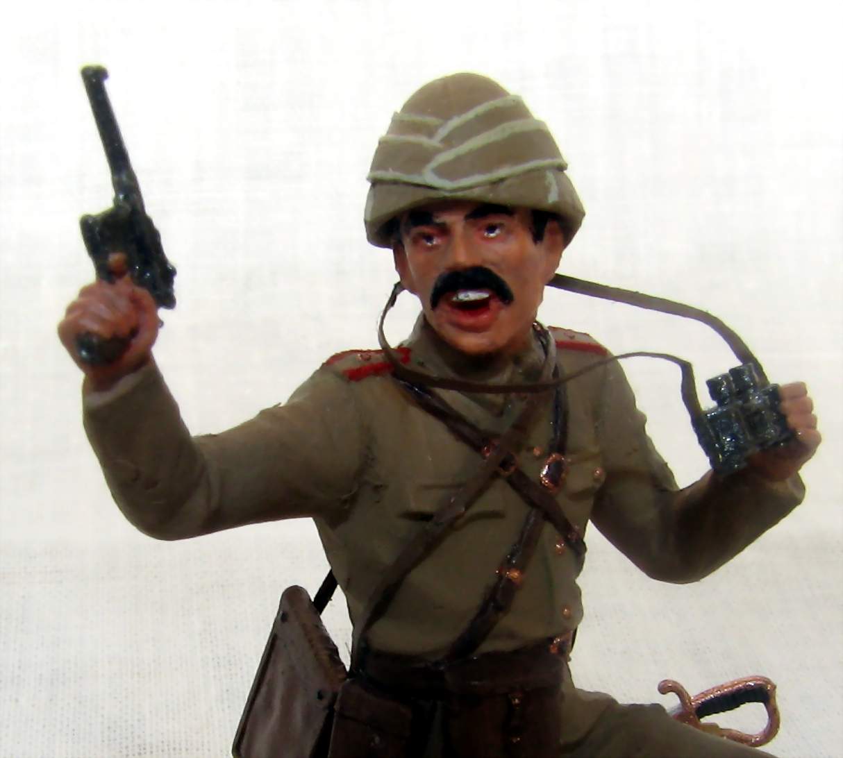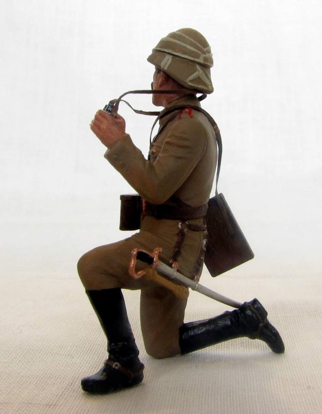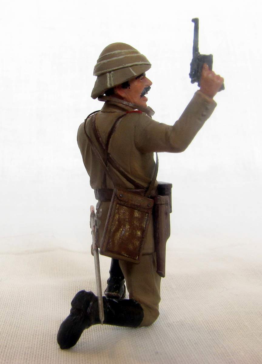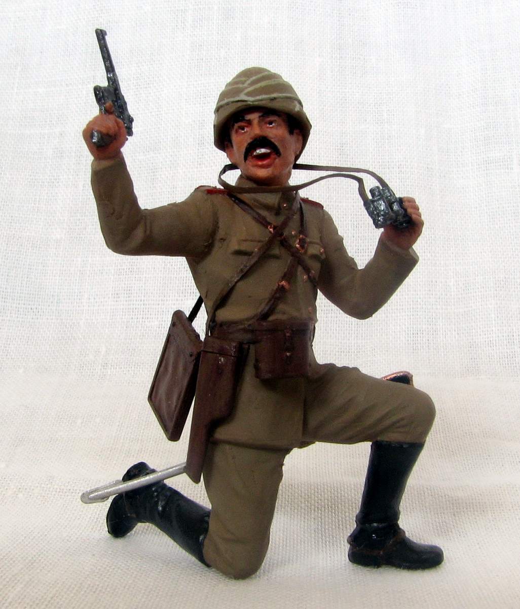 Офицер турецкой пехоты из набора ICM на Первую мировую. Изображает пехотного офицера Османской империи периода 1914-18гг, относится может к любому фронту, где были оттоманские войска - до Галиции или Ирака включительно. Одет он в полевую форму обр.1909г., с тряпично-деревянным шлемом энвирийе или кабалак, вооружен кроме сабли пистолетом Маузер С96.