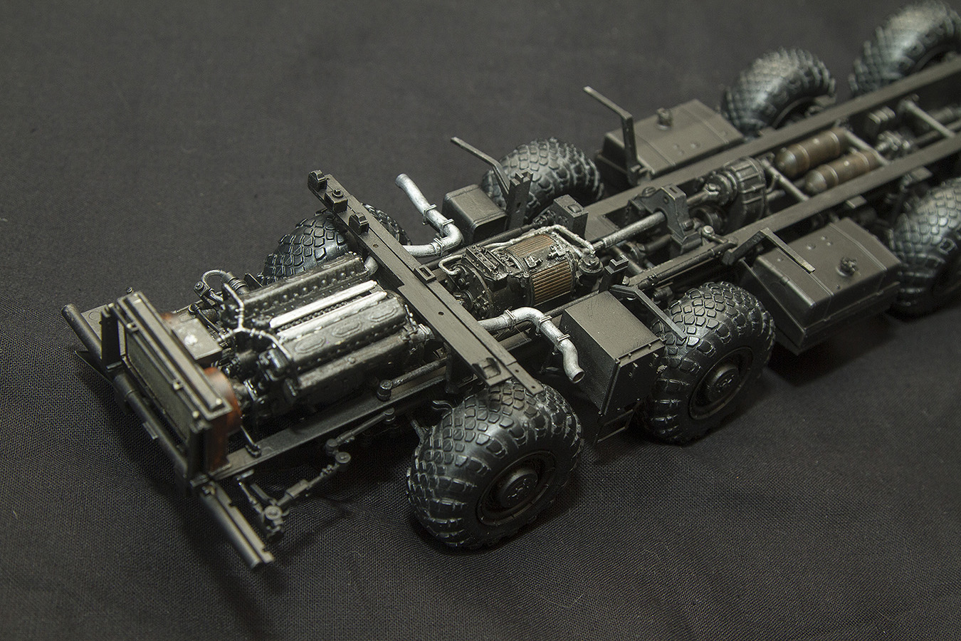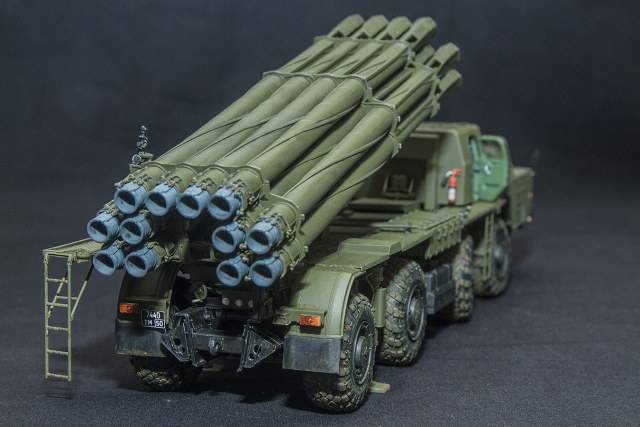 Работа в целом понравилась. Есть правда несколько замечаний по цветам. Я понимаю, что в разных ВЧ может быть по-разному, но для Смерча более характерен бирюзовый цвет интерьера, а не зеленый. Короб с подножкой между передней парой колес к покрашенному на заводе шасси отношения не имеет и должен быть зеленого цвета. Большие фары в переднем бампере - противотуманные и на прототипе имеют желтый оттенок.