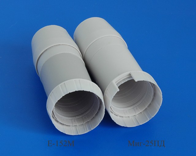 В целом, набор отличается от двухдвигательного , в первую очередь кольцом сопловых створок. В отличие от Миг-25, на Е-152М оно полностью замкнуто. На сравнительном снимке это сразу видно. Ну и, разумеется, отсутствует литник с междвигательными перемычками. В остальном все полностью одинаково.