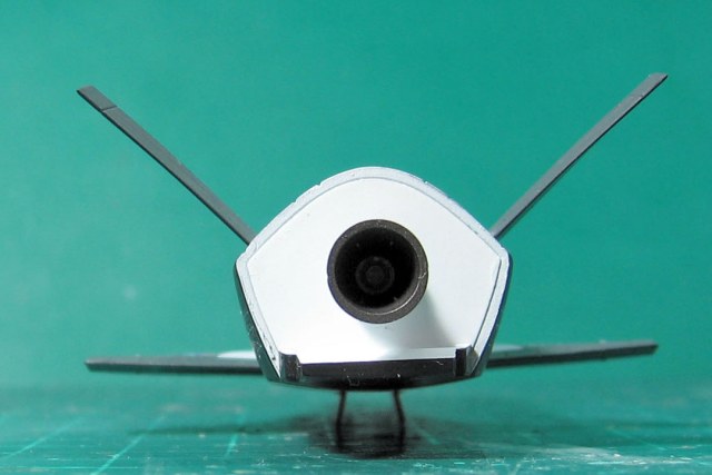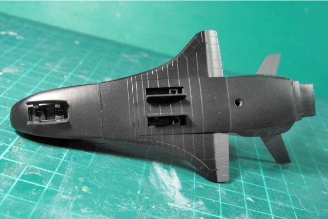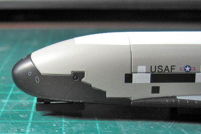 Так как корпус металлический, выполненный литьём, то на поверхности имелись некоторые шероховатости, раковины. Но, надо отдать должное, можно было бы и не придираться. Модель действительно сделана очень качественно. Кое-где пришлось подшлифофать и задуть эмалью. Соответственно все пластиковые детали (шасси, хвост, защитные щитки) пришлось снять и тоже подточить. Затем немного смывки, на белом корпусе - тёмная, на черных крыльях - светлая. Несколько вечеров пришлось провозиться с наклеиванием декалей, имитирующих на брюхе и на носу огнеупорные керамические панели. Но получился неплохой панельный эффект.