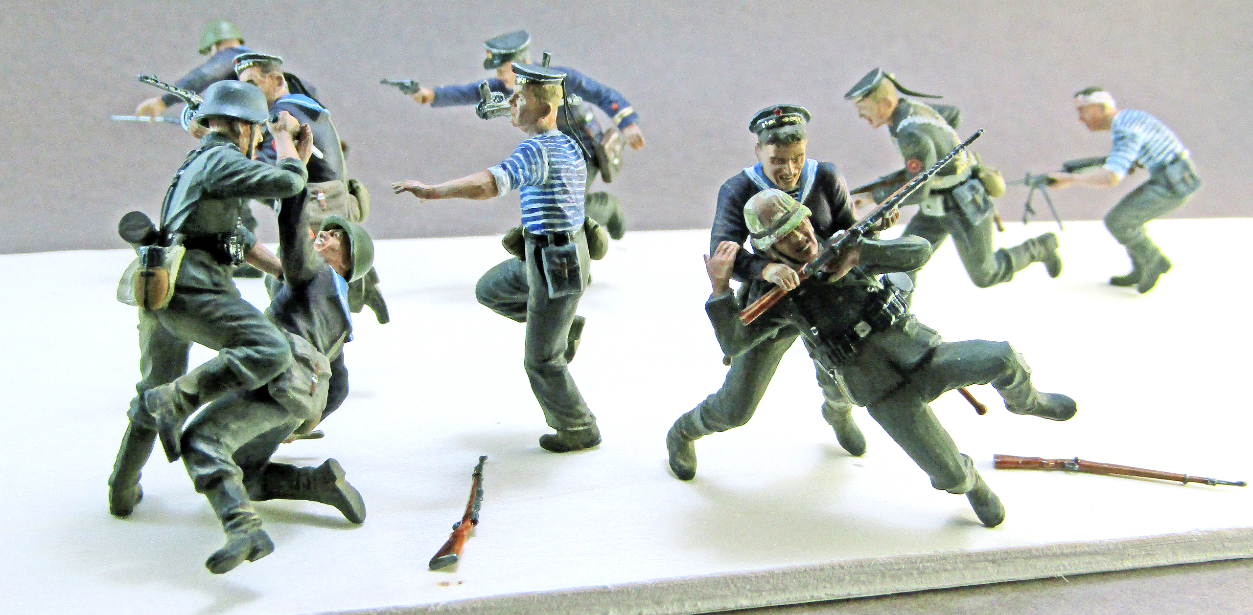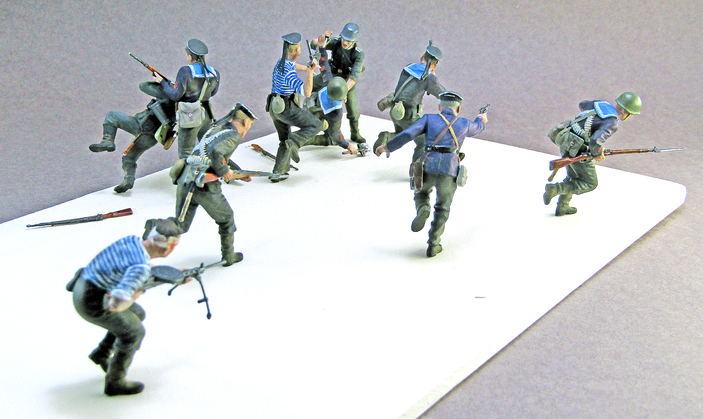Представляю фигурки из двух известных наборов от MasterBox. В очередной раз делал на заказ под диораму, на дощечку прилепил временно для фотосессии. Фигурки морпехов расписывал впервые, поэтому наверняка найдётся море косяков. По покраске: грунт чёрный Pacific 88; краски ПВА-темпера и "МАКР'ы" Звезды; лак для дерева на лопатах и деревянных поверхностях оружия. В ходе сборки накосячил с советским офицером, а именно: даётся 2 варианта оружия - Маузер или Наган, я выбрал Наган, а вот убрать ремешок от кобуры-приклада Маузера забыл, и соответственно пришлось вешать вместо приклада какую-то найденную в запасниках сумку. Также у меня сомнения по-поводу оскольчатого камуфляжа на каске фрица - честно не разбирался с периодом вов, в котором такие каски начали поступать в войска вермахта. Ещё признаюсь, что поленился сделать ремешки на оружии - просто слишком затянулась сборка данных фигурок.
