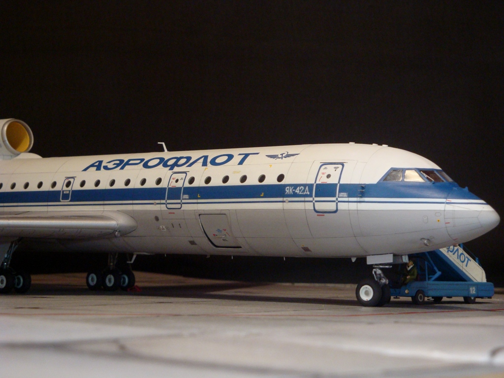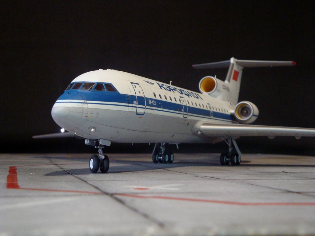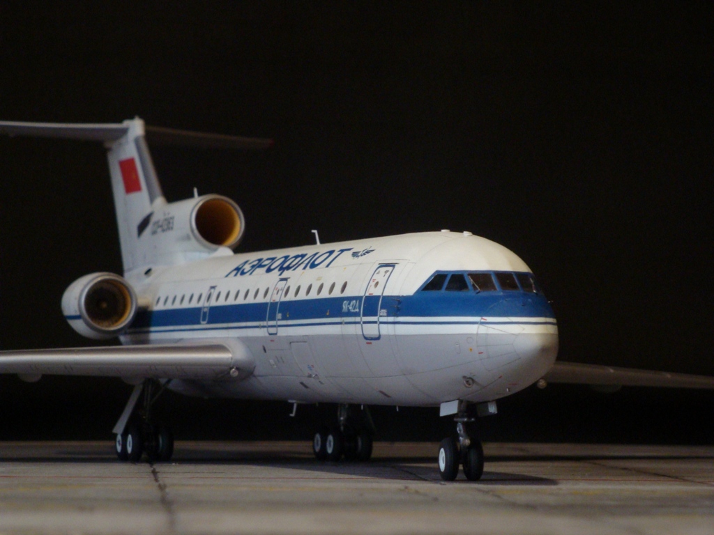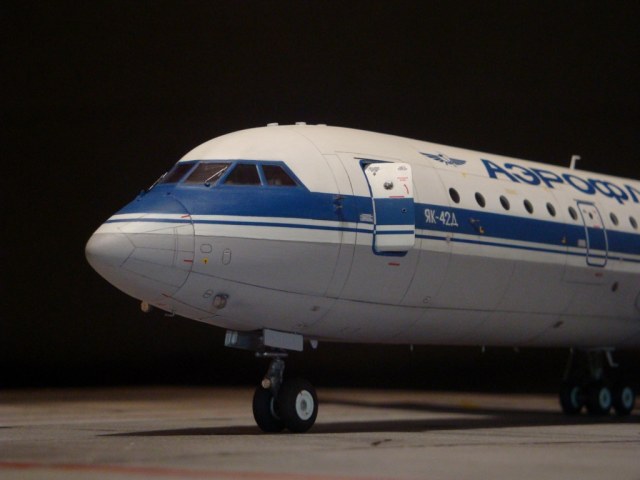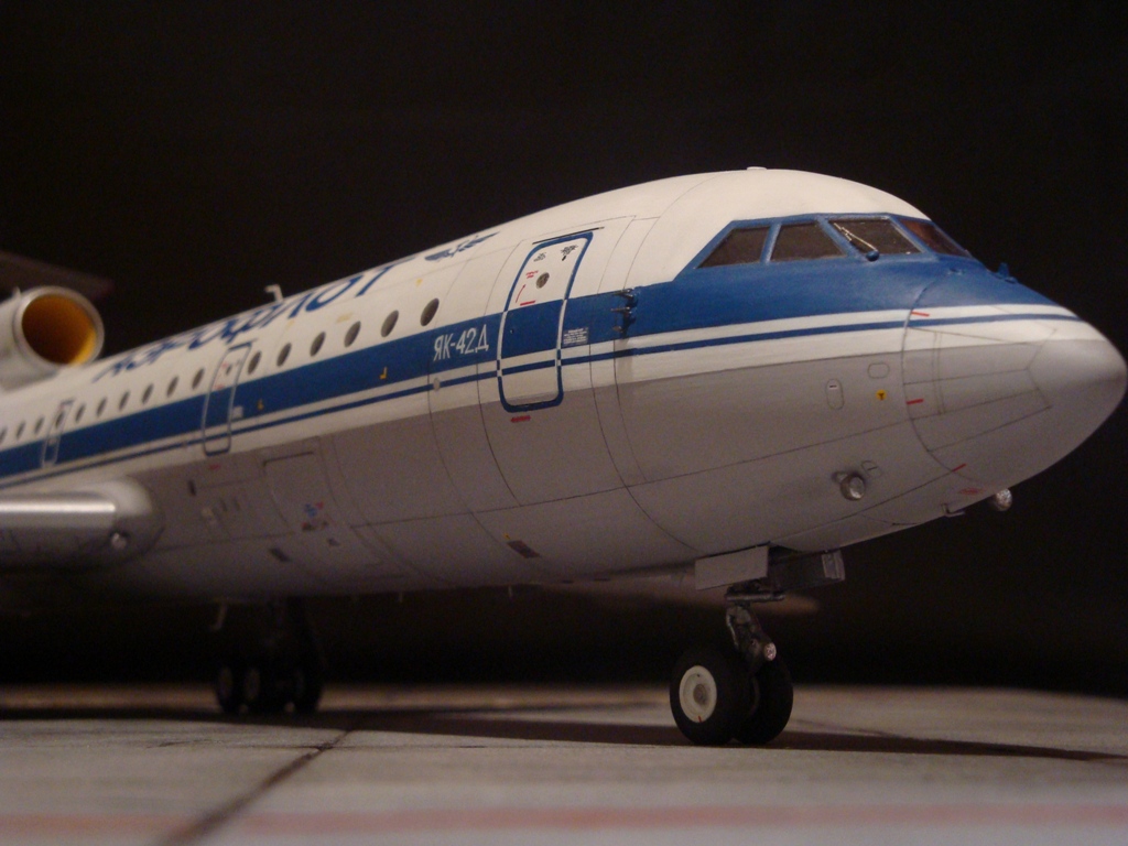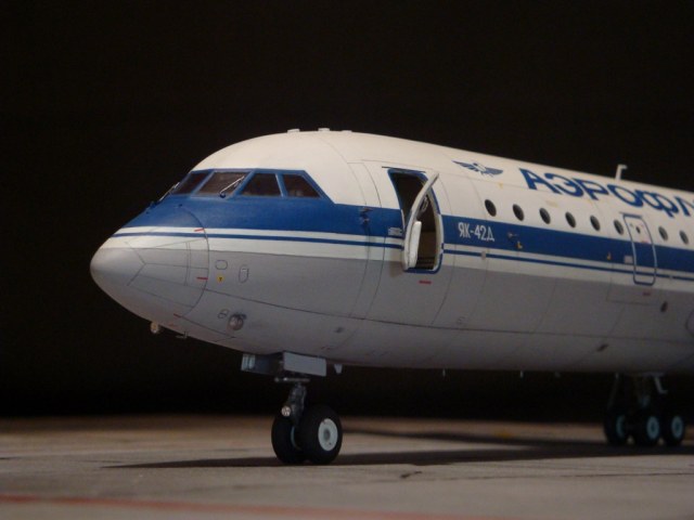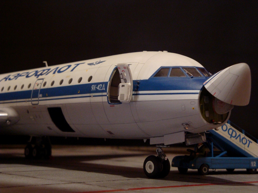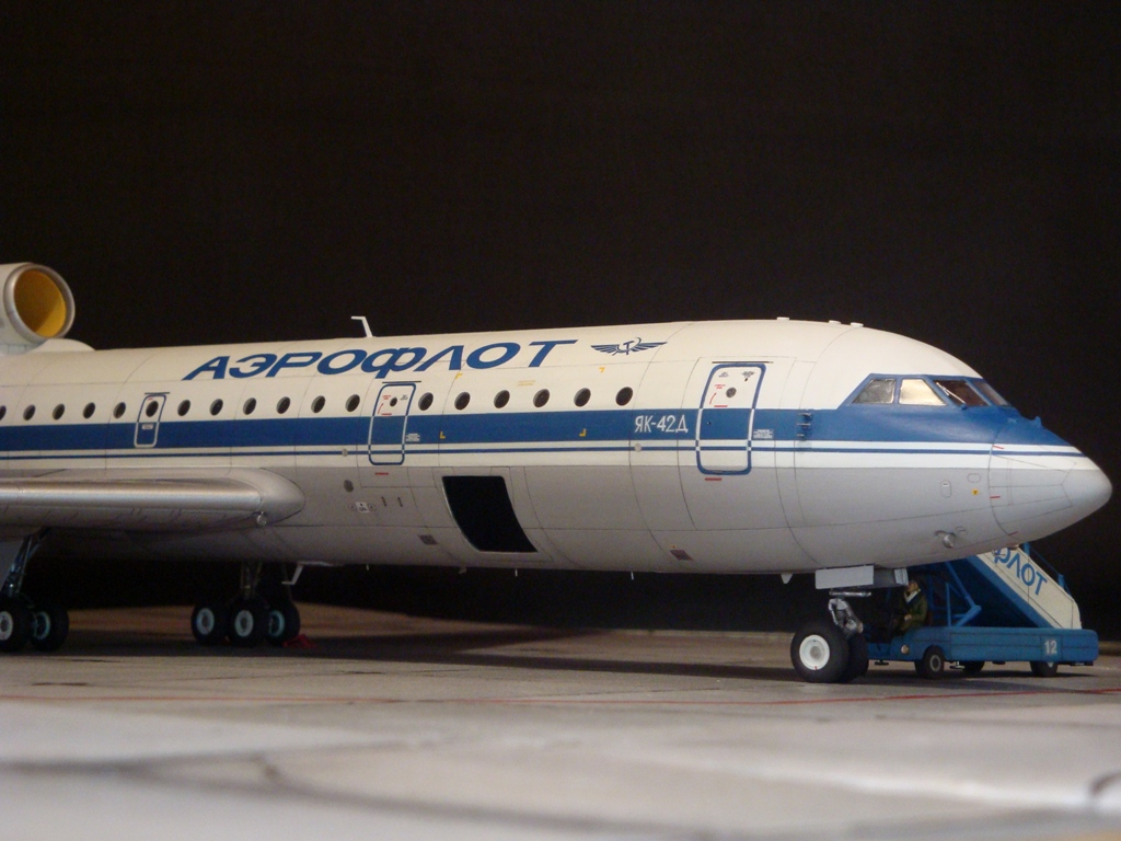 Добрый день! Друзья, хочу предложить вашему вниманию свежую работу Як-42Д от "Амодел". Давно мечтал собрать этого лайнера, да всё не было подходящего масштаба. Модель новая, я брал её ещё в прошлом году, буквально выцарапал её из рук поставщика "амодел". Приятная в сборке, если не считать моих доработок. Еле вмонтировал я все премудрости в эту смоляную болванку (поэтому я и не люблю смолу), но это заказ так, что ... Декаль, самодельная, "Амодел" как всегда пожадничал насчёт вариантов авиакомпаний. Пневматики от "Экипаж". Ну и, конечно, очумелые ручки.