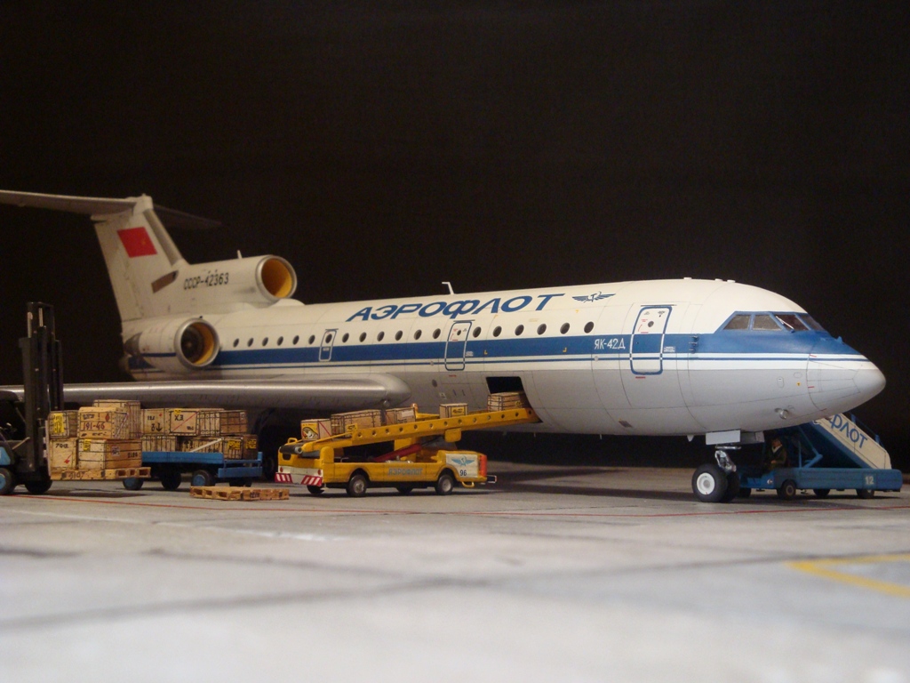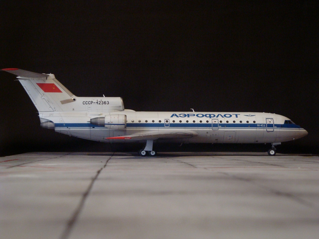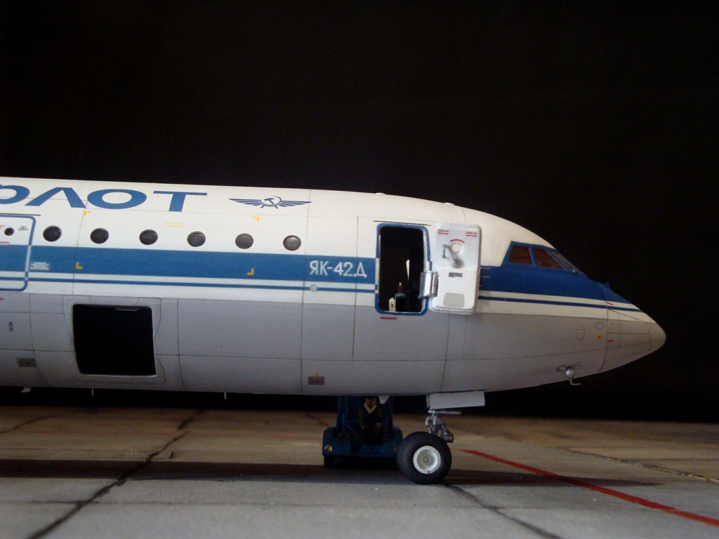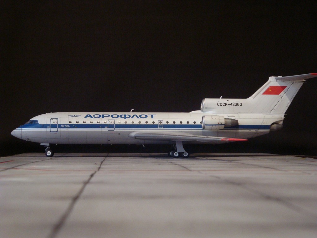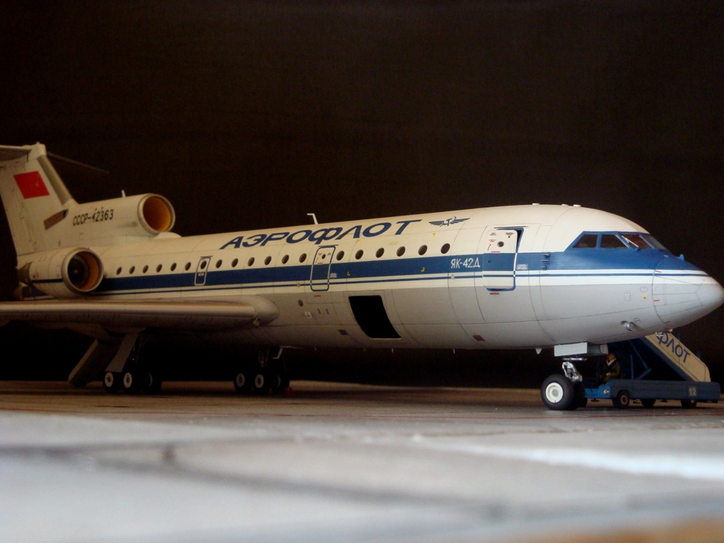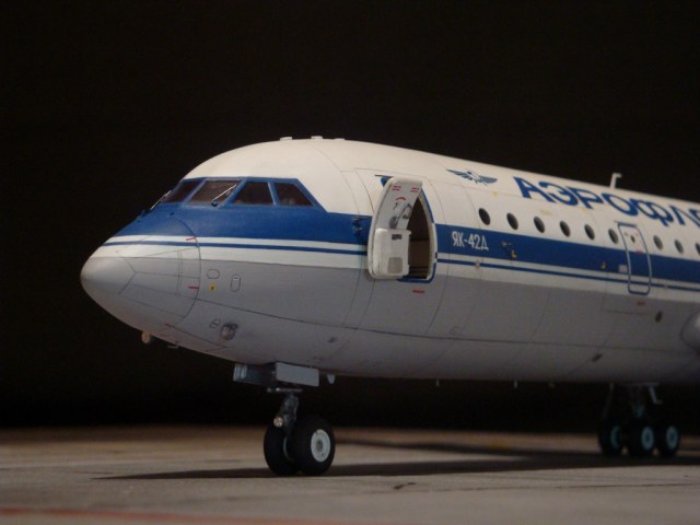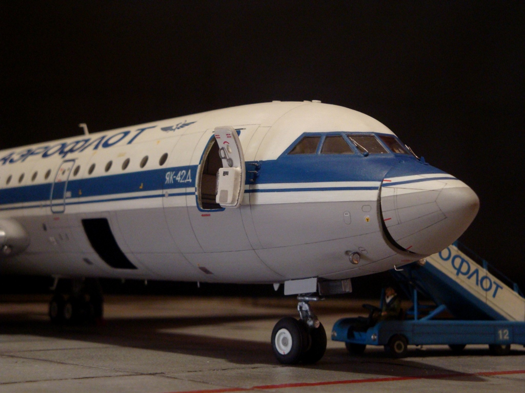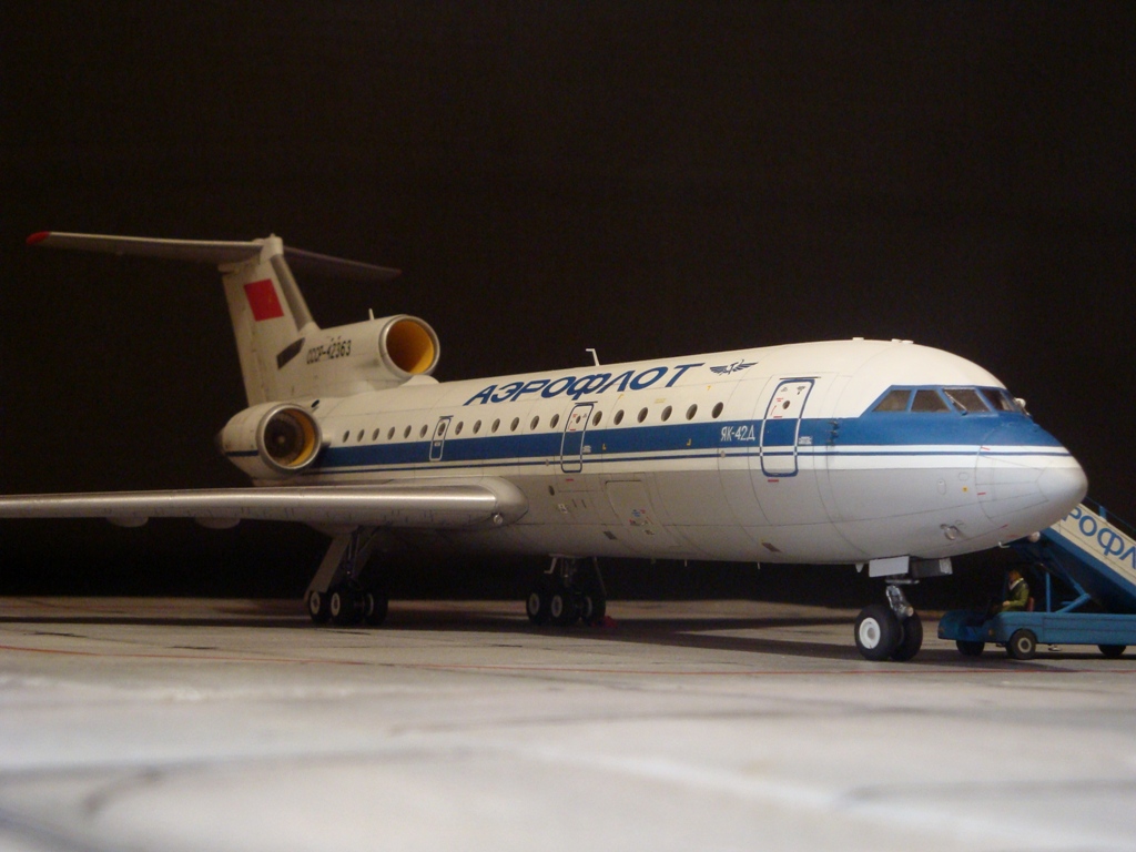 Добрый день! Друзья, хочу предложить вашему вниманию свежую работу Як-42Д от "Амодел". Давно мечтал собрать этого лайнера, да всё не было подходящего масштаба. Модель новая, я брал её ещё в прошлом году, буквально выцарапал её из рук поставщика "амодел". Приятная в сборке, если не считать моих доработок. Еле вмонтировал я все премудрости в эту смоляную болванку (поэтому я и не люблю смолу), но это заказ так, что ... Декаль, самодельная, "Амодел" как всегда пожадничал насчёт вариантов авиакомпаний. Пневматики от "Экипаж". Ну и, конечно, очумелые ручки.