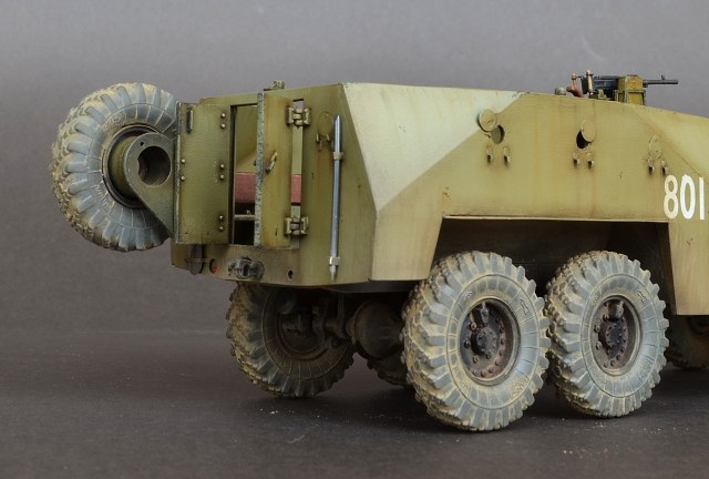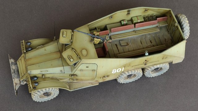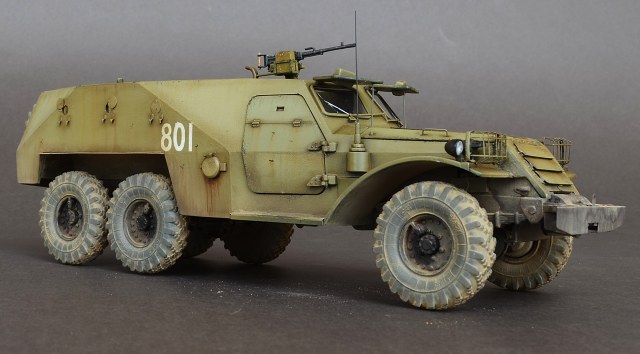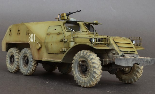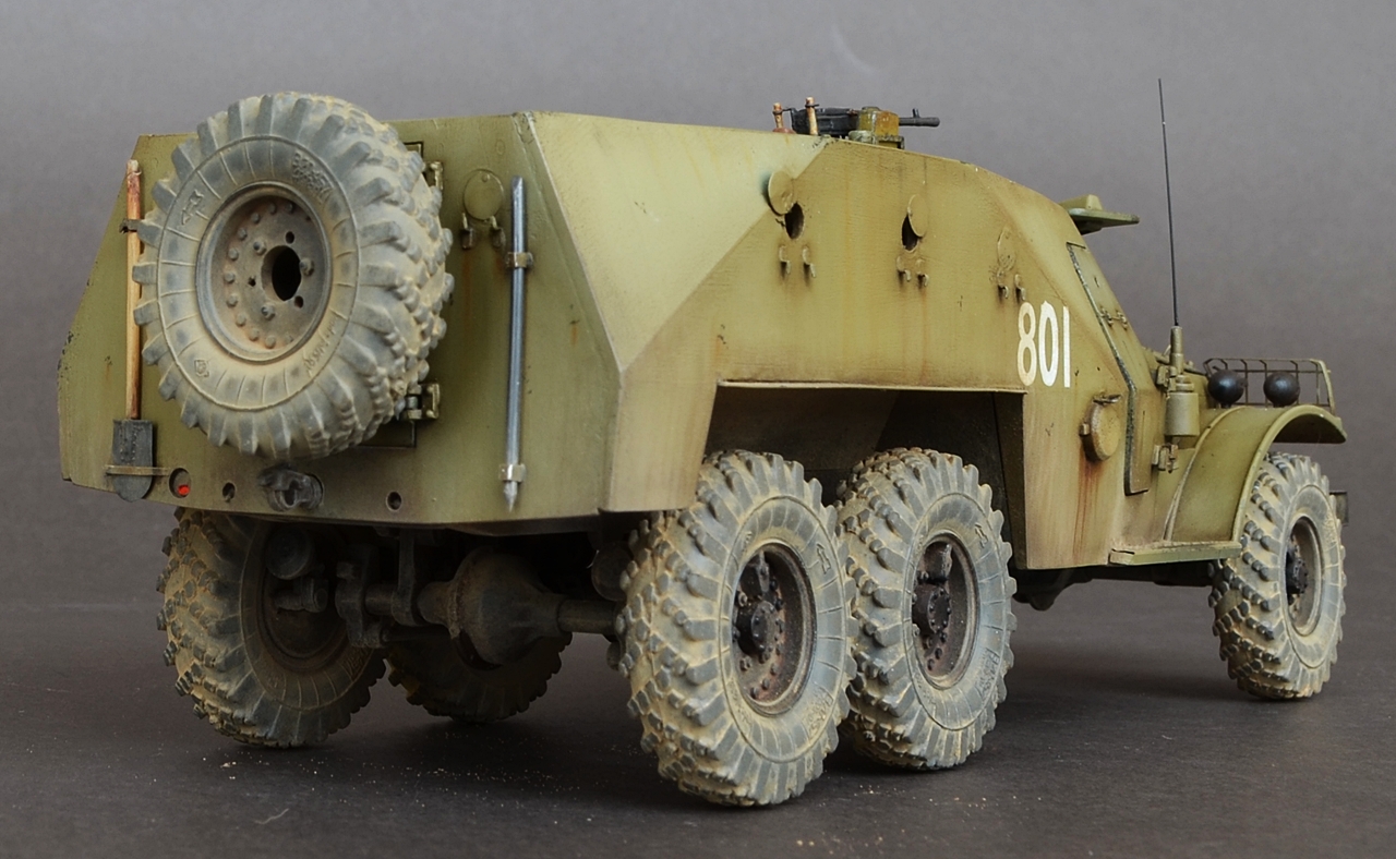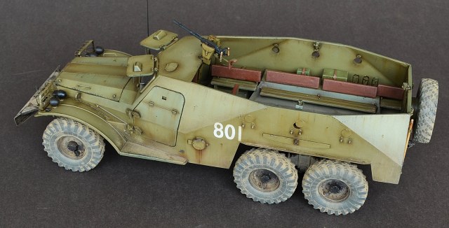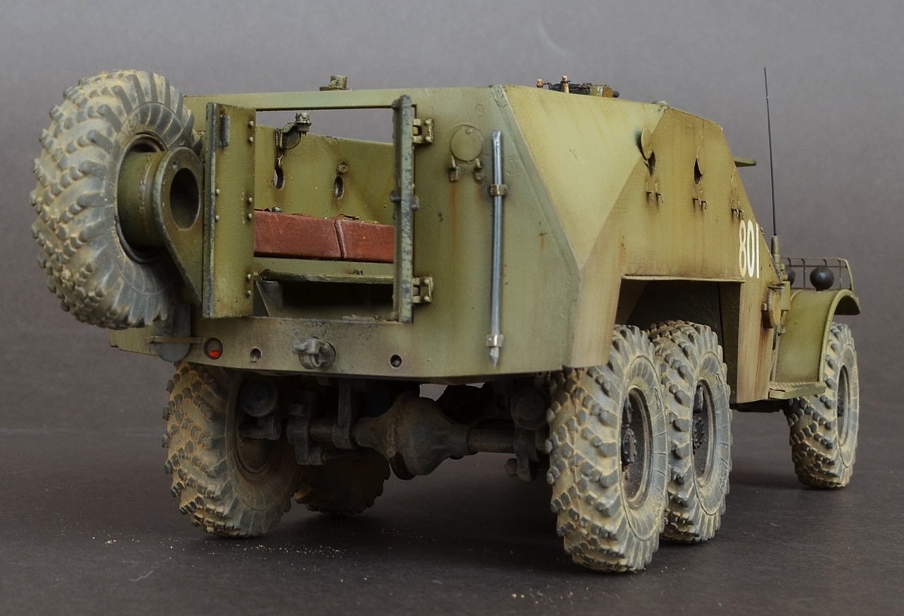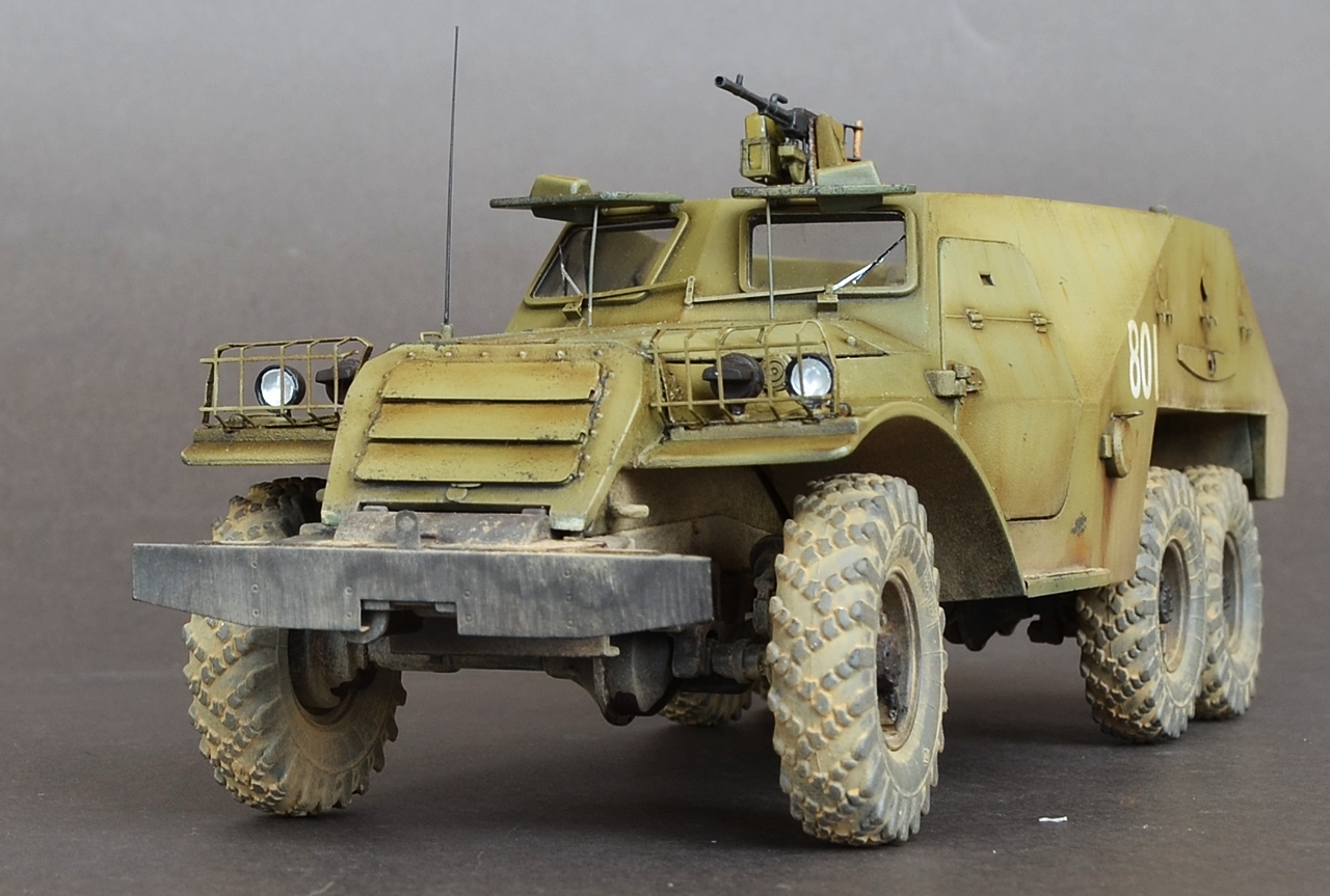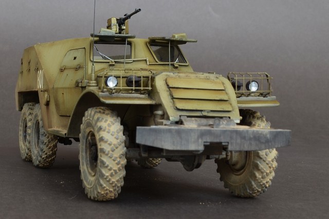 - Пару слов о сборке.Из дополнений использовал травление Эдуард.Оно конечно немного улучшило внешний вид модели но сильно модель не изменилась.Все кто сталкивался с этим набором знает что доведение этой модели до приличного уровня равносильно постройке новой модели.Странно что китайские товарищи обошли стороной этот БРТ,хотя может быть когда нибудь они порадуют моделистов новой разработкой.От себя добавил антенный ввод,сделал открывающимися двери,сделал фары.Диски колес пришлось уменьшать по толщине и диаметру что бы они нормально сели в шины.Вставил стекло и сделал дворники.