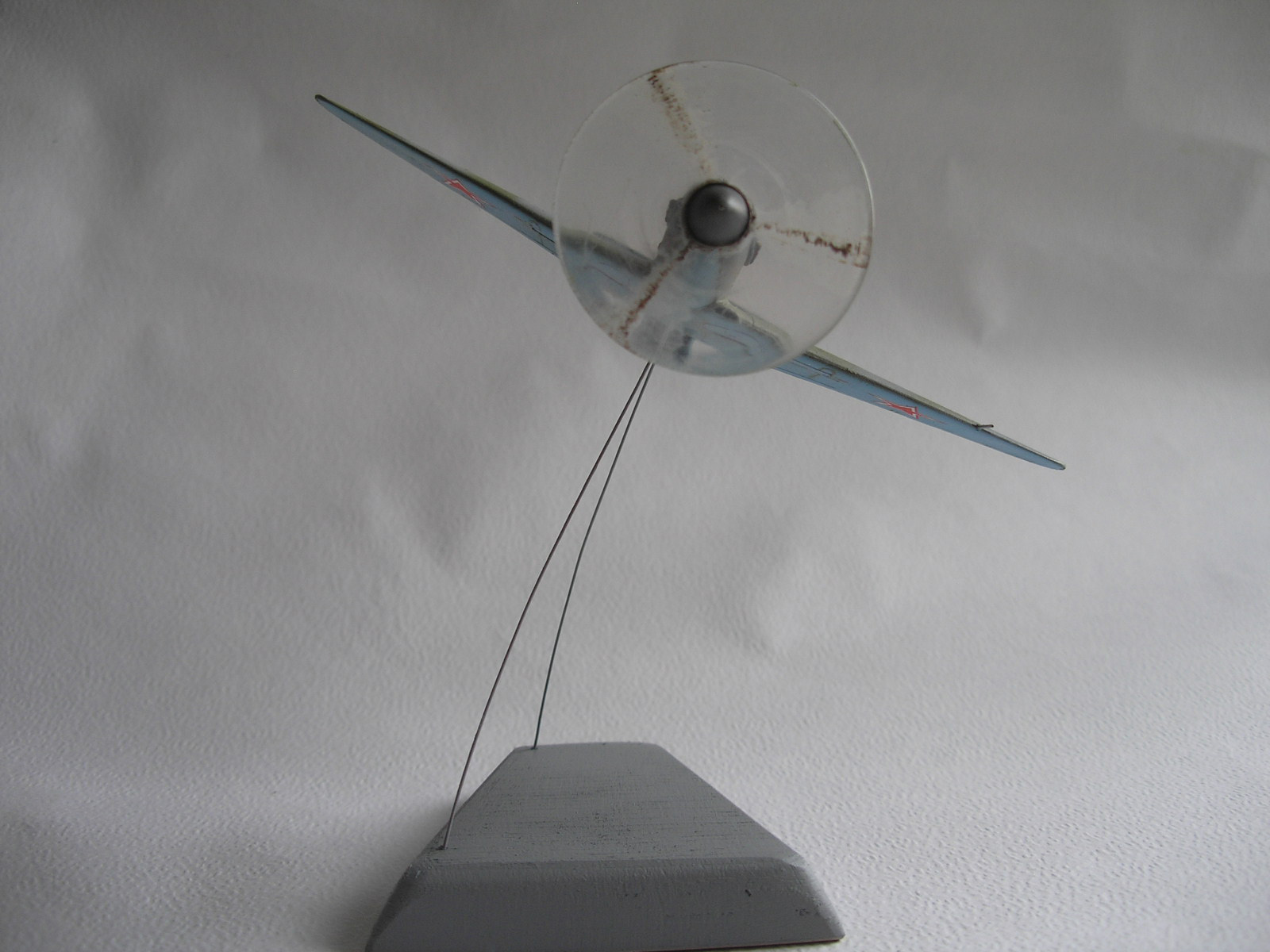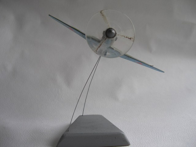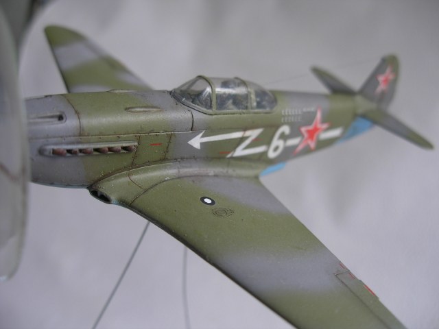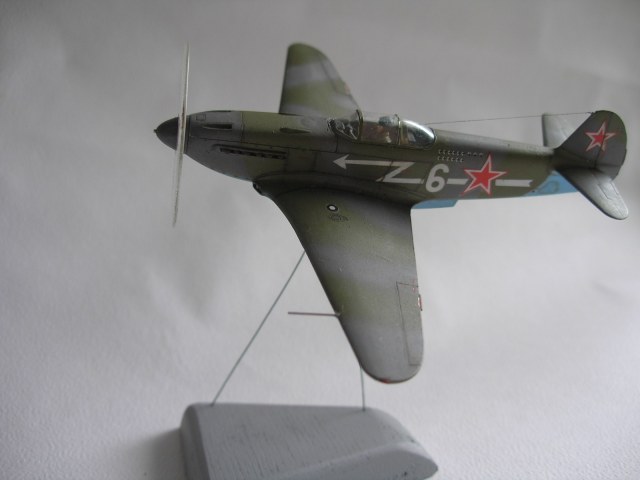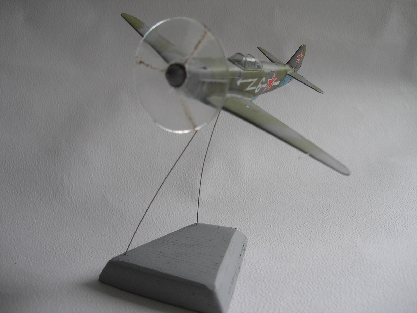 Для многострадального самолетика - вполне нормально. :-) На верхней полке пущай глаз радует! (Хотя изначально при окраске - цвета не те. Ну нету на Як-3 зеленого, нету! Во всяком случае на Як-3 Нормандии-Неман). Сергей, для пущей красивости, покрасьте ему кок в триколор. Т.к. "винт вращается" можно особо четко границы не воспроизводить, и даже маркерами это сделать.