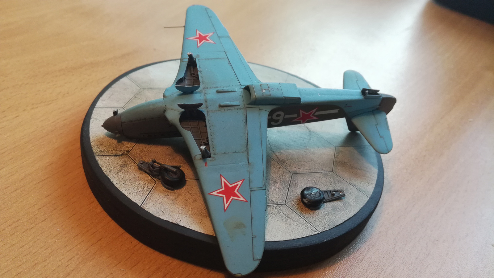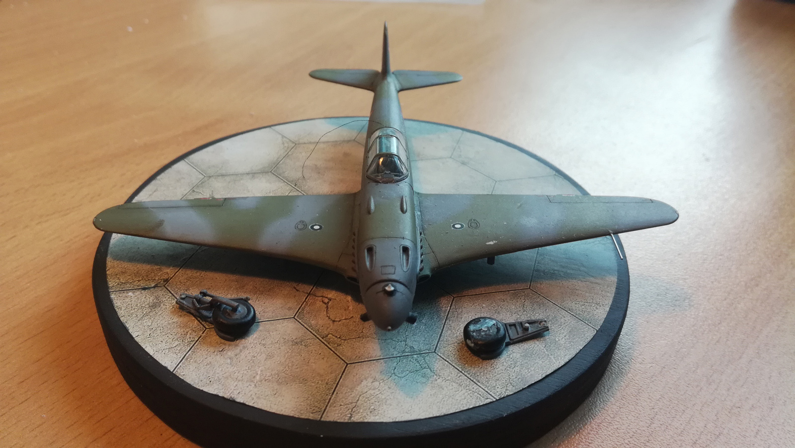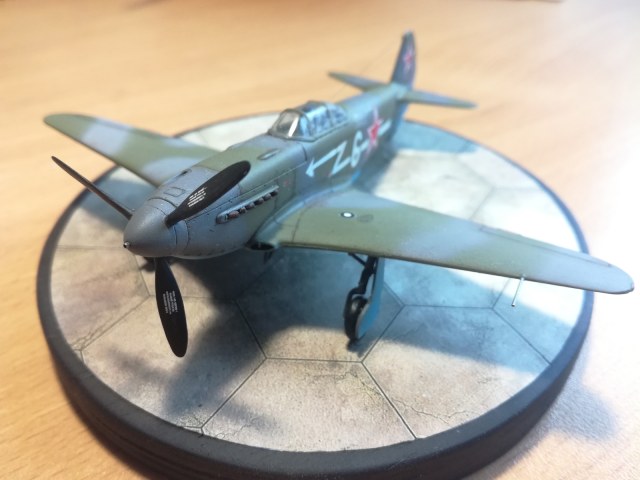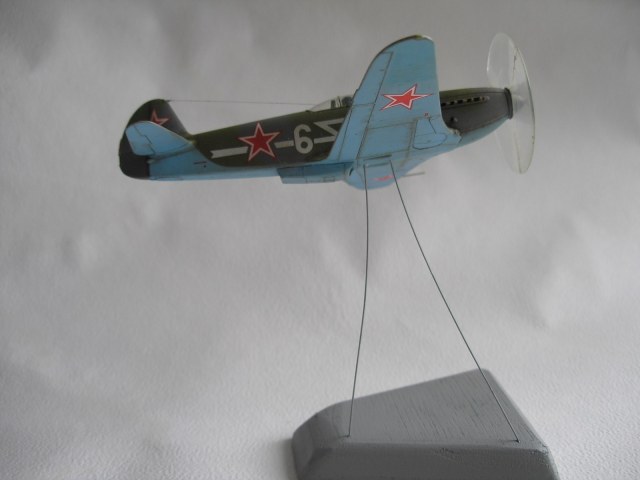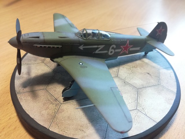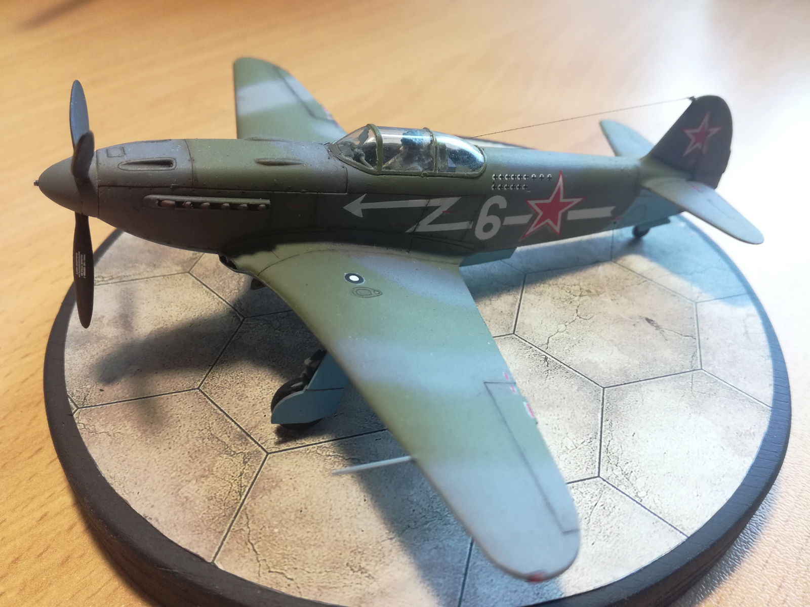 Для многострадального самолетика - вполне нормально. :-) На верхней полке пущай глаз радует! (Хотя изначально при окраске - цвета не те. Ну нету на Як-3 зеленого, нету! Во всяком случае на Як-3 Нормандии-Неман). Сергей, для пущей красивости, покрасьте ему кок в триколор. Т.к. "винт вращается" можно особо четко границы не воспроизводить, и даже маркерами это сделать.
