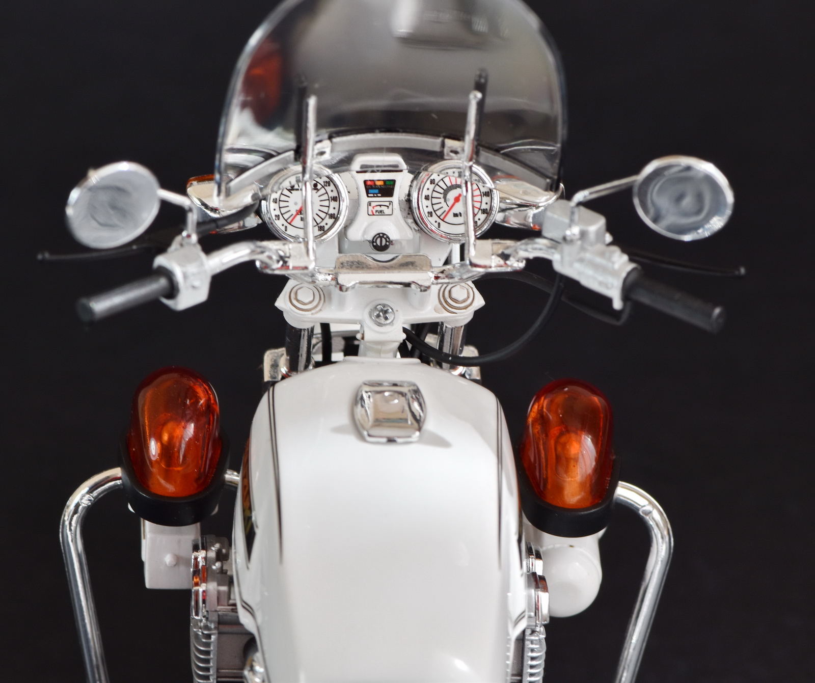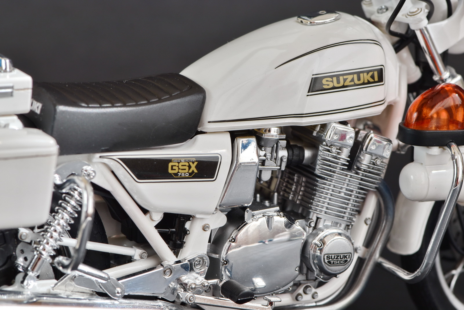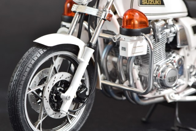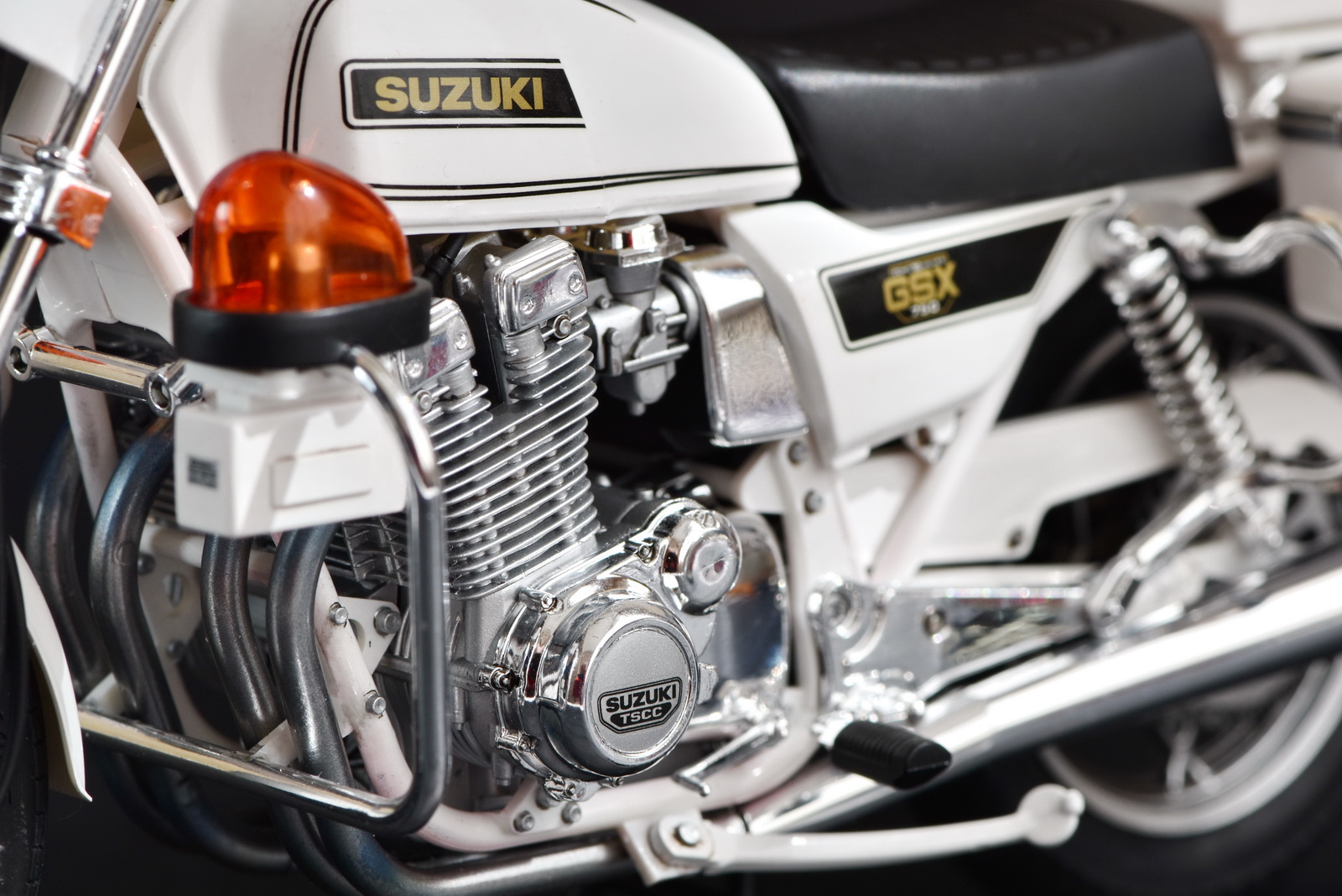 Представляю на Ваш суд полицейский мотоцикл Suzuki GSX750. Сборка мотоцикла принесла много проблем из-за низкого качества деталей. Не ожидал от Тамии таких дров: облои, следы толкателей, следы от пресформ. Половина деталей хромирована и на каждой следы пресформ. Удалять и подкрашивать серебряной краской не вариант. Однако, пришлось счистить заводской хром с выхлопных труб, идущих из двигателя, потом красить Адкладом, но блеска заводского получить не удалось. Стыковка ужасная, особенно двигателя. Отверстия для стыковки деталей большие и приходилось разными способами фиксировать детали и оставлять на длительное время для затвердения. Вилка в оригинале была полностью хромированной, использовал маски для нанесения соответствующей краски. Не удачно получилась антенна, вечером была ровная, утром кривая. Замки и петли красил тамиевским TS-83, модель покрывалась лаком TS-13, использовалась тамиевская полировочная паста. На колесах обод красился серебряным маркером (хорошая вещь, рекомендую).