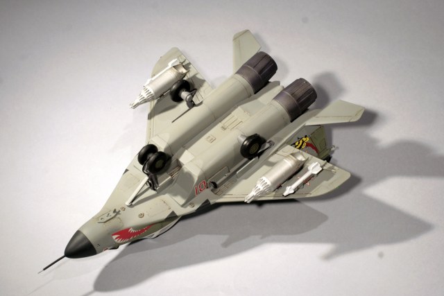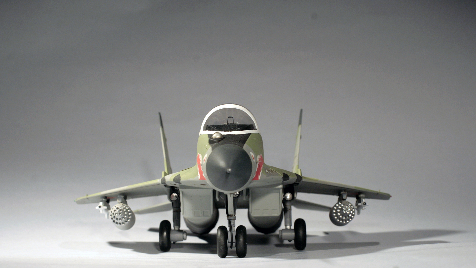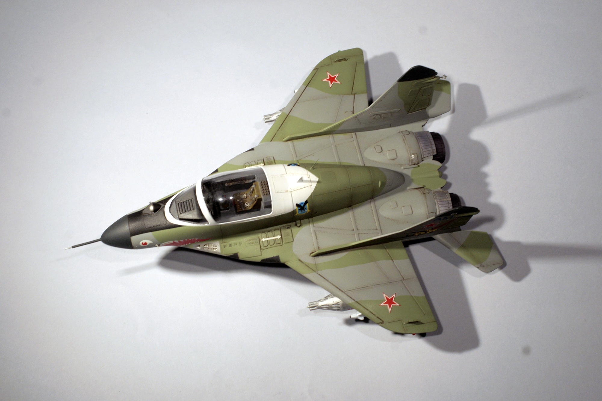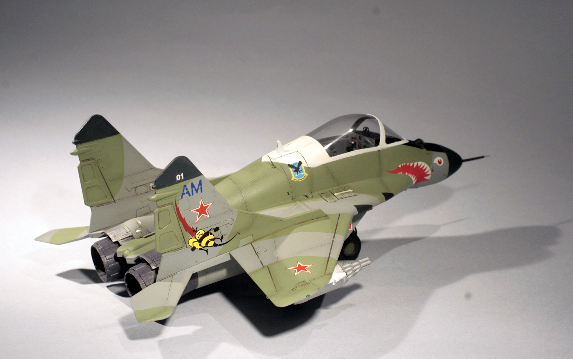 Покраска тоже не заняла много времени. Сначала я задул радиопрозрачные части темно-серым RLM66 от Pacific88, а фонарь сначала задул в серый интерьерный, а потом — в белый цвет. Из попавшихся под руку цветов от Тамии и Ганзы(причем цвета были немецкие, всякие RLM) прямо в бачке аэрографа я последовательно намешивал и надувал нужные цвета, с промежуточной просушкой в пару часов. Камуфляж задувал через маски из скотча Tesa, по расшивке потом проходился чуток затемненным базовым цветом, эдакое подобие постшейдинга. В финале задул сопла в цвет горелого метала. В качестве прототипа я решил выбрать известный борт с авиабазы Мары, с пастью и шершнем на хвосте.