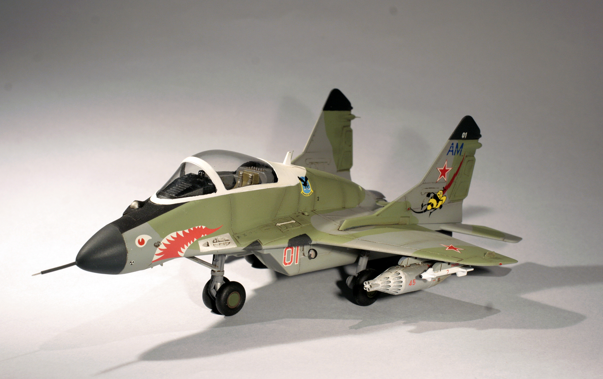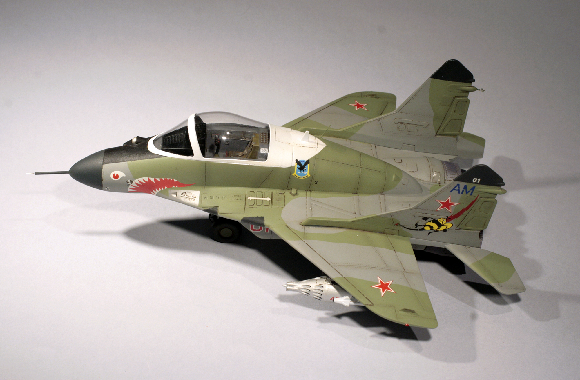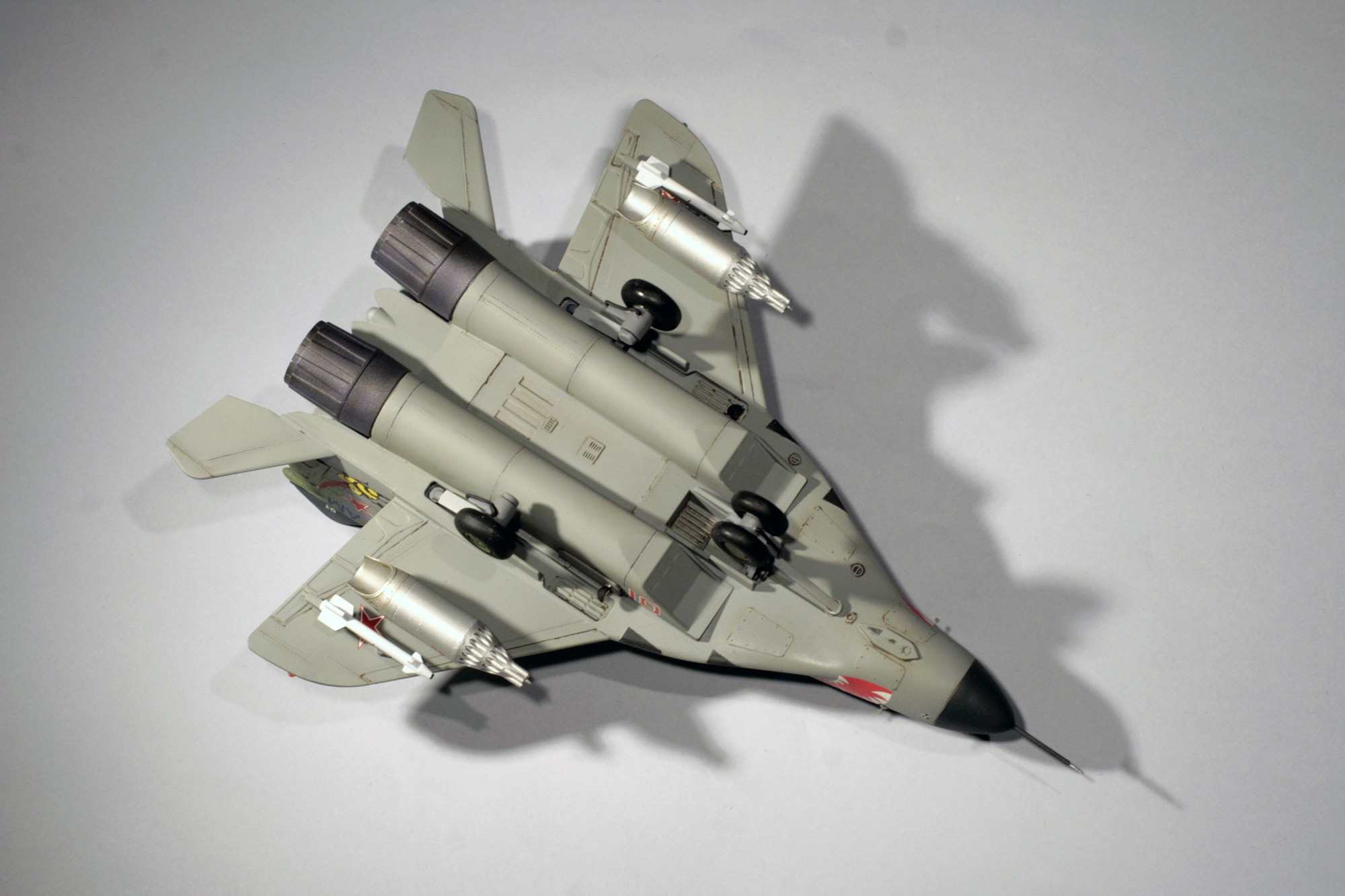 Так что модель была оперативно приобретена, а из закромов было извлечено фототравление на Миг-29СМТ от Микродизайна, НУРСы в 1/48 от AMIGO(крупный масштаб для сохранения утрированных пропорций), и куплены декали в масштабе 1/72 (модель скорее ближе к этому масштабу по размерам) от Бегемота.