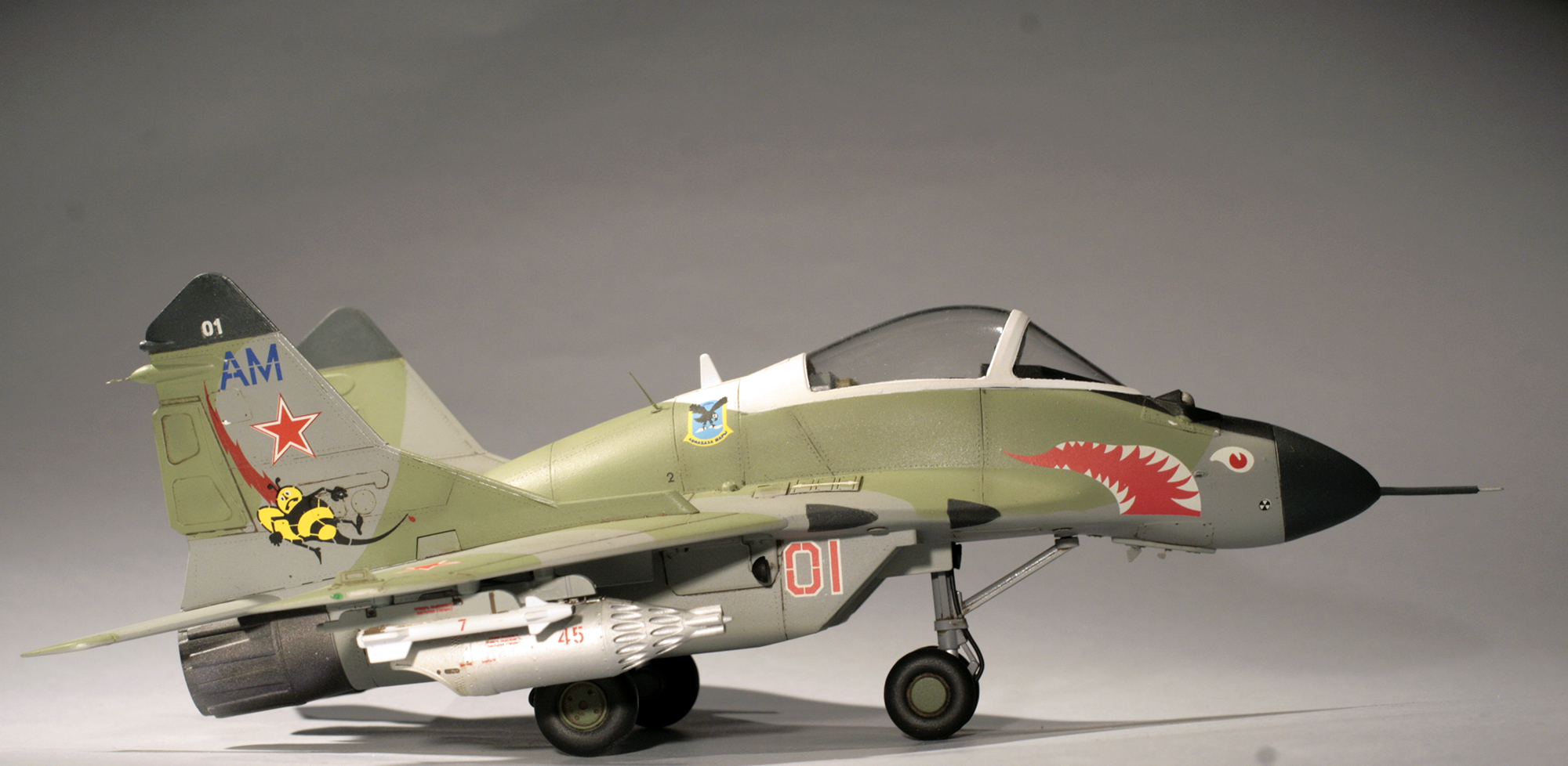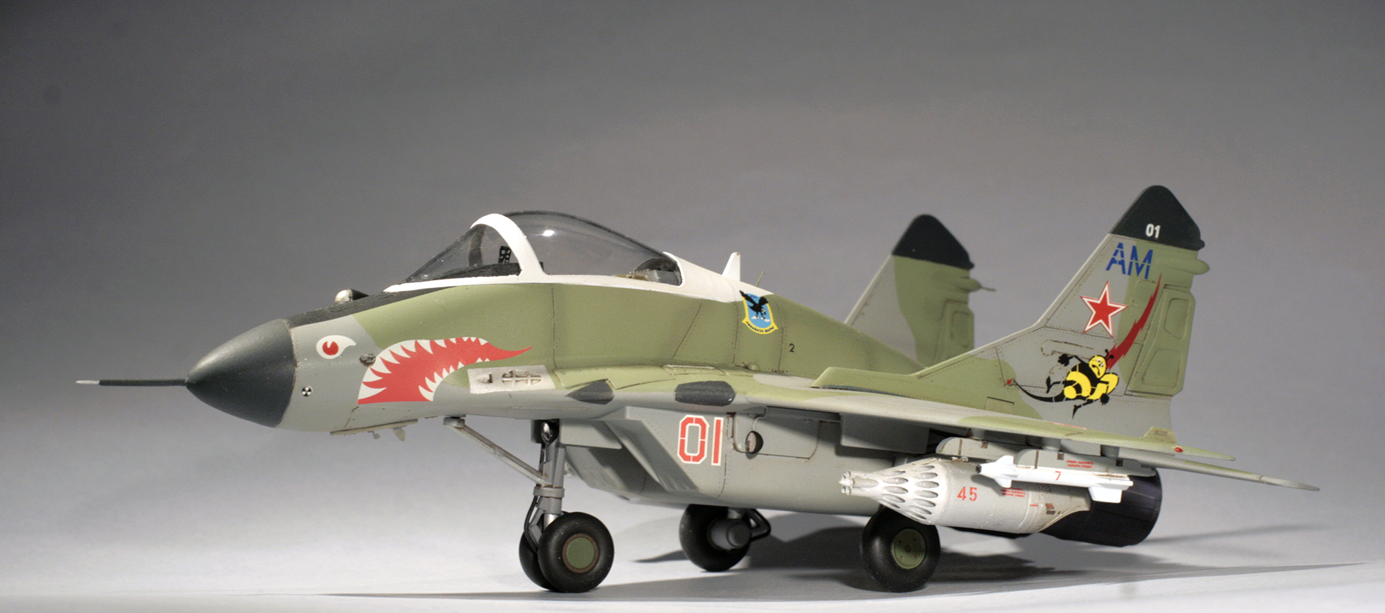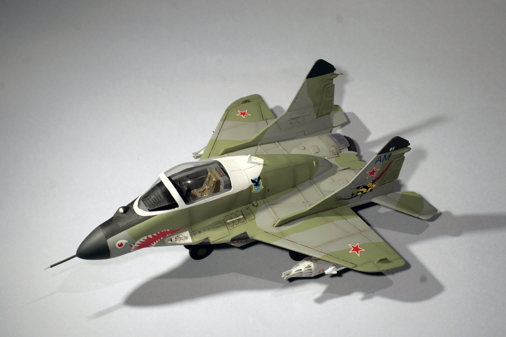 Так что модель была оперативно приобретена, а из закромов было извлечено фототравление на Миг-29СМТ от Микродизайна, НУРСы в 1/48 от AMIGO(крупный масштаб для сохранения утрированных пропорций), и куплены декали в масштабе 1/72 (модель скорее ближе к этому масштабу по размерам) от Бегемота.
