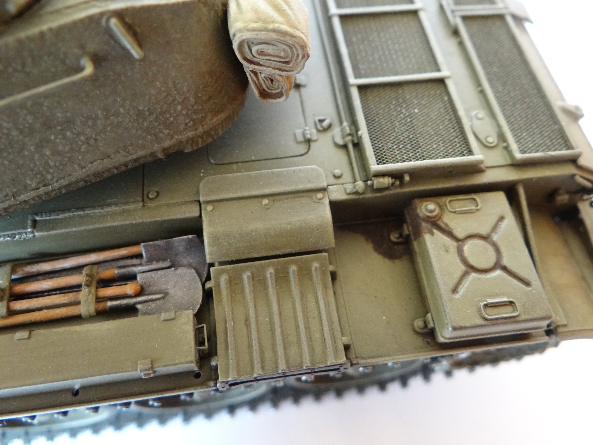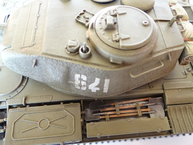 В сборке использовал тросы и скатку от Эврики, ствол от Мэджик модел. Гусеницы наборные, собрались куда лучше, чем предыдущие 34-рошные. Бревно, это просто пластиковый пруток, был заменен на натуральное. Добавлены литьевые номера на ком. башенку и маску пушки. Ну и как обычно борьба с Миниартовскими сварными/литьевыми швами на башне и на носу… их значительно уменьшил.