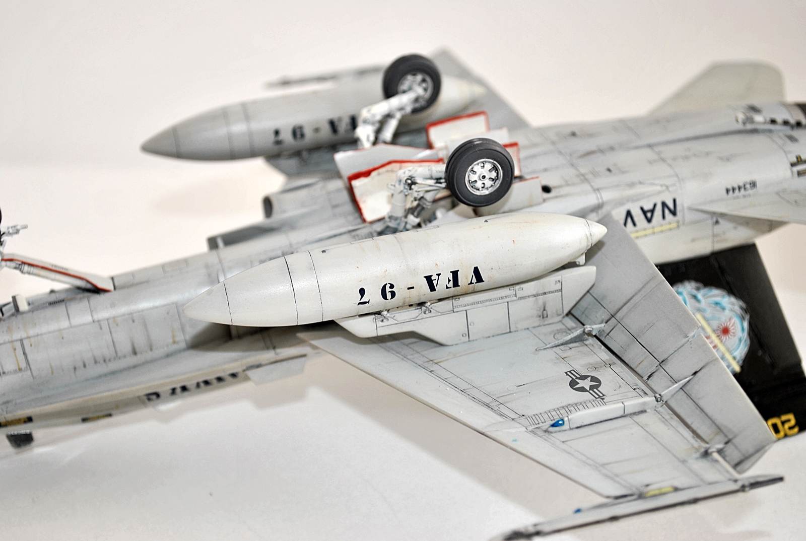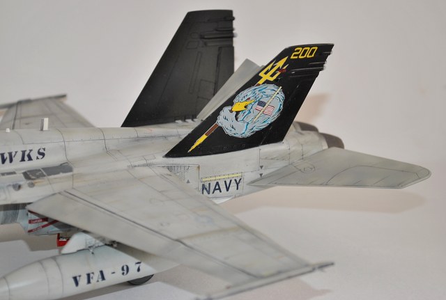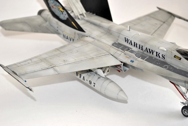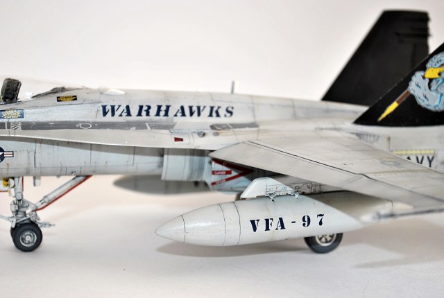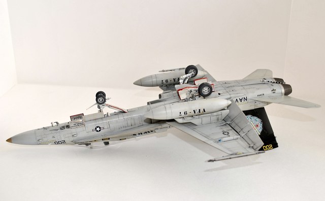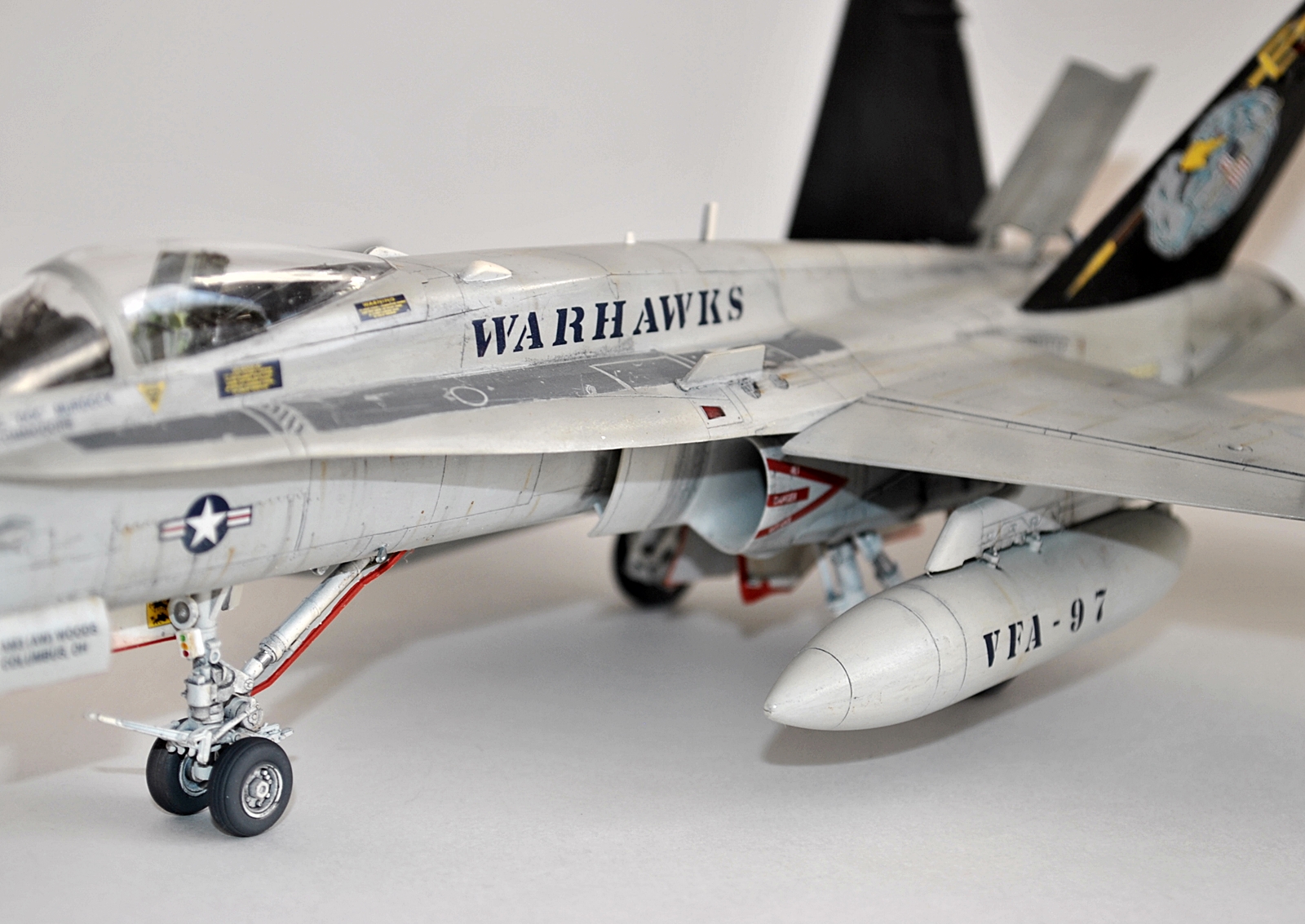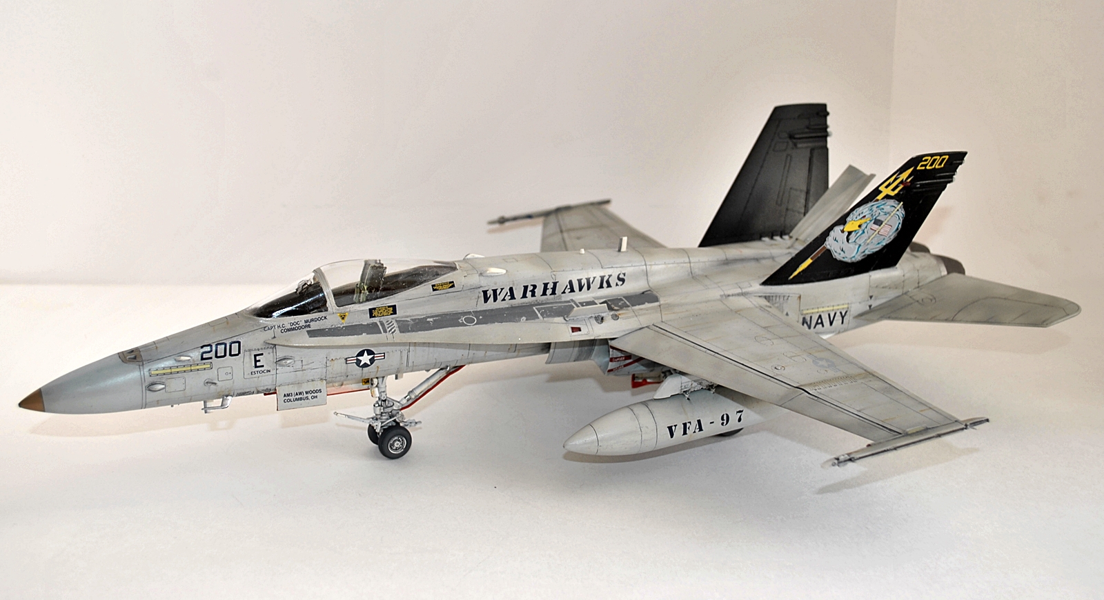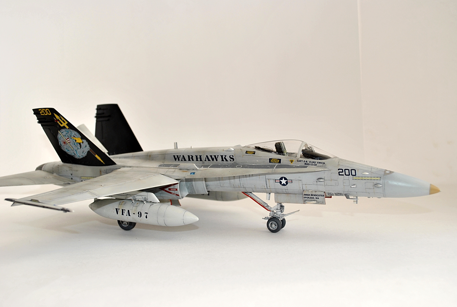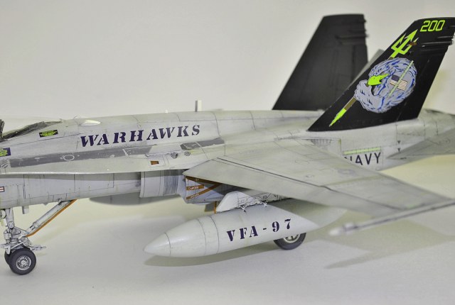 О самом борте-за основу был взят F/A-18C#163444, MAG-12 ,VFA-97"Warhawks",U.S.NAVY,2008 г .Информации по нему оказалось очень мало-за исключением фото на коробке еще 2 фото в такой же ливрее и еще 3 в разных вариантах окраски.Судя по имеющимся фото самолет за свою карьеру в основном использовался как демонстрационный образец и не нес прицельно-бомбового оборудования или оно было снято.По крайней мере самолеты из Blue Burds максимально облегчены,в том числе и за счет электронного оборудования.