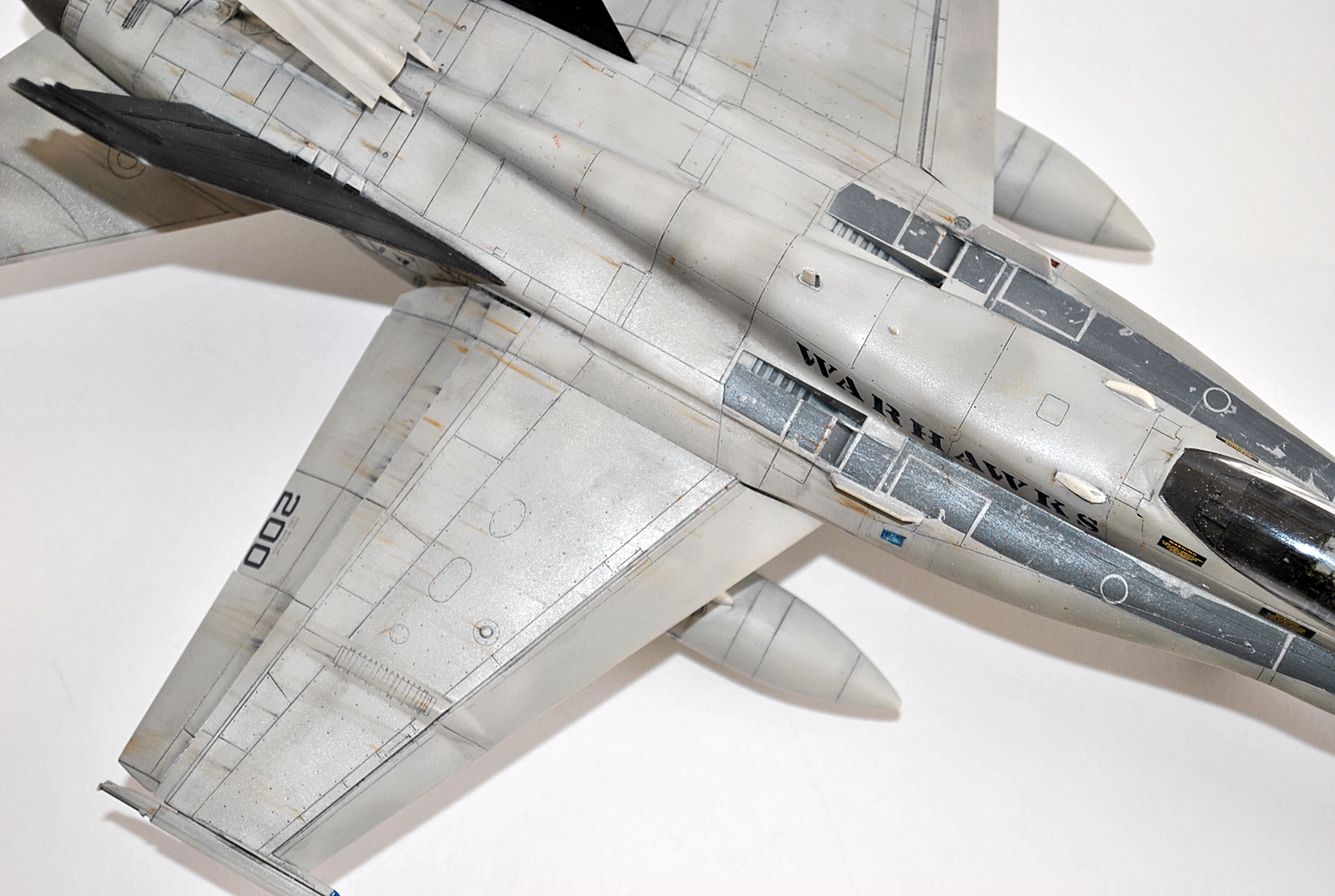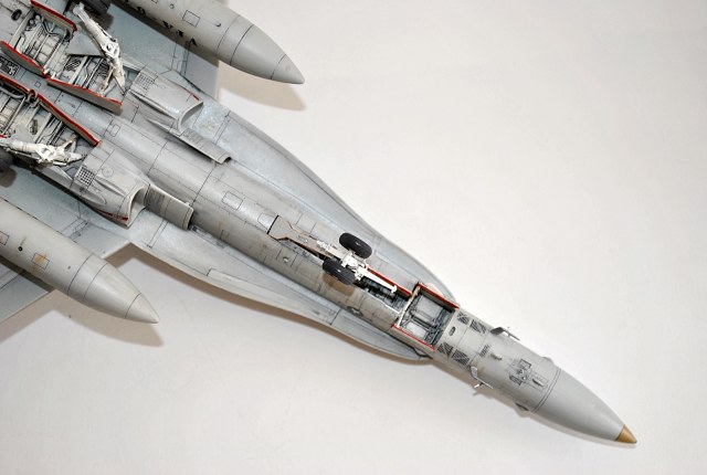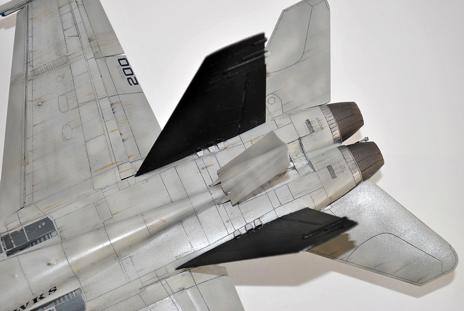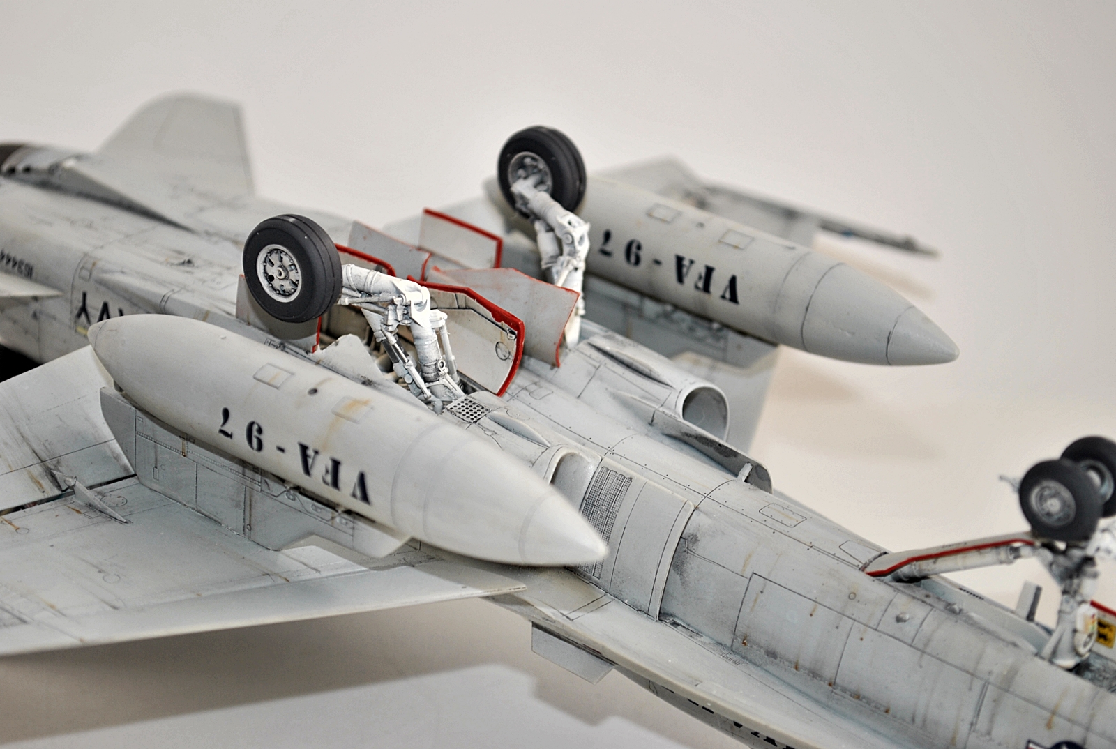 Я заранее извиняюсь, но на что смотреть в Вашем самолете? Такая же мешанина с модификациями. Есть промахи с прочей матчастью. Серьёзный косяк с подвеской. Сама модель, извините, грязная до невозможности, а не тонирована, даже принимая во внимание, что летавший палубник. Совсем не образец для ориентира.