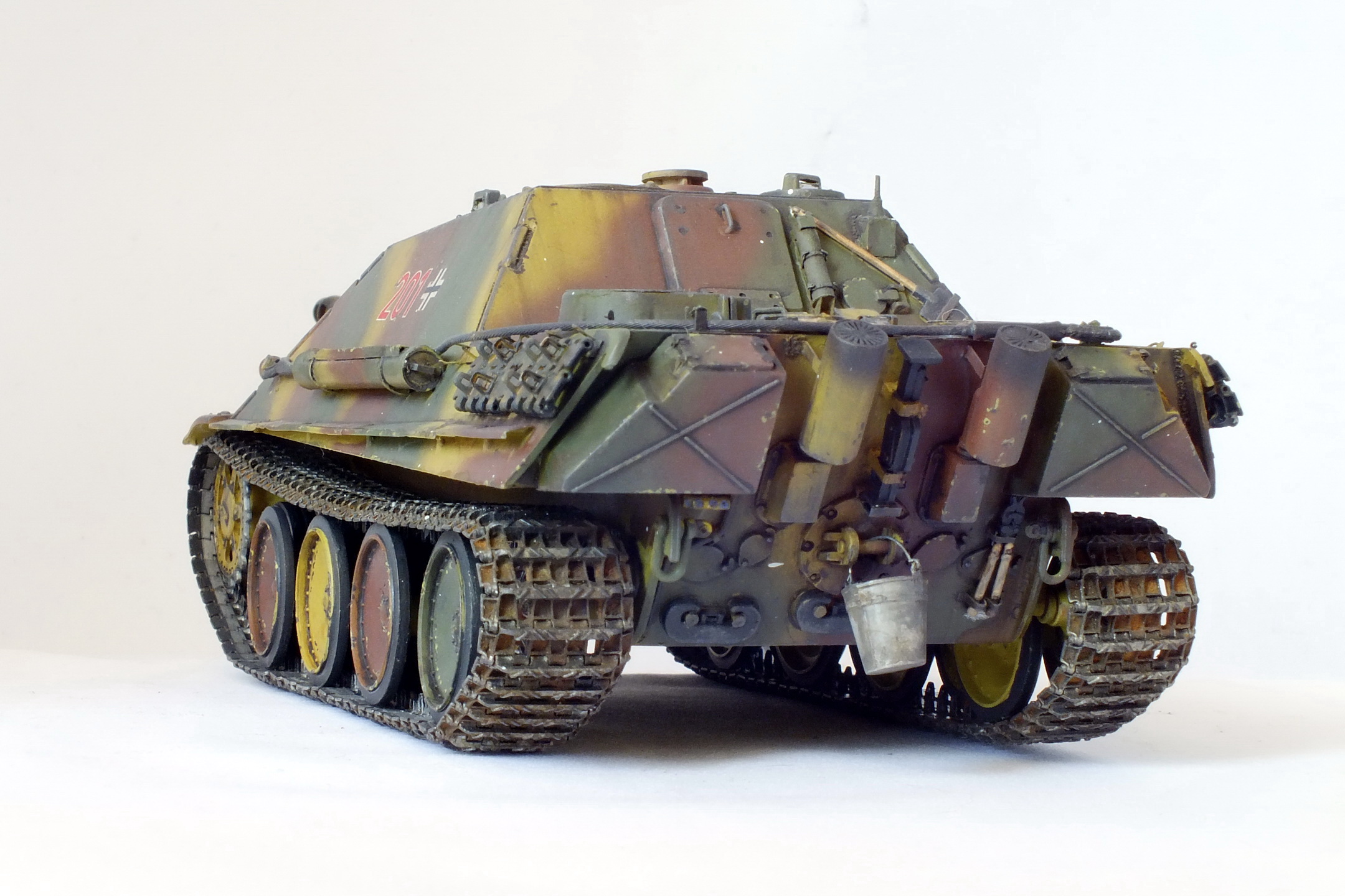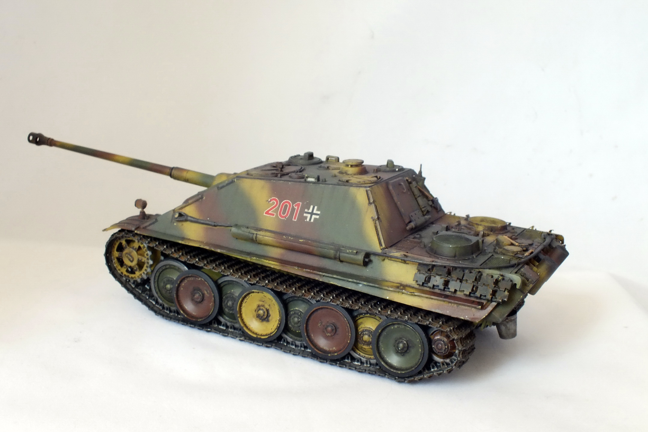 Странно покрашены гусеницы с внутренней стороны. Я про металлик. Правая гусеница неестественно топорщится у ведущей звезды. Про мат. часть не говорю. В целом модель смотрится хорошо.