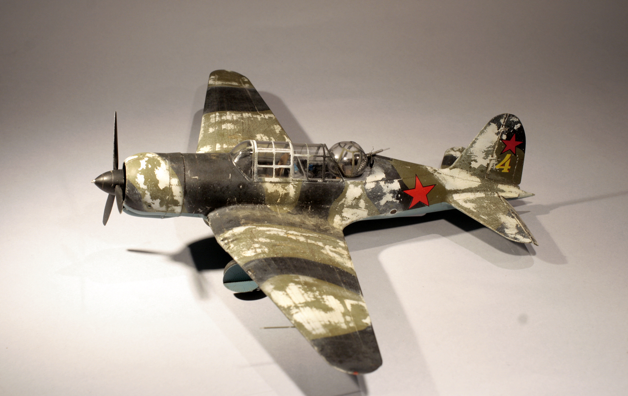 Из десятков схем окраски из декали Бегемота я решил выбрать какой-нибудь оригинальный. Большинство Су-2 в зимнее время несли белую краску только на хвостовой части фюзеляжа. Я же решил выбрать вариант окраски, которому приписывается нанесения белого цвета на все зеленые поля камуфляжа. В прочем по факту существует всего три фото прототипа с одного ракурса, где видно только серединную часть фюзеляжа, так что определенный простор для фантазии оставался.