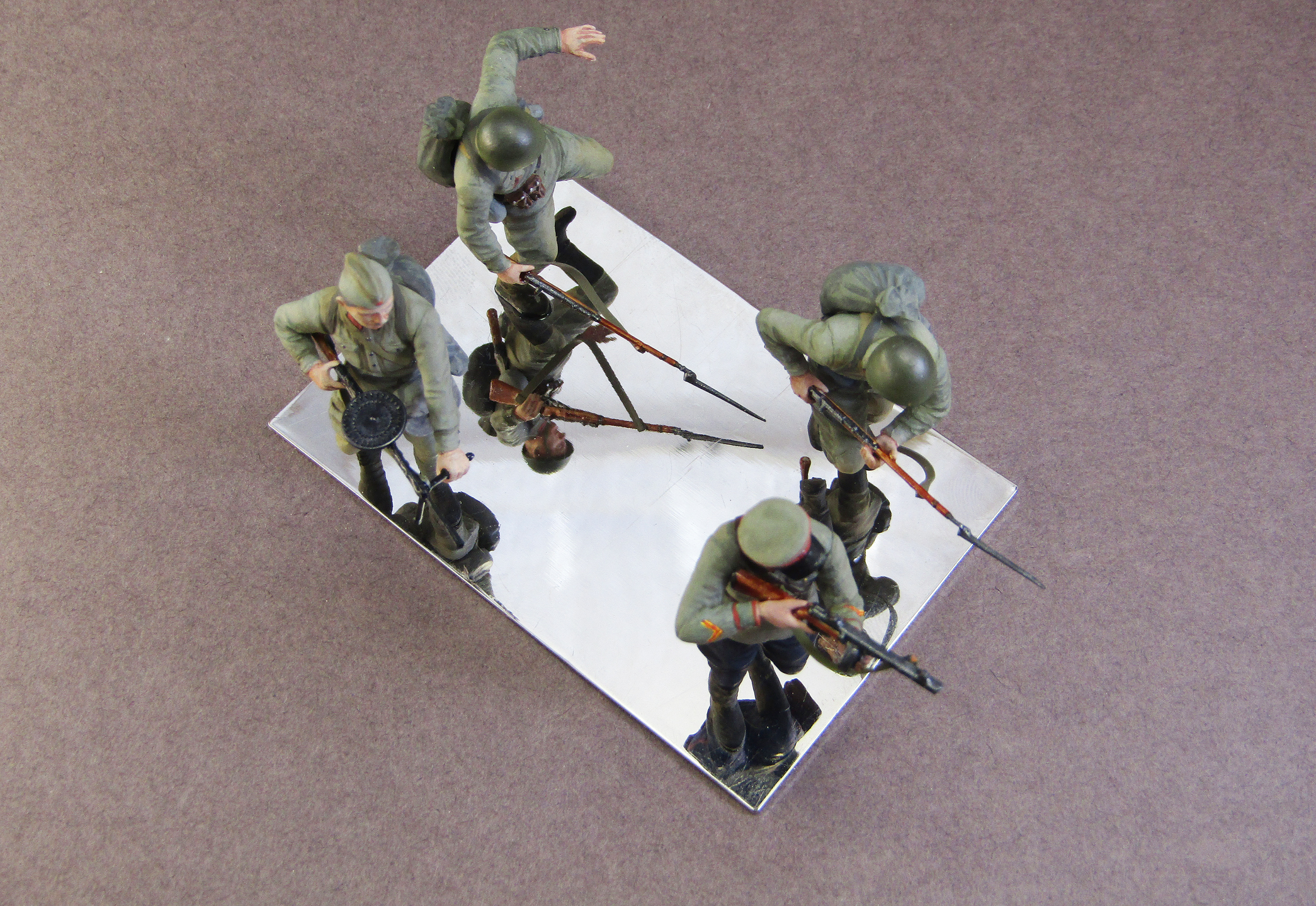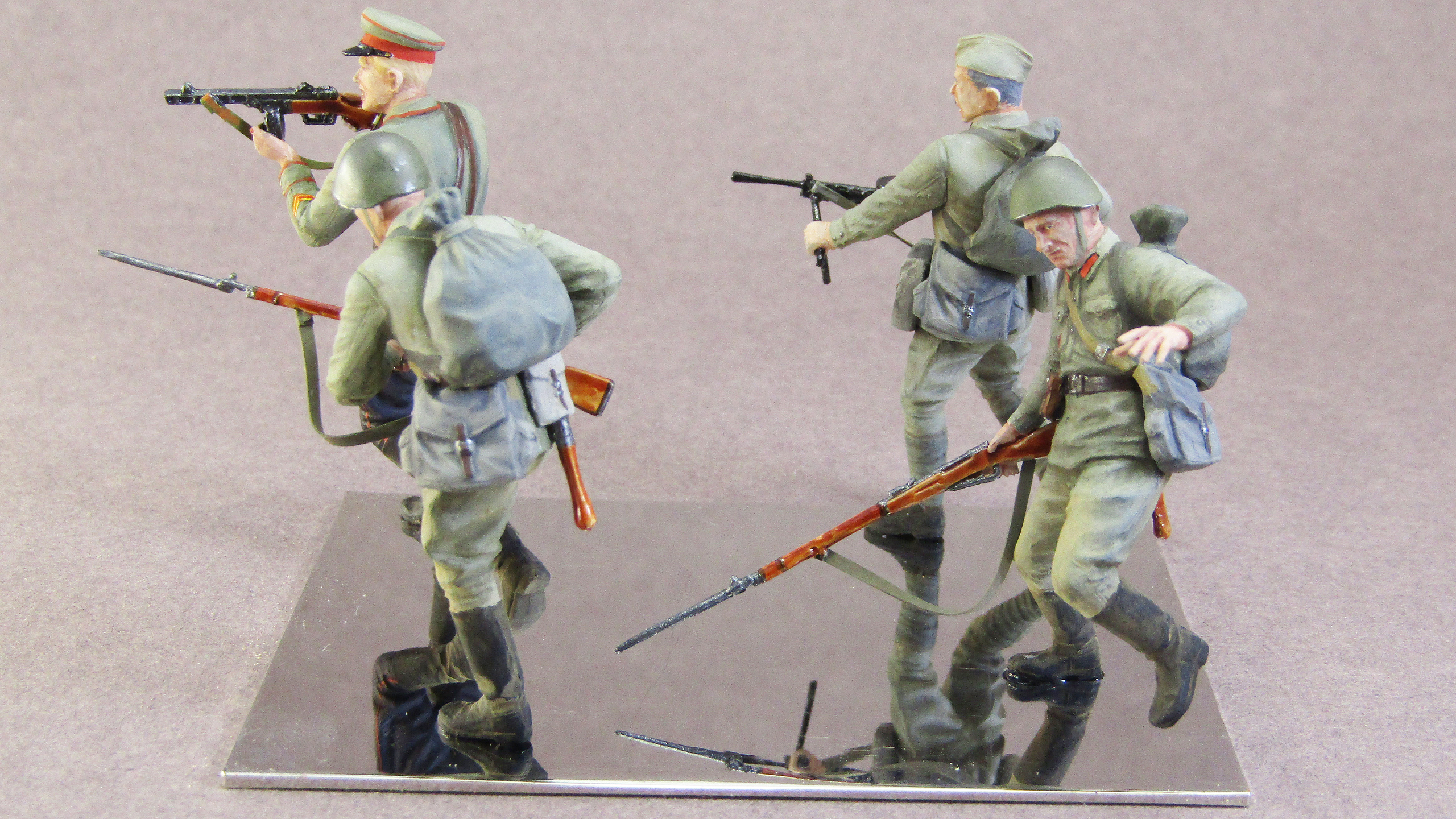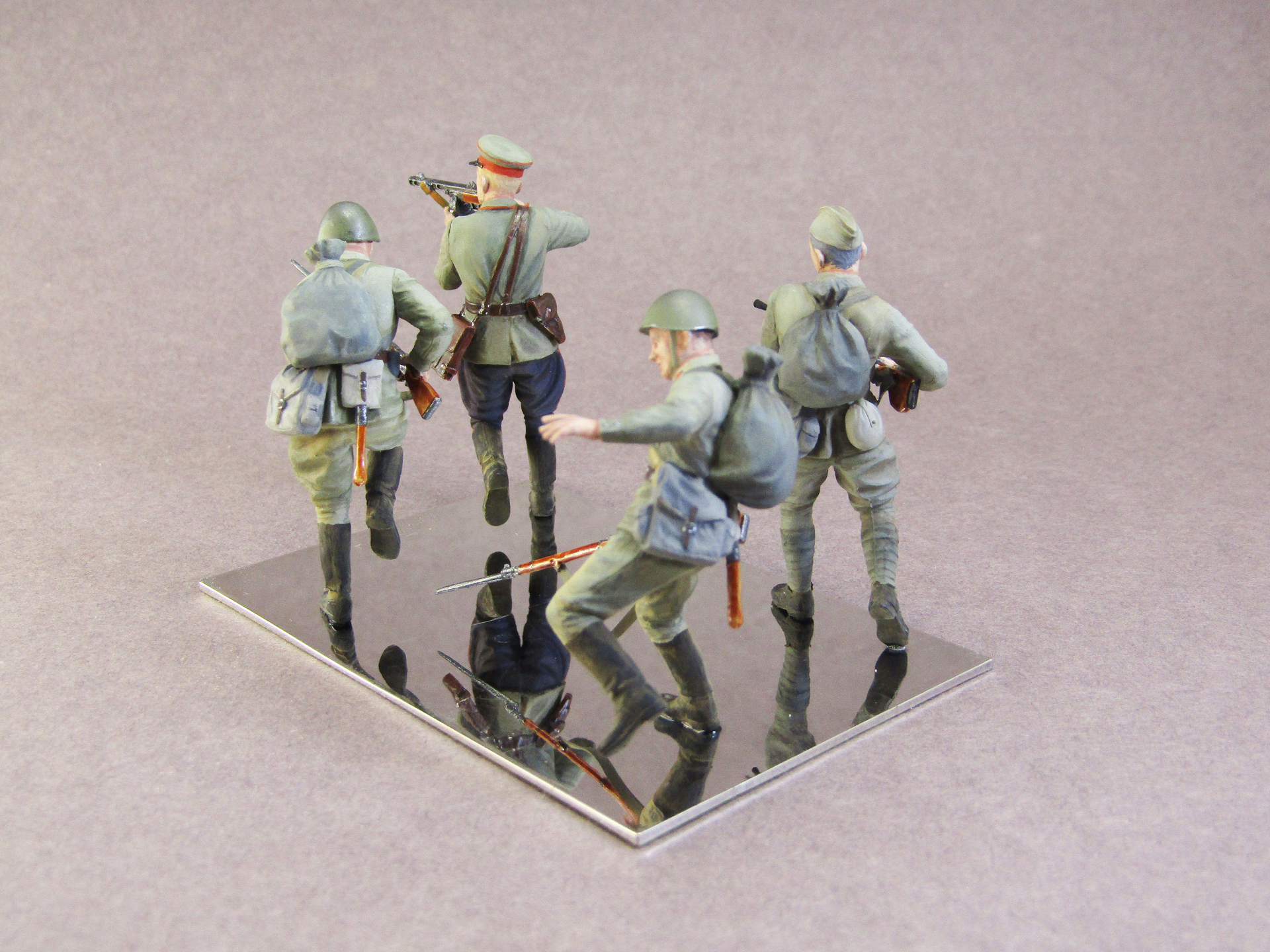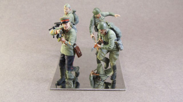 Интересно вышло. Мне понравилось в целом. Особенно лакирование деревянных частей оружия, а вот лакированные черенки лопат это по моему уже перебор. Ранение у падающего бойца по логике должно быть слева выше, а не там, где Вы его изобразили. Бегущий боец с винтовкой, вроде как оснащен серым подсумком, но такие были вроде только у моряков, а армия снабжалась "зелеными". Опять таки сержанская сумка у командира. Это конечно больше к производителю претензия.