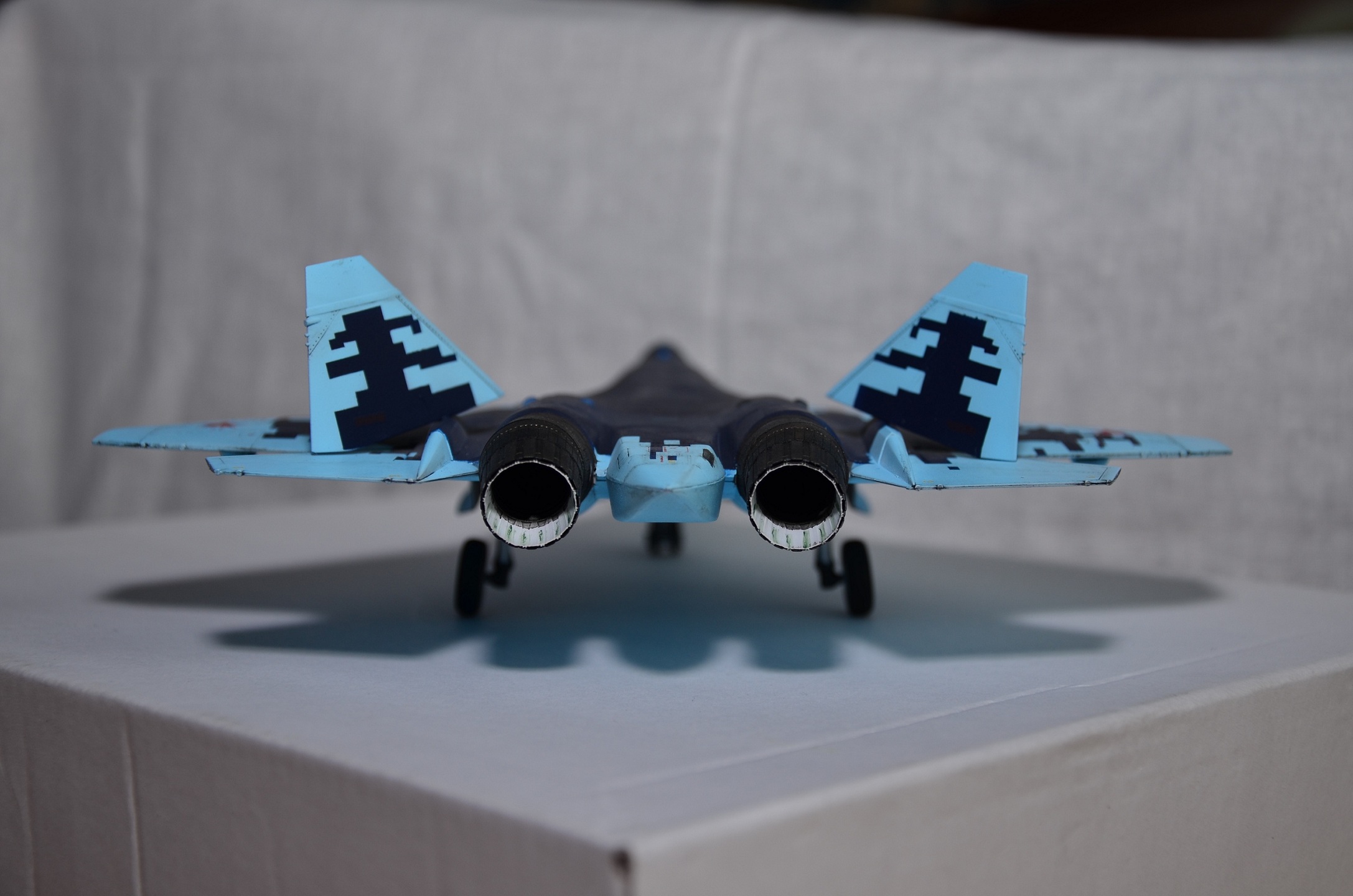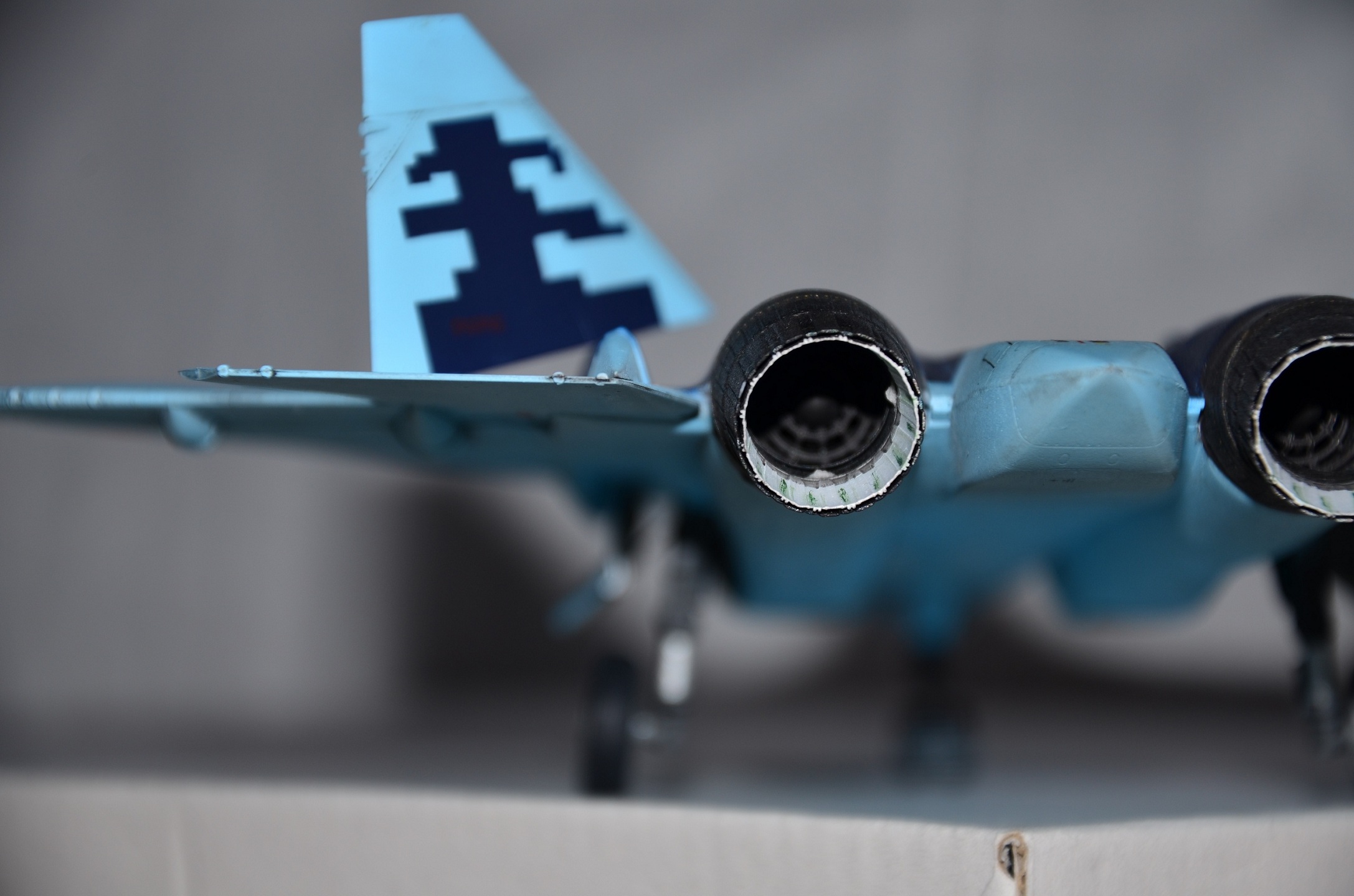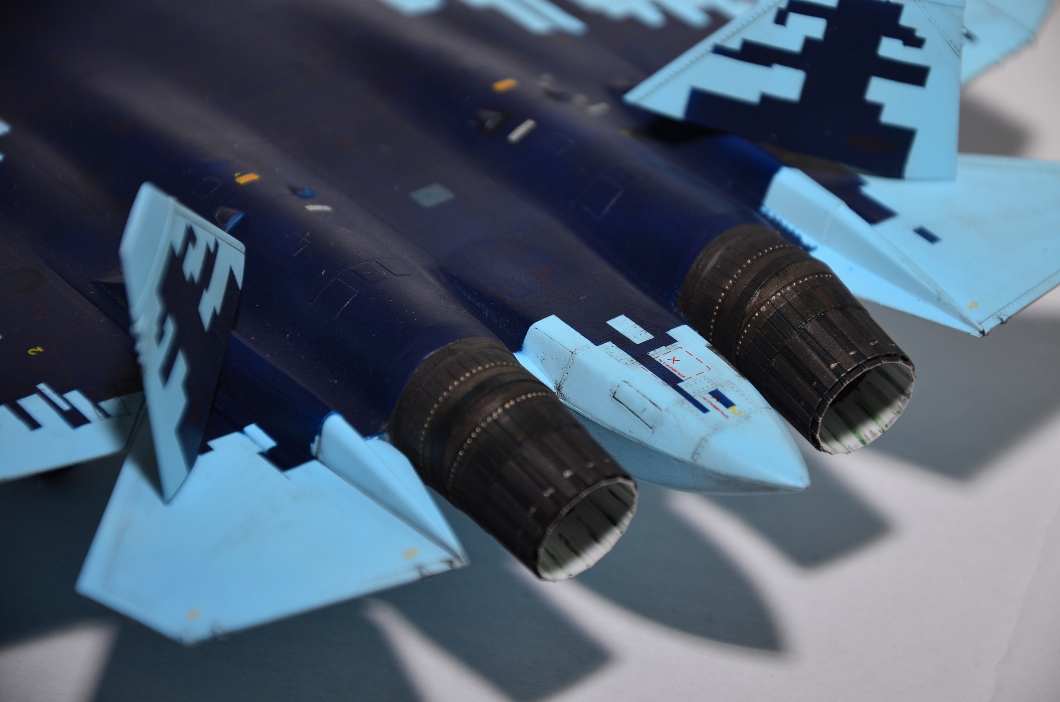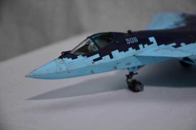 - Не обратил особого внимания изначально на сопла реального самолета, просто не понравились штатные в коробке. Подумал, что можно взять смолу от Су-35. Со смолой имел впервые дело, захотелось попробовать сделать красивые поворотные сопла. Когда пришли детали - выяснил, что двигатели на ПАК вообще иные и в принципе там не может быть сопел от Су-35...Но уже, почитав интернет, изуродовал "изкоробочные", т.к. диаметр 35 меньше, чем ПАК. В итоге собрал и "присобачил" сопла для АЛ-41Ф1С. О данных соплах отдельно - лично я несколько разочаровался в качестве, одна из частей была овальной и в круг исправить не смог; грел в теплой воде, результат один - как был овал,так и остался. Так и приклеил(виден стык на правом сопле). "Внутренности" остались и остаются невидимыми, если только специально туда не заглядывать с фонарем, но даже при этом не всегда видно,т.к. сопло под углом. В итоге старания по окраске внутрянки сопел - коту под хвост)). Приклеить их к модели также оказалось задачей нетривиальной для меня: хоть и было все зачищено и подогнано изначально, с первого раза правое сопло не приклеилось суперклеем...видимо правое сопло все же прокаженное)).