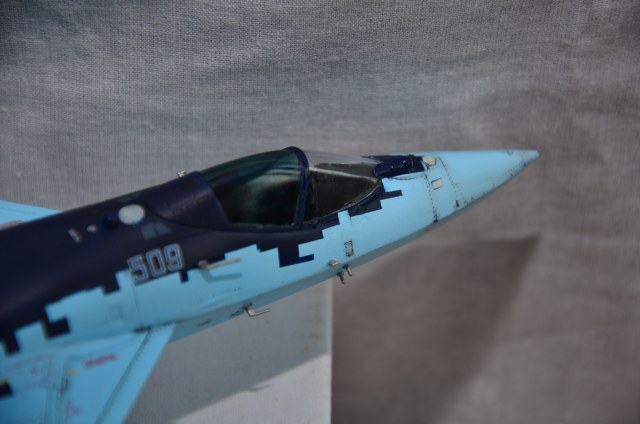 Интересная модель. Сопла понравились. Не понравился фонарь и места стыка половин фюзеляжа, щель на носу надо было зашпатлевать и пошкурить. Колеса не очень аккуратные. Про цвет не говорю, уже все высказались.