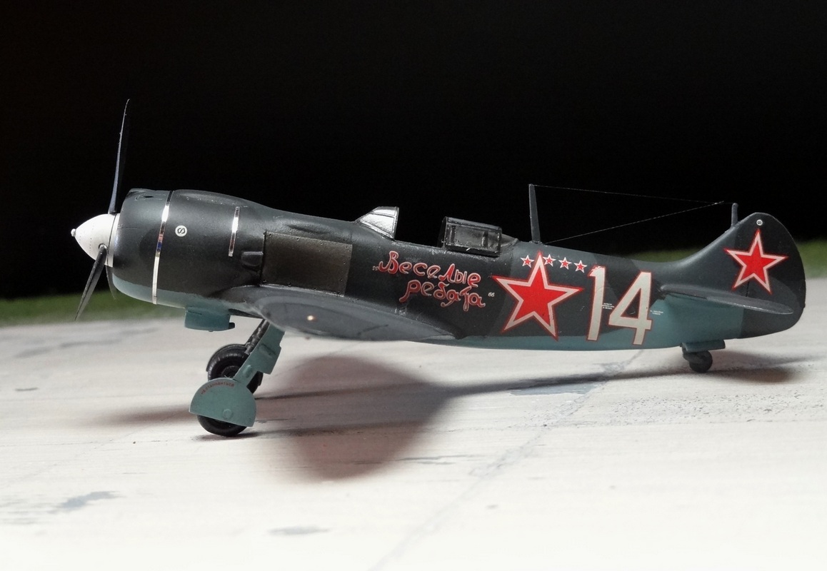 Модель собиралась "изкоробки" с минимумом доработок: БНО, антенна - бантик, стяжная лента, самодельная сдвижная часть фонаря, травление от Gonza. Грунт Tamiya, красили все Аканом, глянцевый лак Future, смывка Mig, финиш матовым лаком Pacific. Модель шла что-то тяжеловато, результатом не очень довольны.