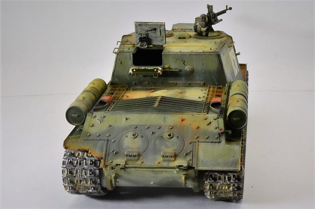 Неплохо, хоть и есть ошибки по матчасти. Но по сборке бросаются в глаза дыры от неустановленных фиксаторов буксирных крючьев, не зашпаклёван шов на стыке верхней и нижней лобовой плиты, оставлены дыры от неустановленных поручней десанта вдоль бортов, не установлены крюки крепления тросов по походному, деталь крепления буксирных проушин на крыле имеет другую форму -нужно либо удалить её, либо установить проушины.