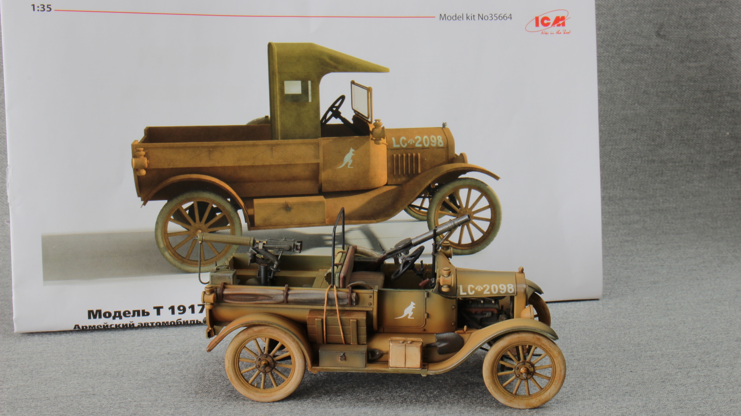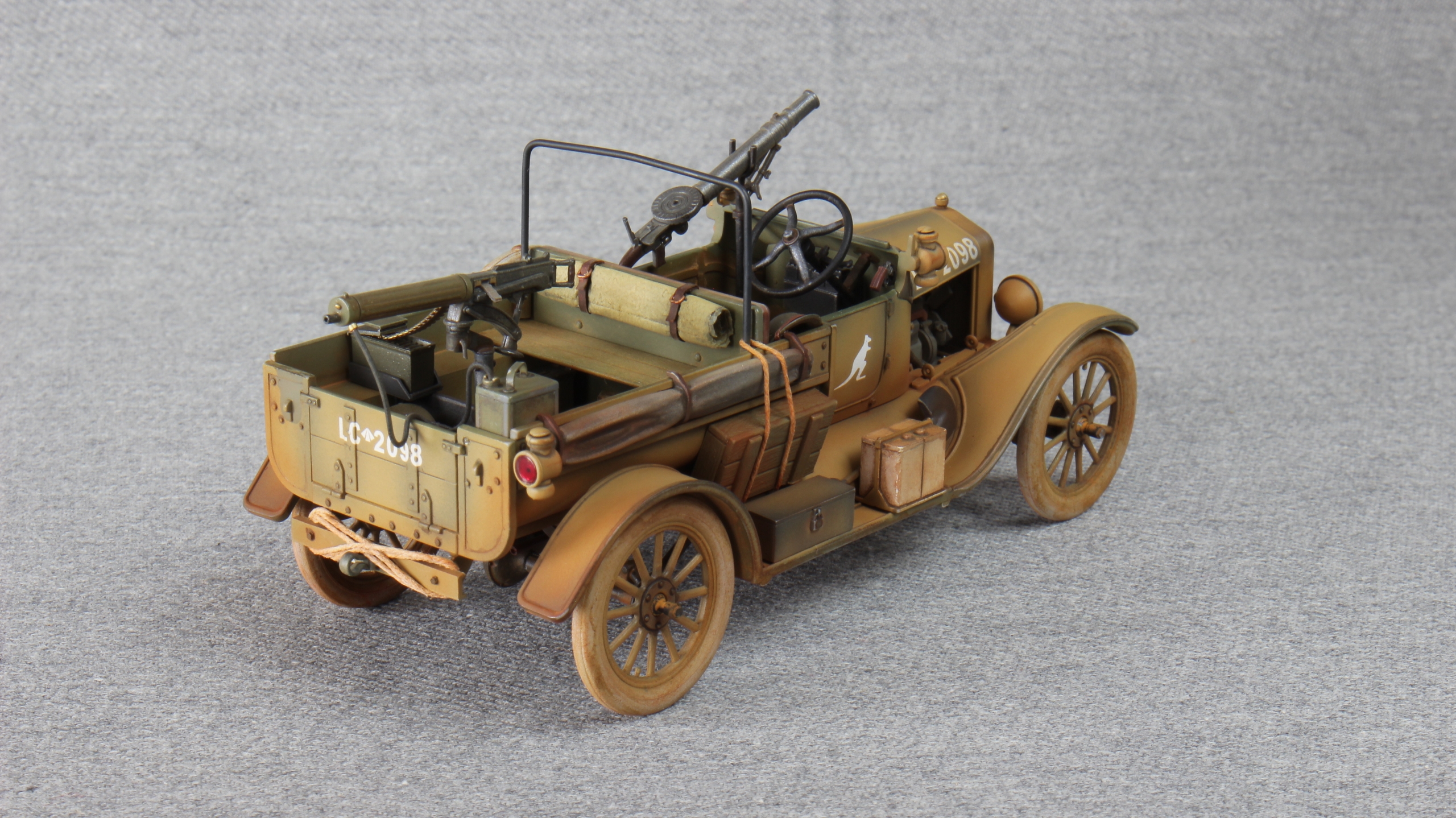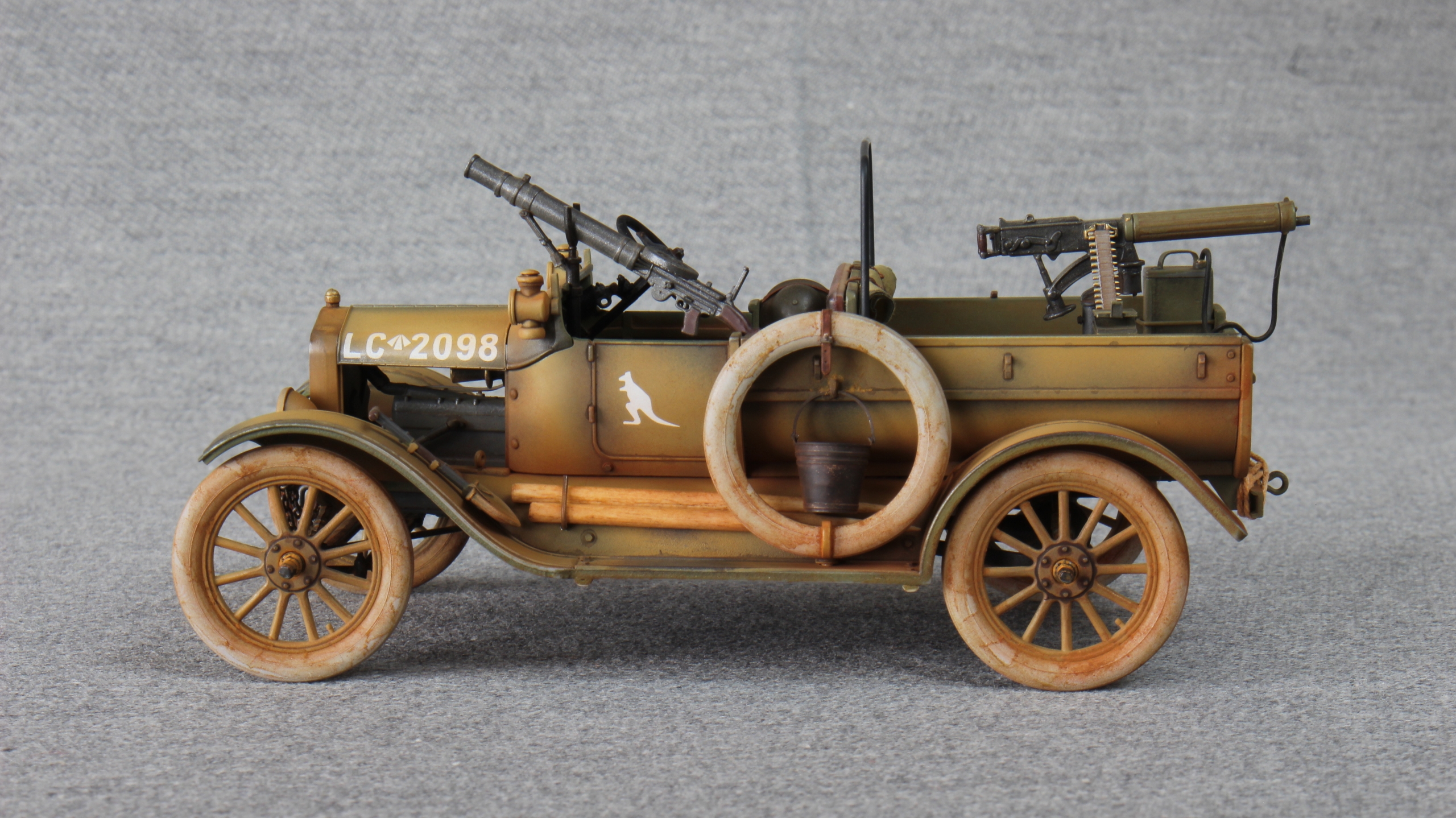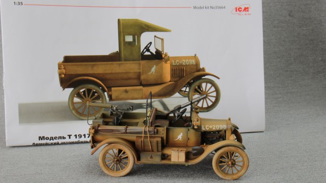Всем привет. Предлагаю просмотреть и оценить данную работу. Модель была подарена племяшом на 23 февраля. Попросил собирать её в месте с ним, (для ознакомления с процессом ) правда хватило его только на пять вечеров, ну а дальше как обычно в одного. Авто такого класса не собирал ни разу, какая-то новизна в этом есть. В принципе деталировка не плохая, двигатель так же комплектный, поэтому прятать его не стал-срезал боковины капота. Добавил только выводы с батарей, в.в.провода , свечи зажигания , топливо провод и шинный насос. Из коробочный вариант меня не устроил. Порывшись в своих закромах решил собрать этакую пустынную тачанку. Крышу и лобовое стекло ставить не стал, сделал дугу, установил в кузове пулемёт Виккерс, а впереди Льюис. Сделал передние буксировочные крючья, повесил цепь, сзади на раму швеллер с проушиной и верёвкой. Накидал кое какого скарба, натыкал болтов и заклёп. Предыстория- 1917г. Австралийская конная дивизия имеет в своём составе автомобили Ford-T , британского филиала, перекрашиваются, доукомлектовываются и готовятся к отправке в Египет (исторический факт), но пока используются на месте, от того и красноватая австралийская пыль. Краски, химия Tamiya, пигменты Zip.