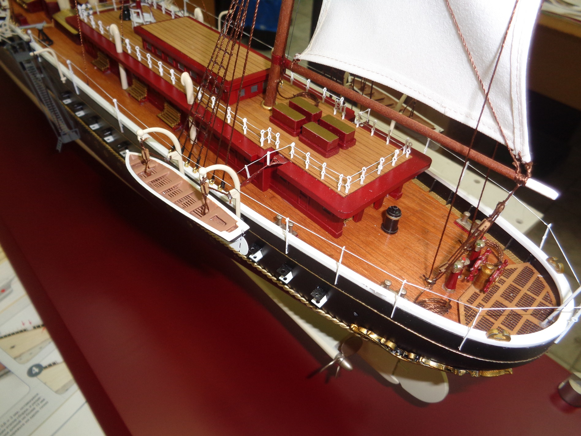 Известная "журналка" от ДеАгостини - вышло уже 117 журналов из 120, так что авторского было бы не много, если бы не запредельно низкое качество журналки. Срок на стройку мне был определён 8 дней, расчет сил - 8 человек, из которых кроме меня ещё один судомоделист, а остальные - по автомобильной технике, по макетам парков развлечений (архитектурные макеты), и вообще неофиты. Работал по 12-14-16 часов в день - и благодаря моей бригаде, СДЕЛАЛИ в срок ! Модель предназначена для музея Николая Второго в Питере, так что я решил её стилизовать под модели из ЦВММ - кроме совсем уж неестественных деталей вроде серебряных люков портов. Корявое дерево от ДеАгостини почти везде заменил лазерной резкой из оргстекла, паруса пошили сами - штатные резаны лазером и обгорели, и огромное количество мелочи от журналки тоже заменили. Если кто решиться это корявое чудище строить - пишите в личку, всё расскажу. Про прототип: очень кратко, так как Вы наверняка и без меня всё знаете. Яхта построена в Дании, вступила в строй осенью 1896 года. Много раз посещалась членами императорской семьи, был на ней и Вилли - он сделал Ники красивый комплемент: "Ваша яхта так замечательно построена, что я могу побриться глядя на своё отражение на борту !" После революции стояла в отстое, пока в 1927 г. её не переоборудовали в минзаг "Марти", получивший Гвардейский флаг по своим делам в годы Войны. Служила до шестидесятых годов, под именем "Ока". Ещё о модели: сделали иллюминаторы из оргстекла, в шлюпки, вельботы и катера вложили рыбины, купили травло от Микродизайн. Красил подводную часть Мотип Лотос, надводный борт Мотип черный матовый (блестит лучше не надо), дерево - шпон Танганика, лак Тамия. Да, масштаб 1/130.