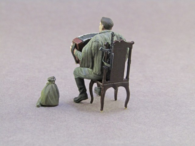 Здравствуйте коллеги, представляю ещё порцию фигурок в 35'м. Данный набор уже мной собирался в 2016 году, но на этот раз покачественнее - всё-таки руку поднабил, да и темперой тогда ещё не работал. Роспись как обычно - ПВА темпера по чёрному грунту, акрил, металлическая эмаль (пуговицы, петлички, звёздочки), полуглянцевый лак на коже и аккордеоне, стул покрыт лаком для дерева по коричневому акрилу, грифелем натёрты ппс. Хотелось-бы конечно свои фигурки пристроить на подставки или диорамы, но к сожалению пока времени катастрофически не хватает... Приятного просмотра.