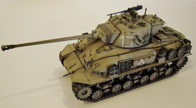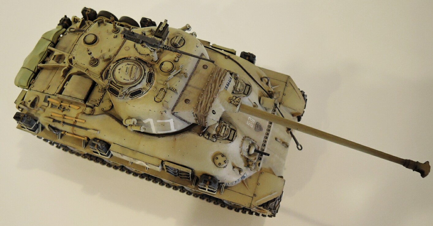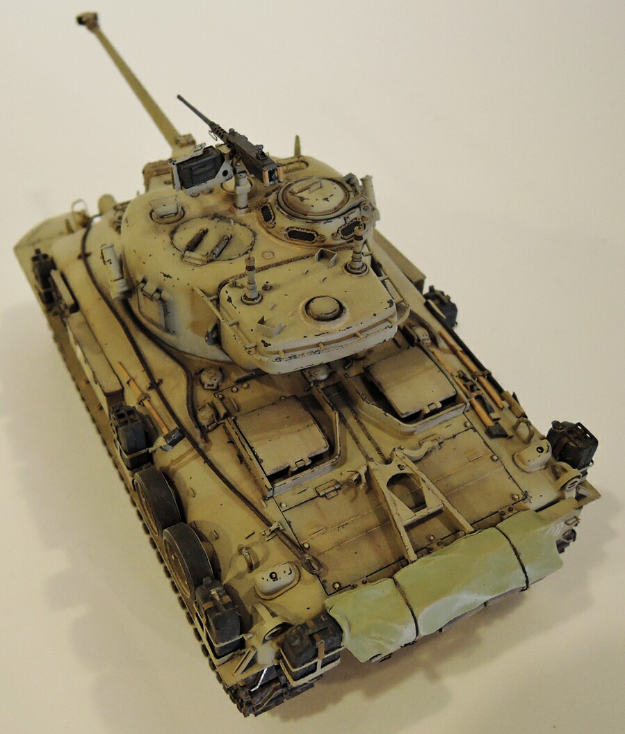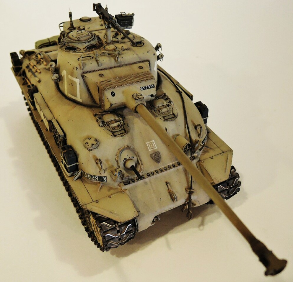Нижняя часть корпуса и верх корпуса от модели М4А1 от дрегон,подвеска от М51,колпак трансмиссии от тамиевского М51,над моторная плита также от М51,нижний кормовой лист из набора М4А1. Башня от DEF model,травление на М51 от АBER,траки Friulmodel. Канистры из запасов.